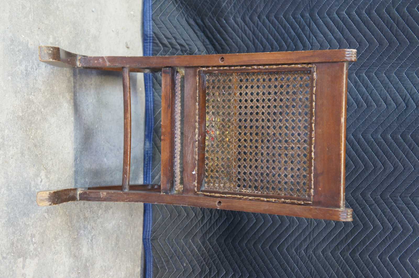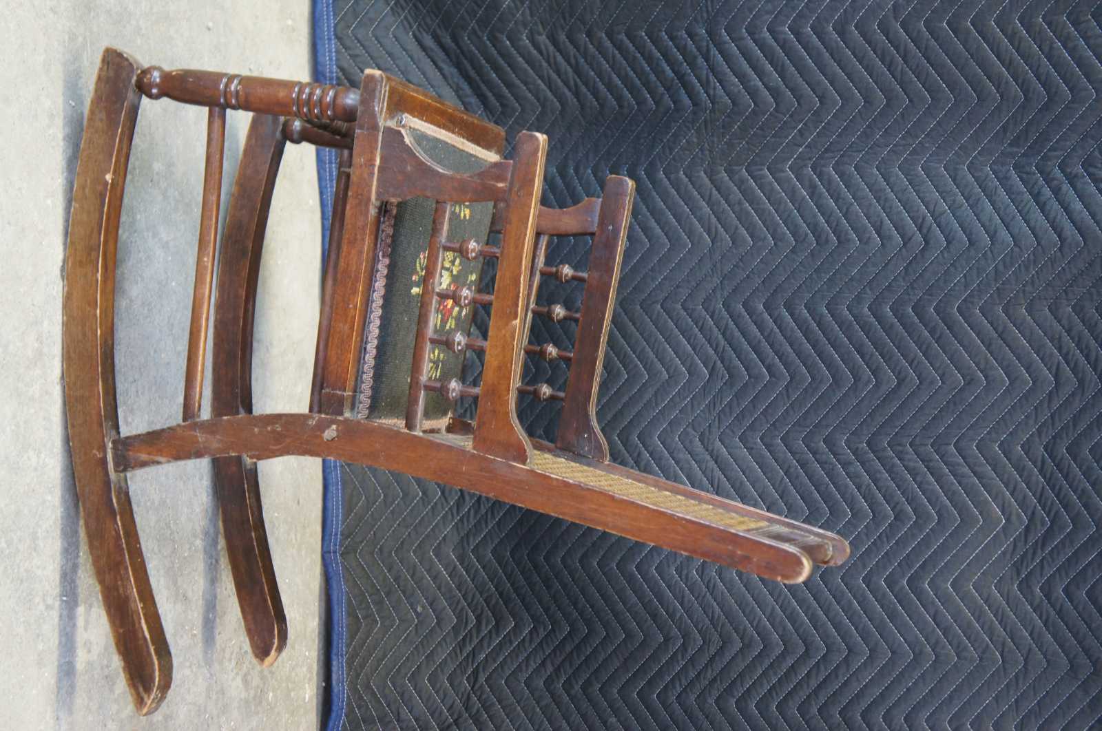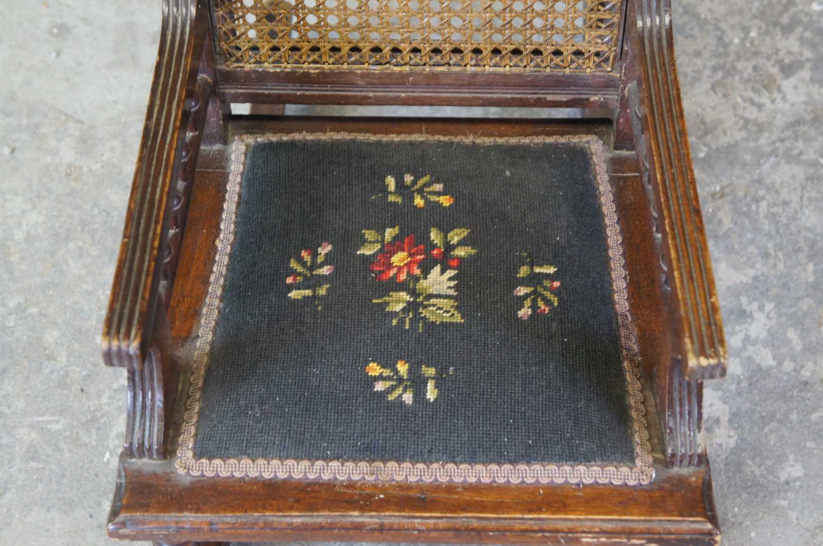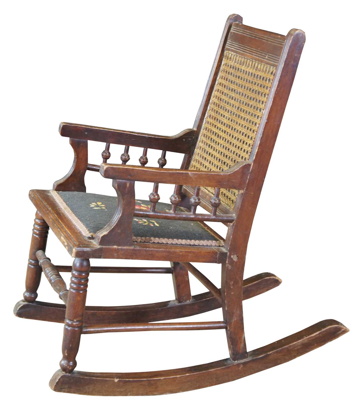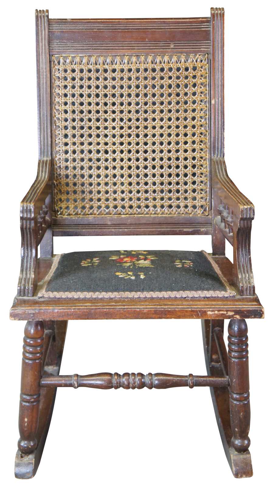 Antique Victorian Eastlake Childs rocker featuring caned and needlepoint design with turned and fluted accents.