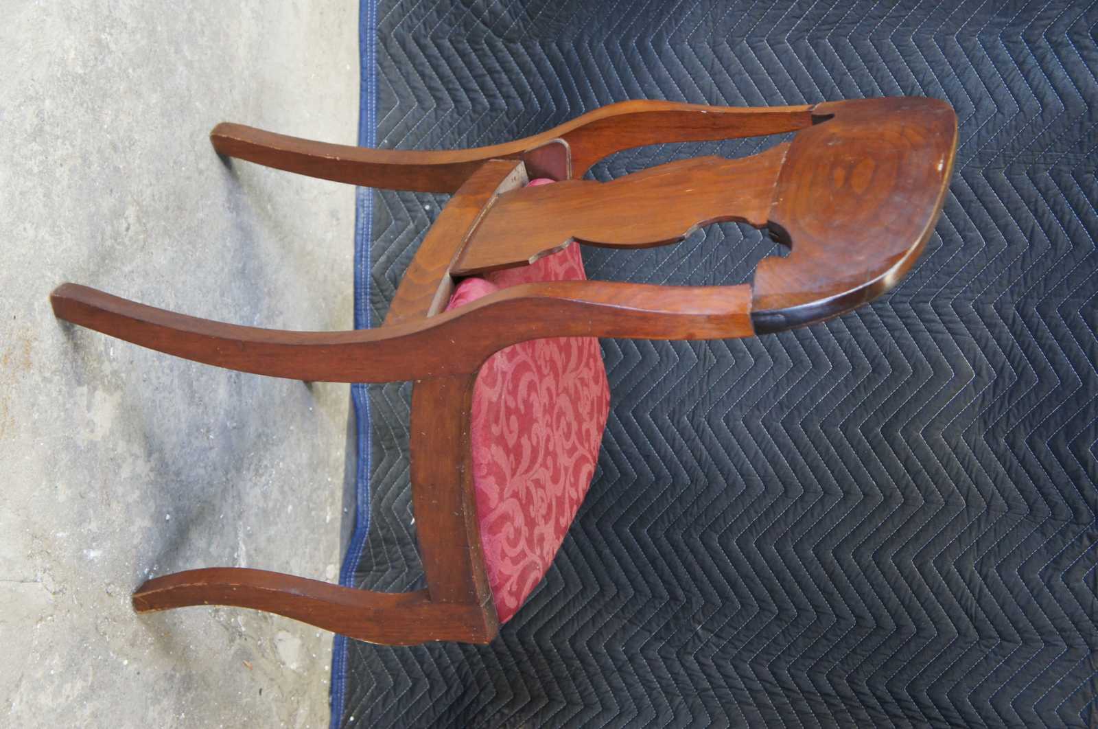 Set of six early 19th century American Empire Period Dining Chairs. Made from crotch mahogany with a smooth rail over scrolled crest and vase shaped splat. Seats feature an upholstered in red with a brocade design.
