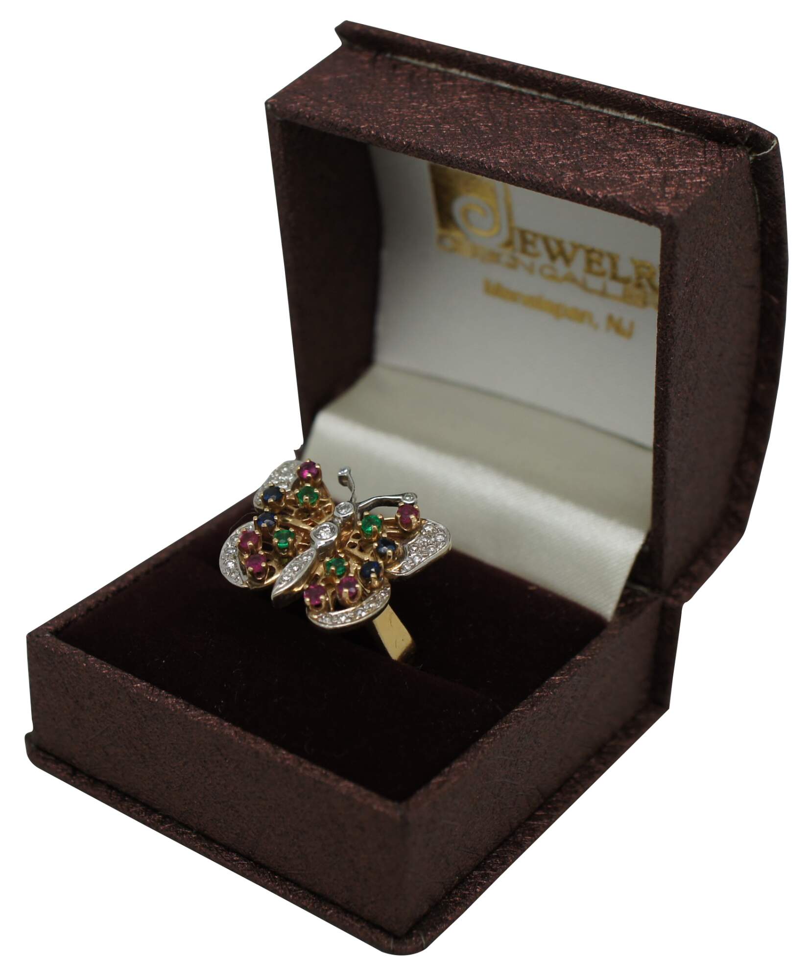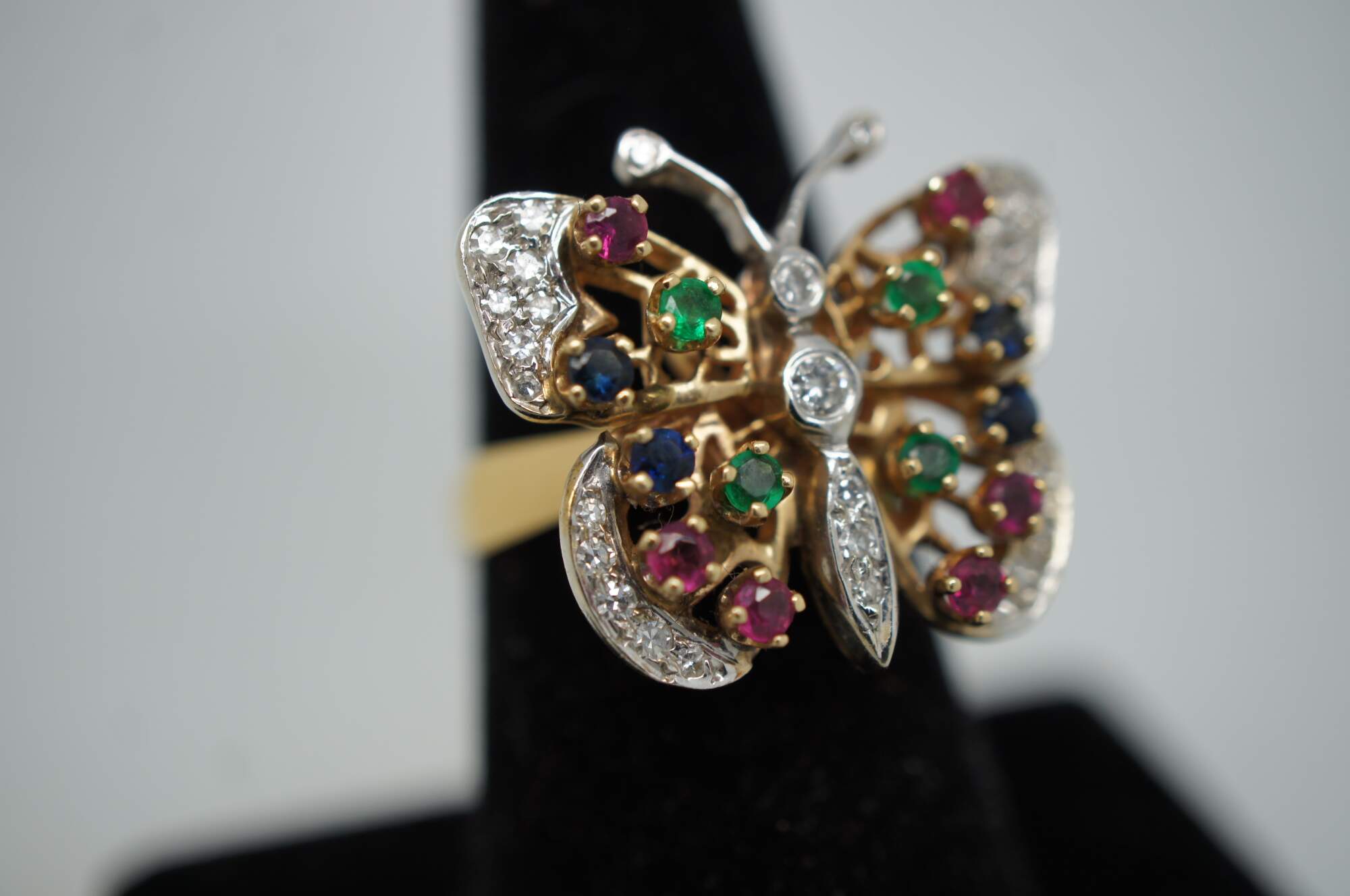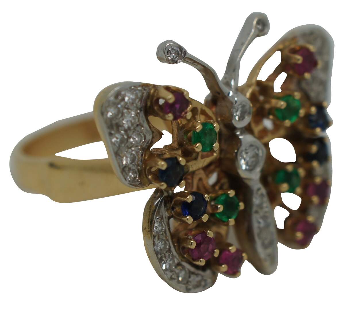 Vintage 1970s/1980s 14k yellow and white gold ring in the shape of a butterfly decorated with diamonds, emeralds, rubies and sapphires.
