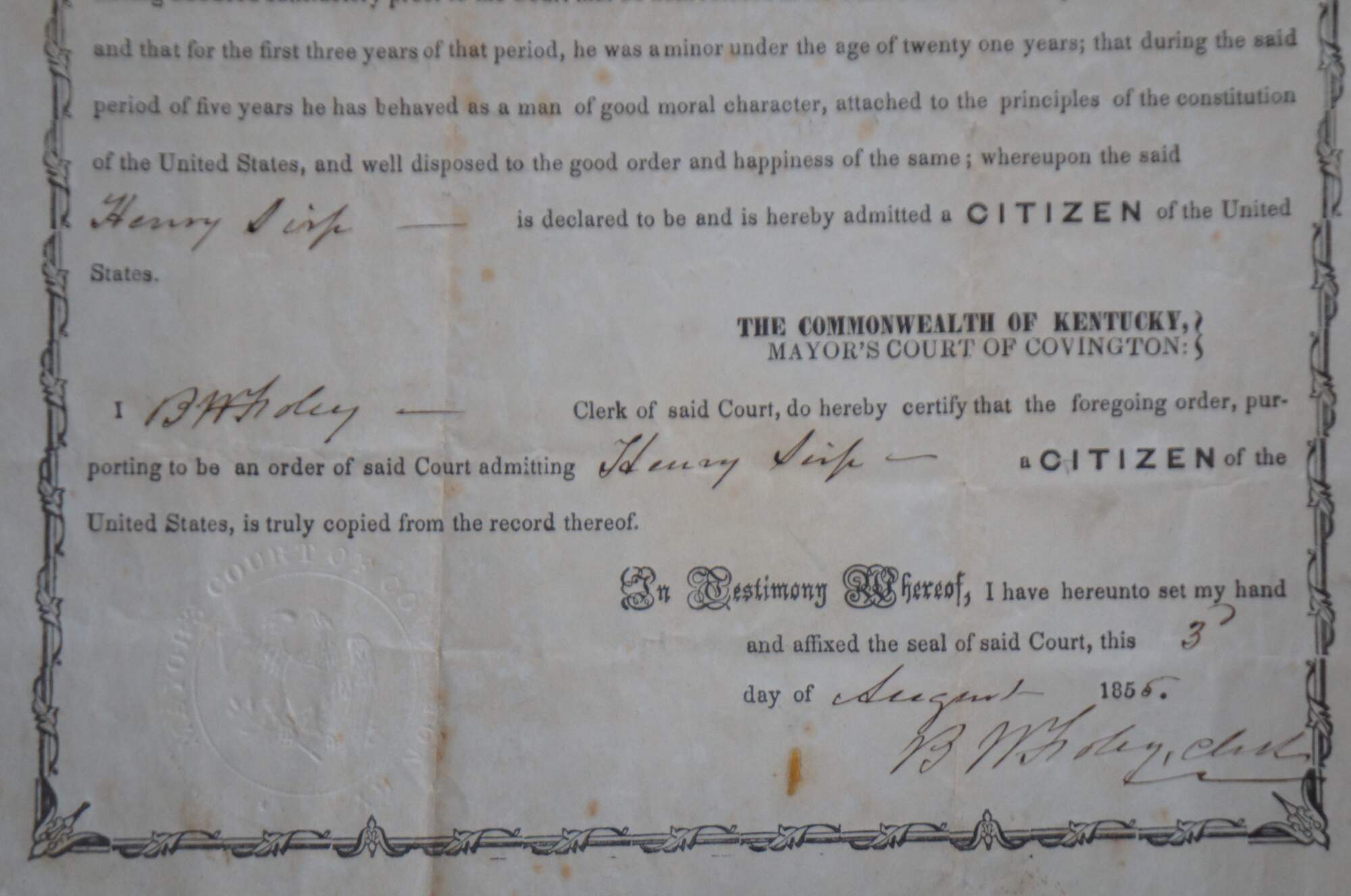 Antique certificate of citizenship / naturalization awarded in 1855 by the Mayor’s Court of Covington, Kentucky to a Mr. Henry who came to America from Germany in 1835.