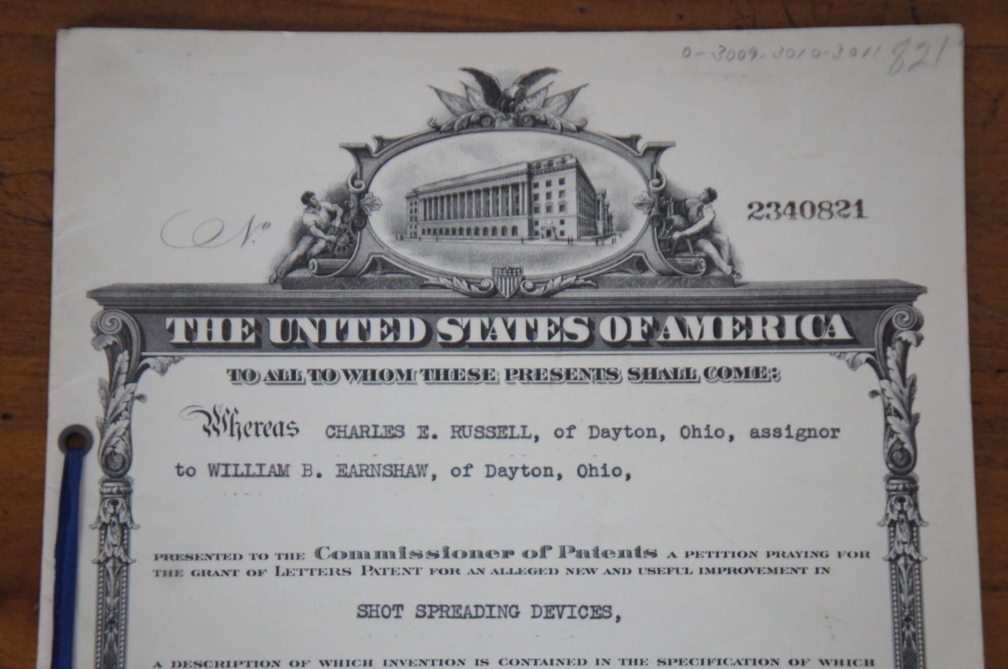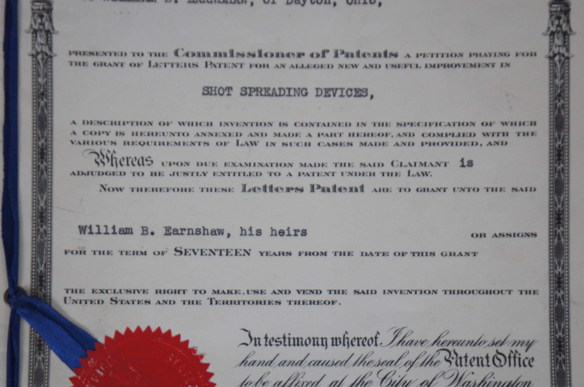 Antique 1944 patent for Shot Spreading Devices for shotguns, designed by Charles E. Russell, assignor to William Earnshaw and his heirs. “William Earnshaw, D.D. (April 12, 1828 – July 7, 1885) was an American minister who served in the Union Army as a chaplain and as the 8th Commander-in-Chief of the Grand Army of the Republic, 1879-1880. Earnshaw was born on April 12, 1828 in Chester, Pennsylvania. Soon after the outbreak of the Civil War, he enlisted April 16, 1861 as a private in the 49th Pennsylvania Infantry and was mustered in as the regiment's chaplain with the rank of captain. Earnshaw resigned his commission on October 12, 1862 when the regiment was consolidated with another regiment. He was appointed a hospital chaplain in the U.S. Volunteers April 22, 1863 and remained in the service until August 27, 1867. With the necessity of creating national cemeteries, Ernshaw was superintendent of the construction of Stones River National Cemetery and Nashville National Cemetery. He was elected chaplain of the National Military Home in Dayton, Ohio on September 5, 1867 and held the post until illness forced him to retire. Earnshaw was Commander of the Ohio Department, Grand Army of the Republic in 1876, Junior Vice-Commander in 1877, and presided at the national encampment of the G.A.R. in Albany, New York in 1879, when he was elected to serve as the national organization's 8th Commander-in-Chief. He died July 7, 1885 in Dayton, Ohio and is buried there in Woodland Cemetery and Arboretum.”