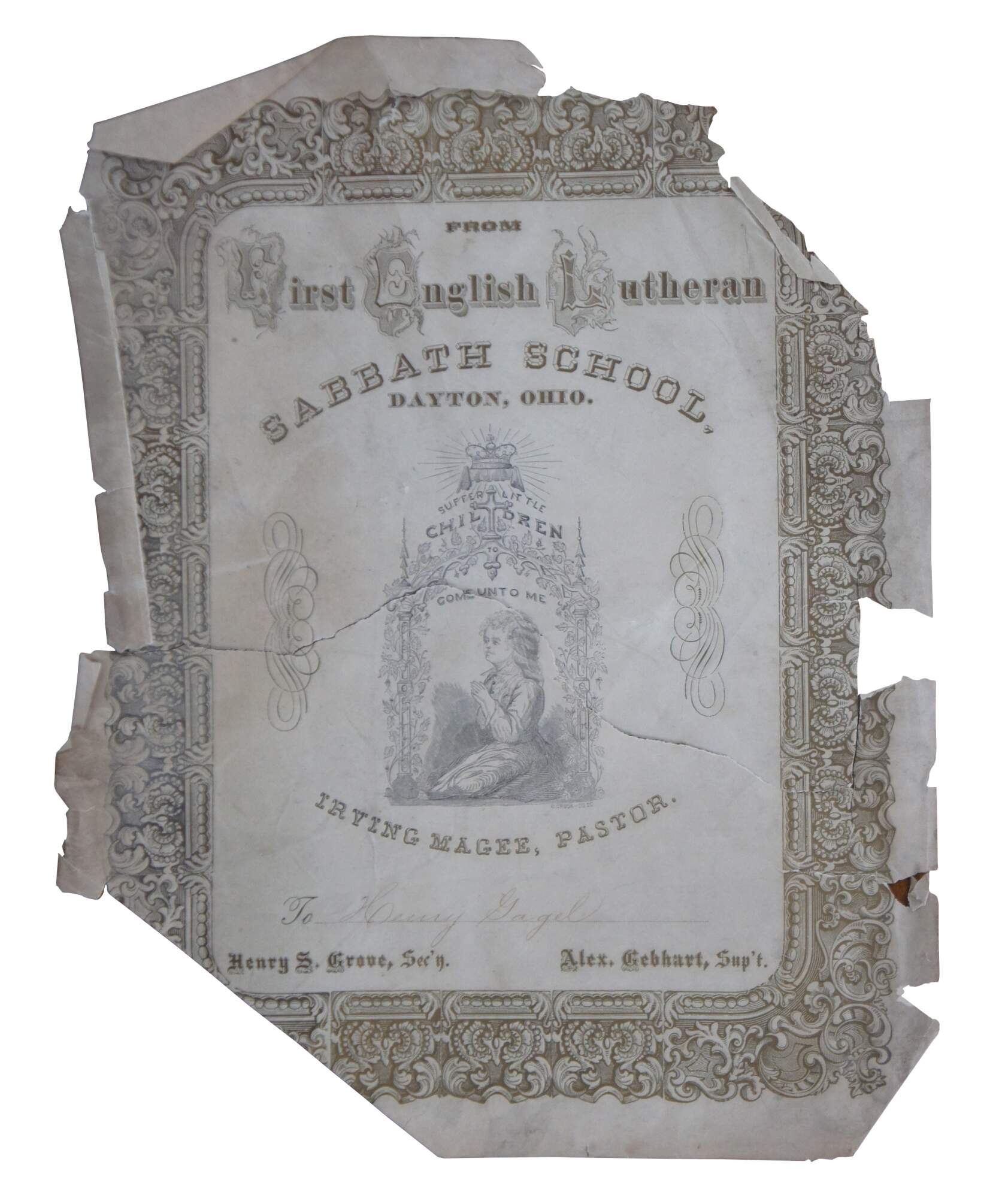 Pair of antique 19th century certificates from the First English Lutheran Sabbath School of Dayton, Ohio.