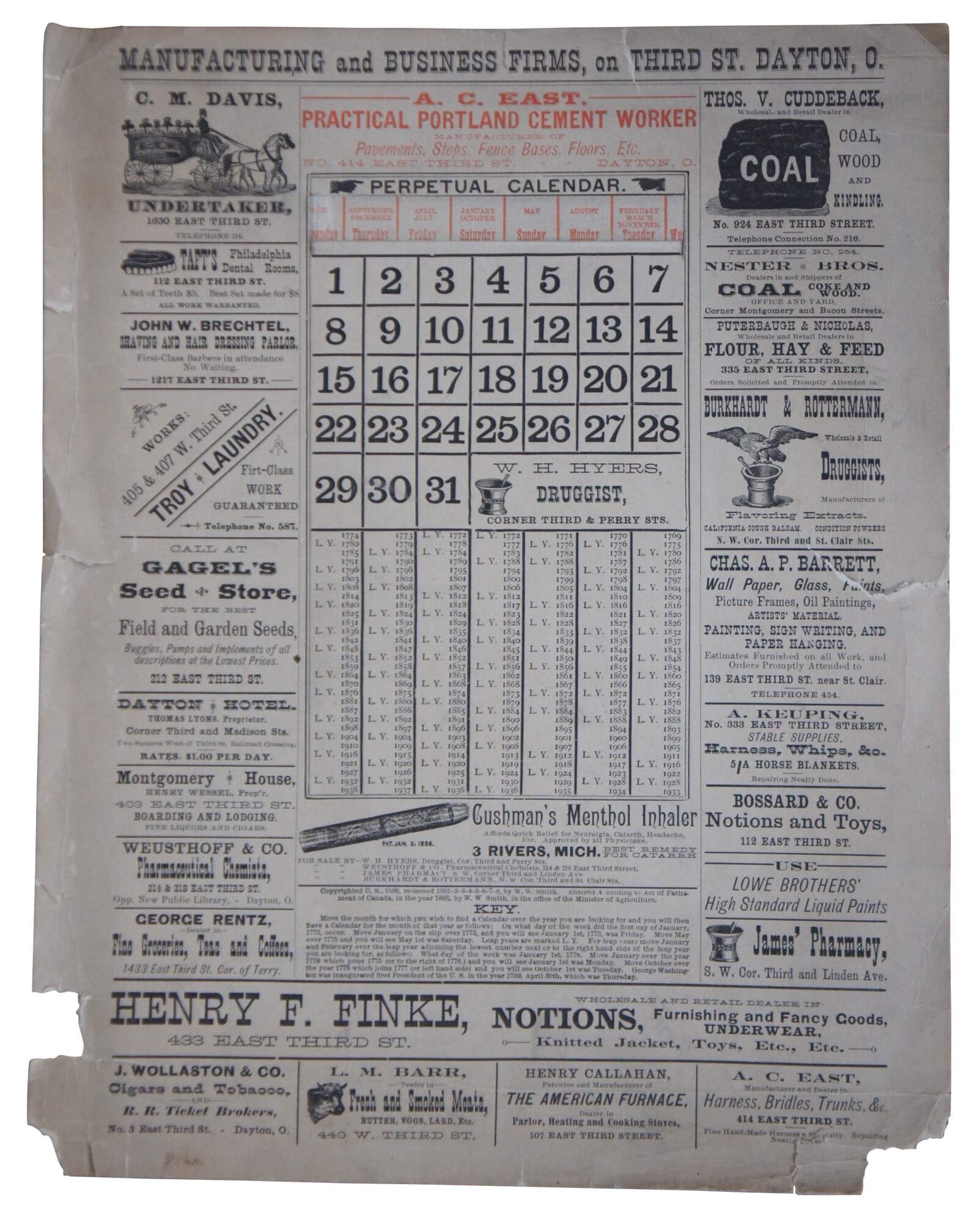 Good Antique Condition - Yellowing/some dirt; wear to edges/corners; rotating day/month strip torn