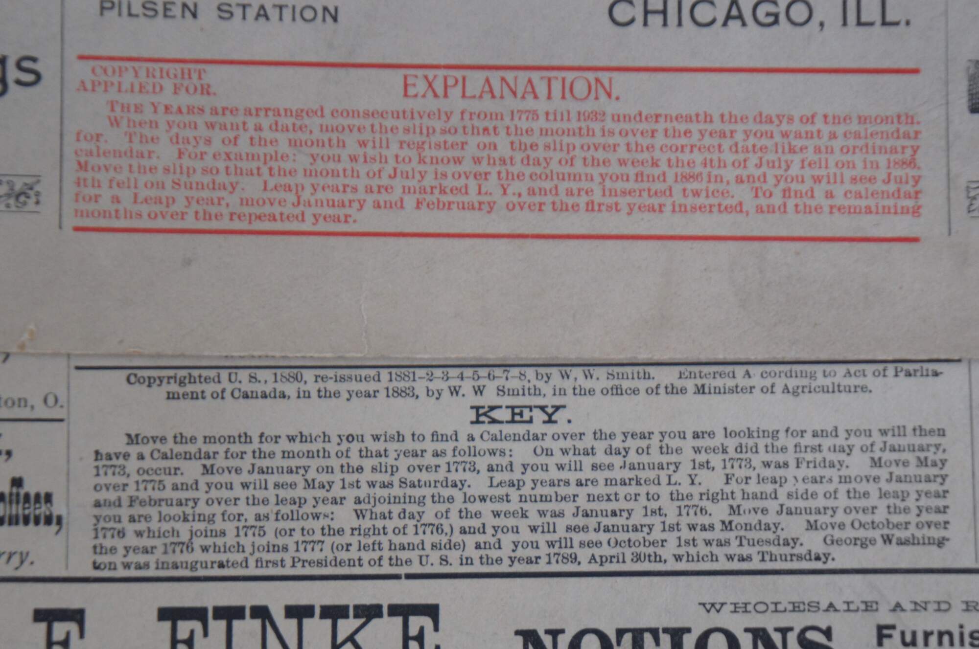 Pair of antique print advertisements featuring paper slip operated perpetual calendars.