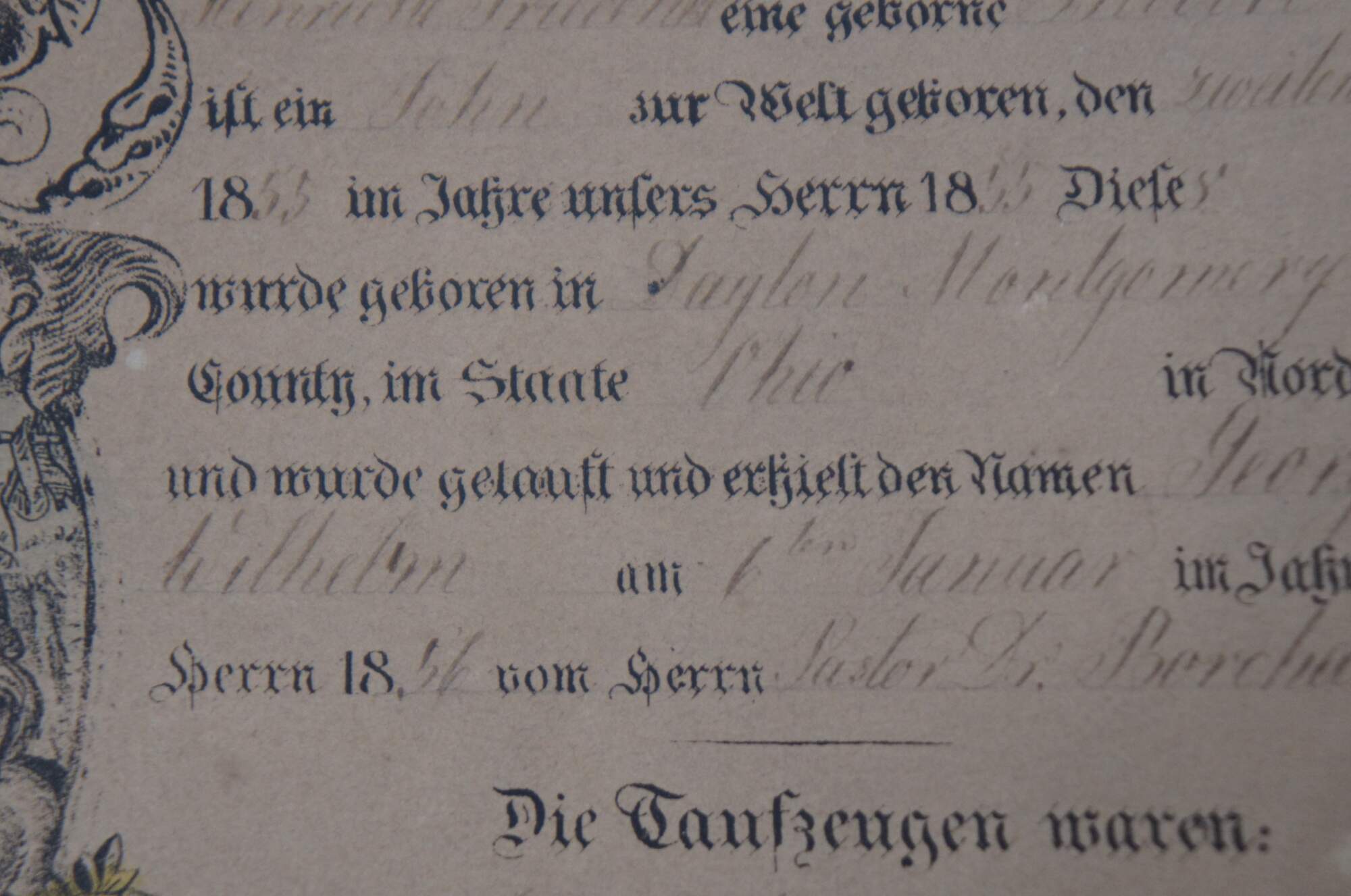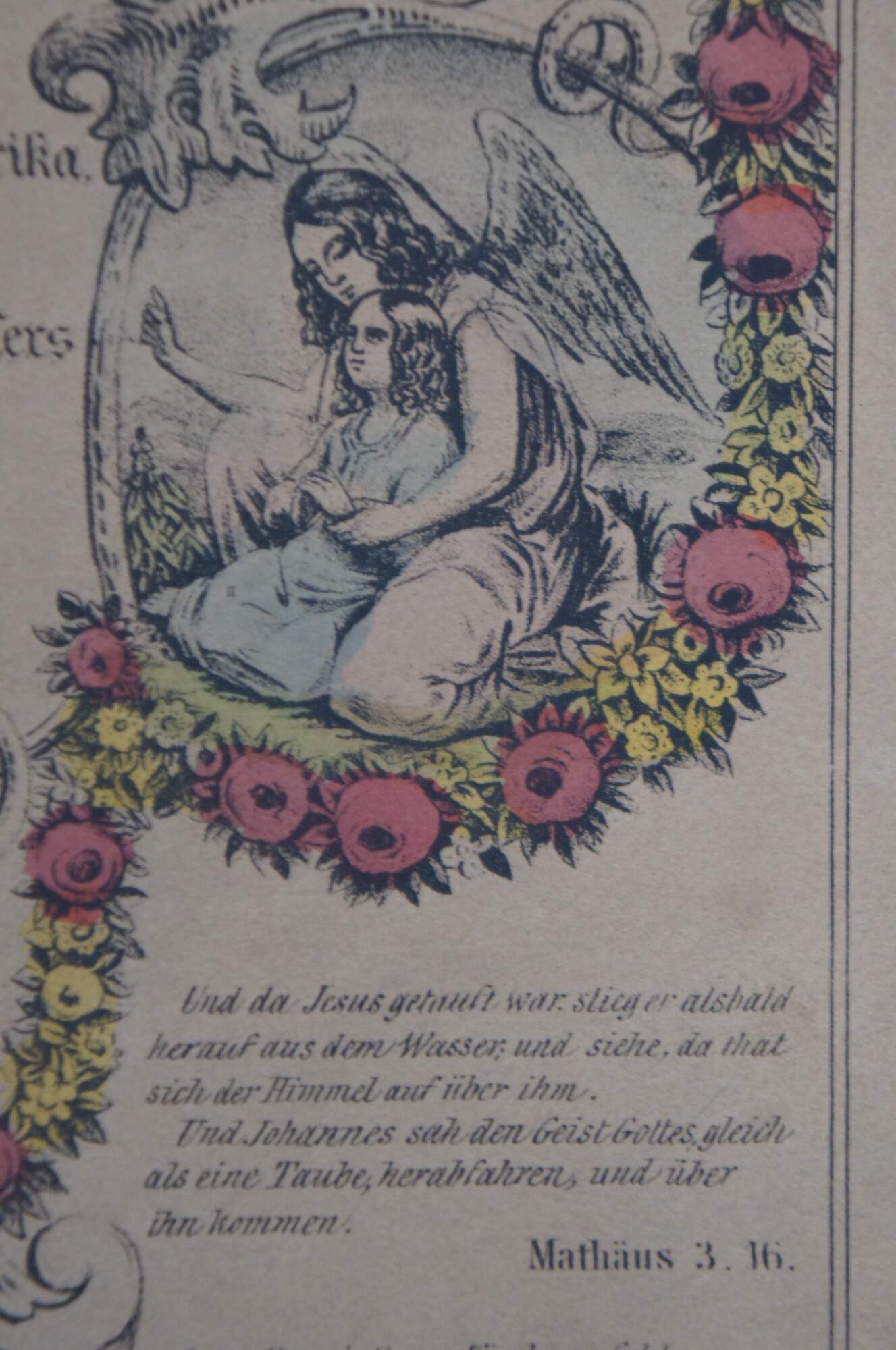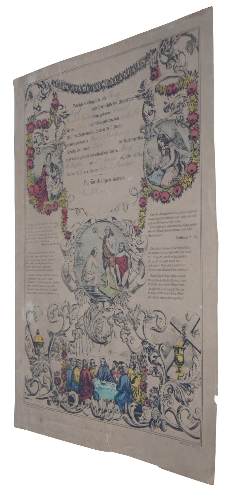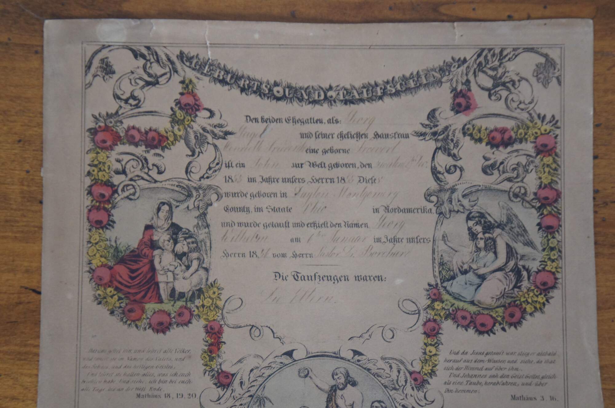 Antique 1856 hand colored lithograph, German fraktur style Birth and Baptism certificate, printed by Currier & Ives.