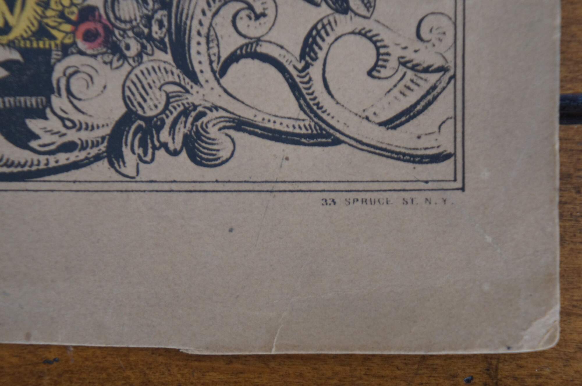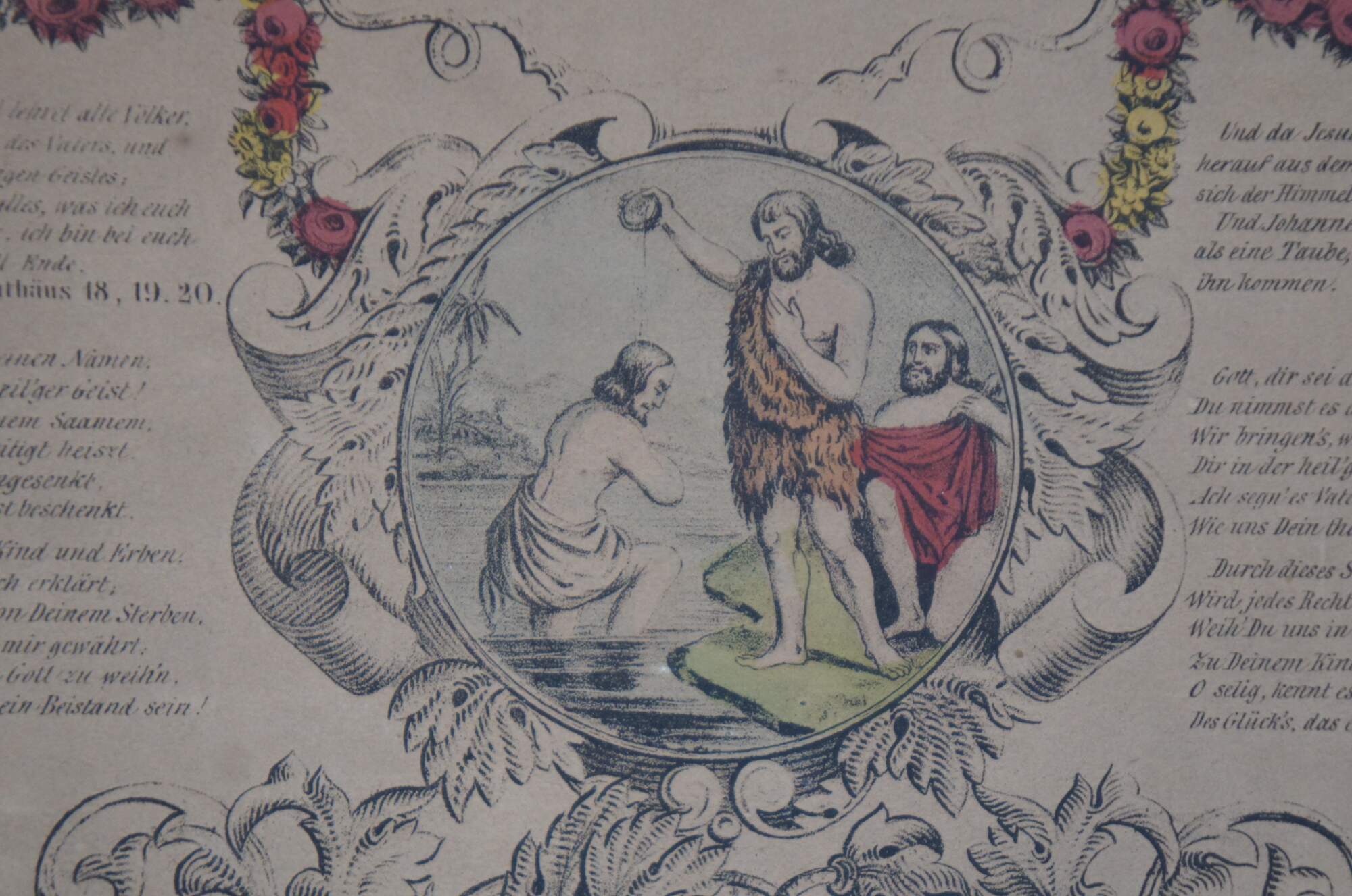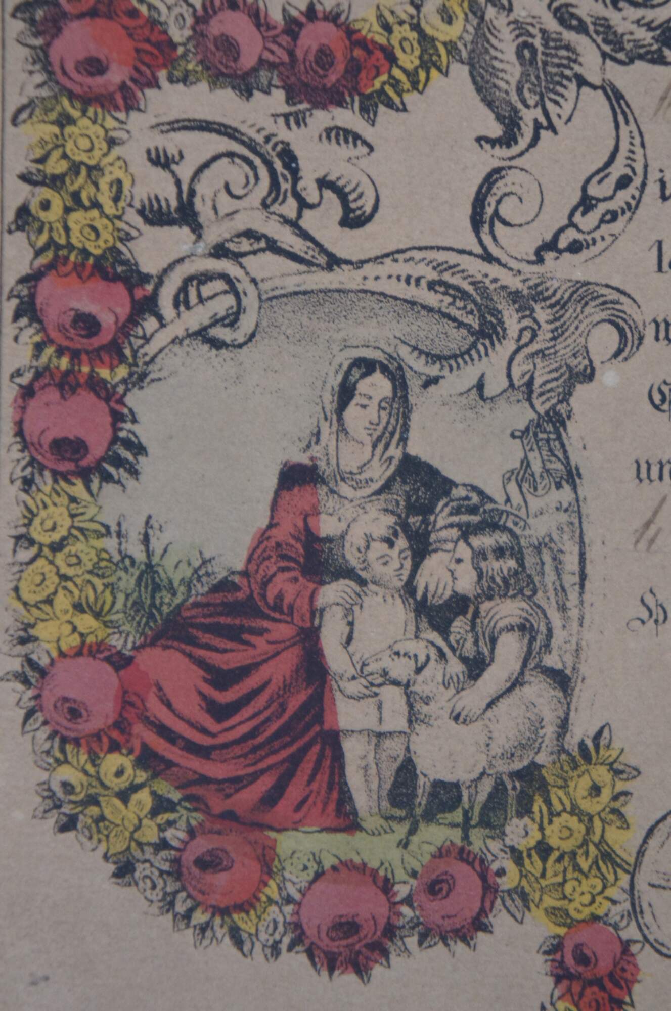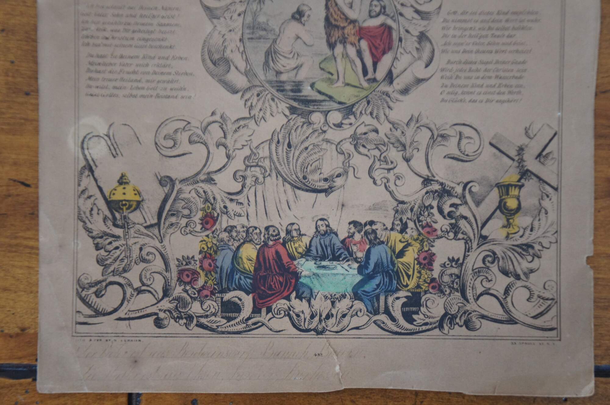 Antique 1856 hand colored lithograph, German fraktur style Birth and Baptism certificate, printed by Currier & Ives.