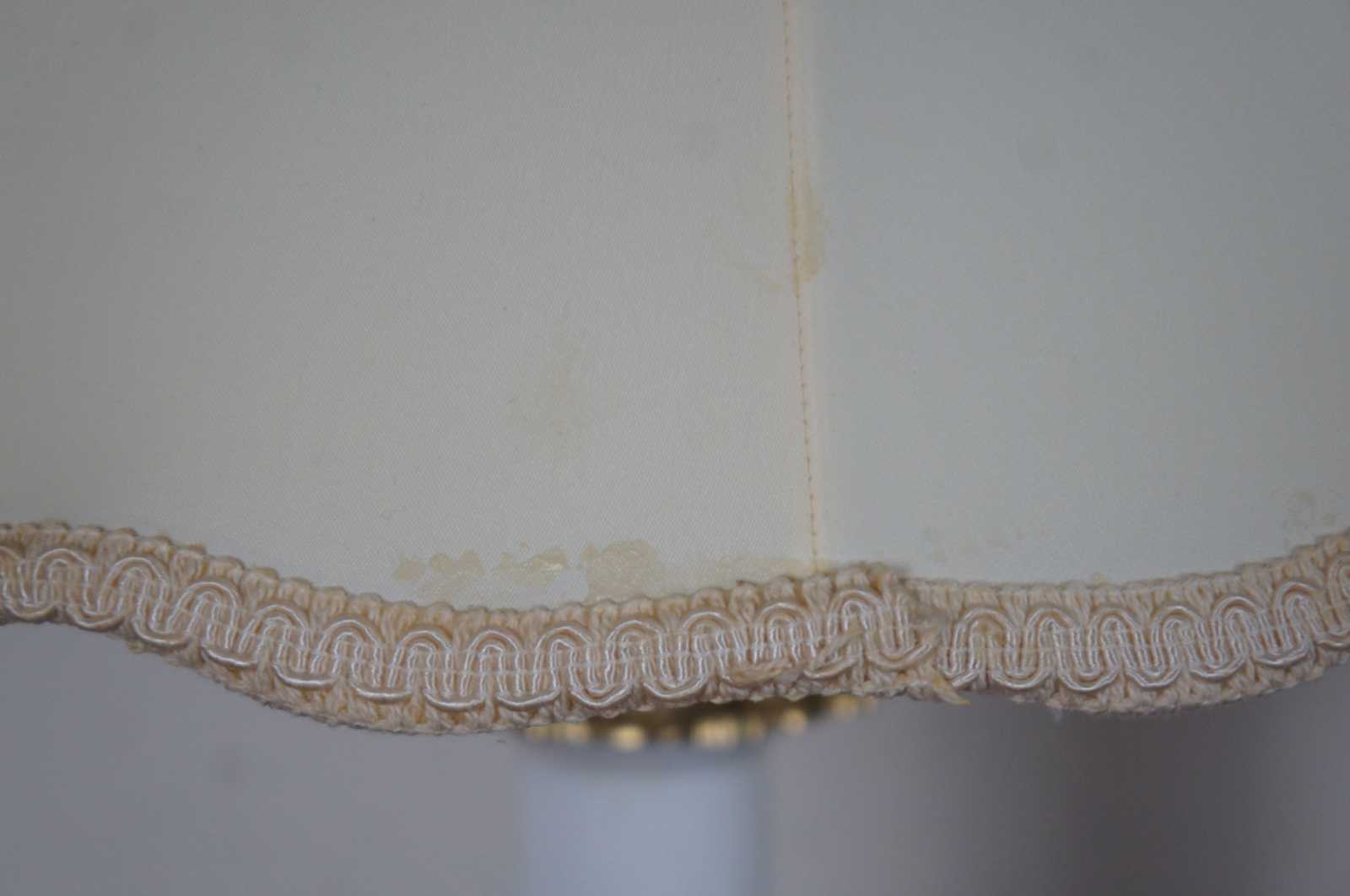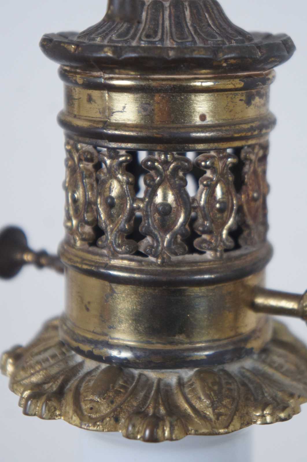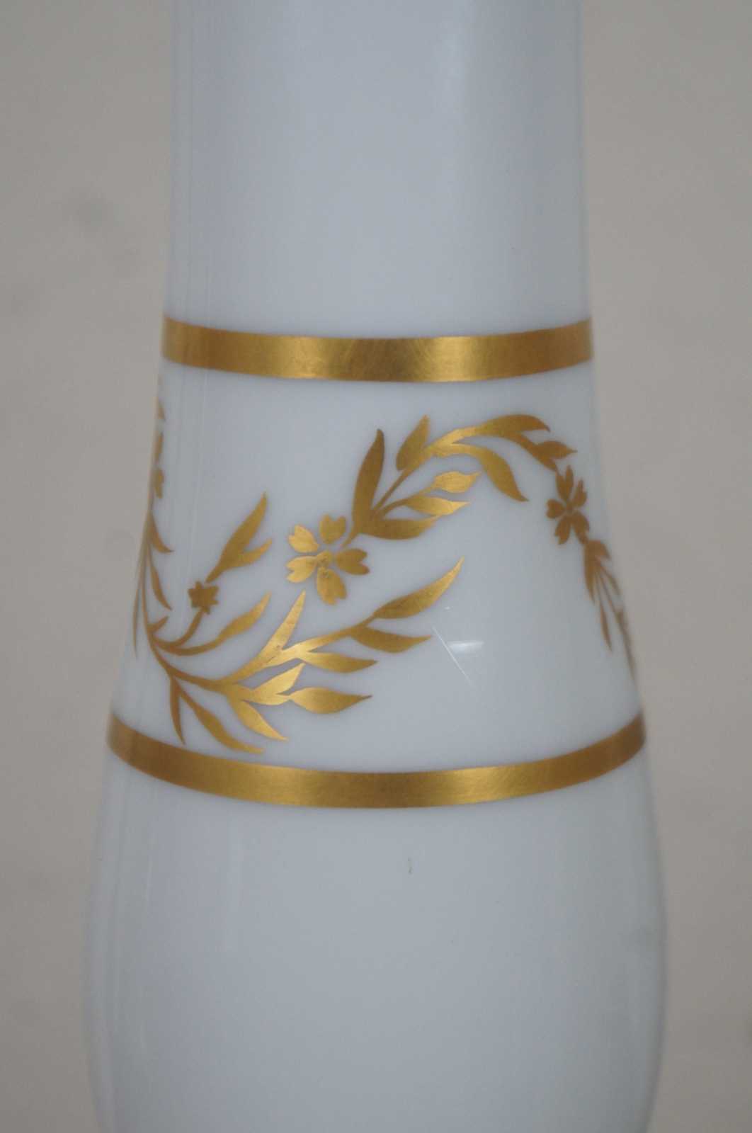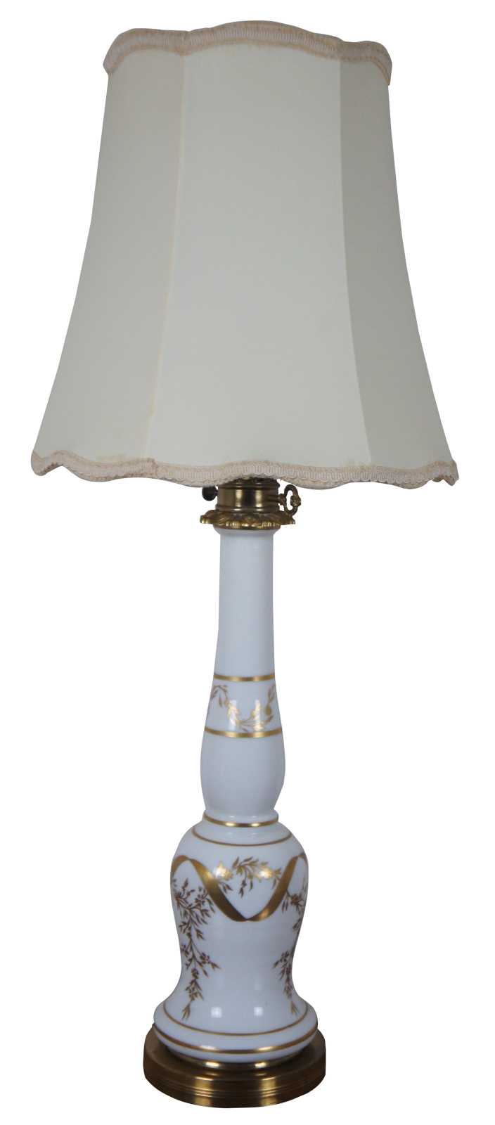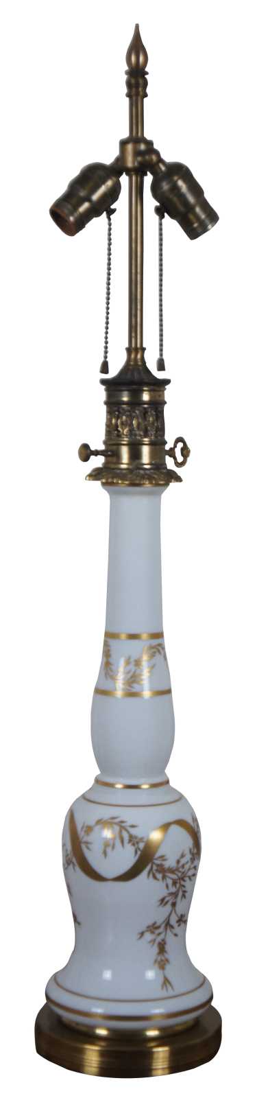 Pair of mid century two light white milk glass table lamps with French styling, painted gold floral, ribbon, wreath and swag designs, brass base and oil lamp style top with brass key.