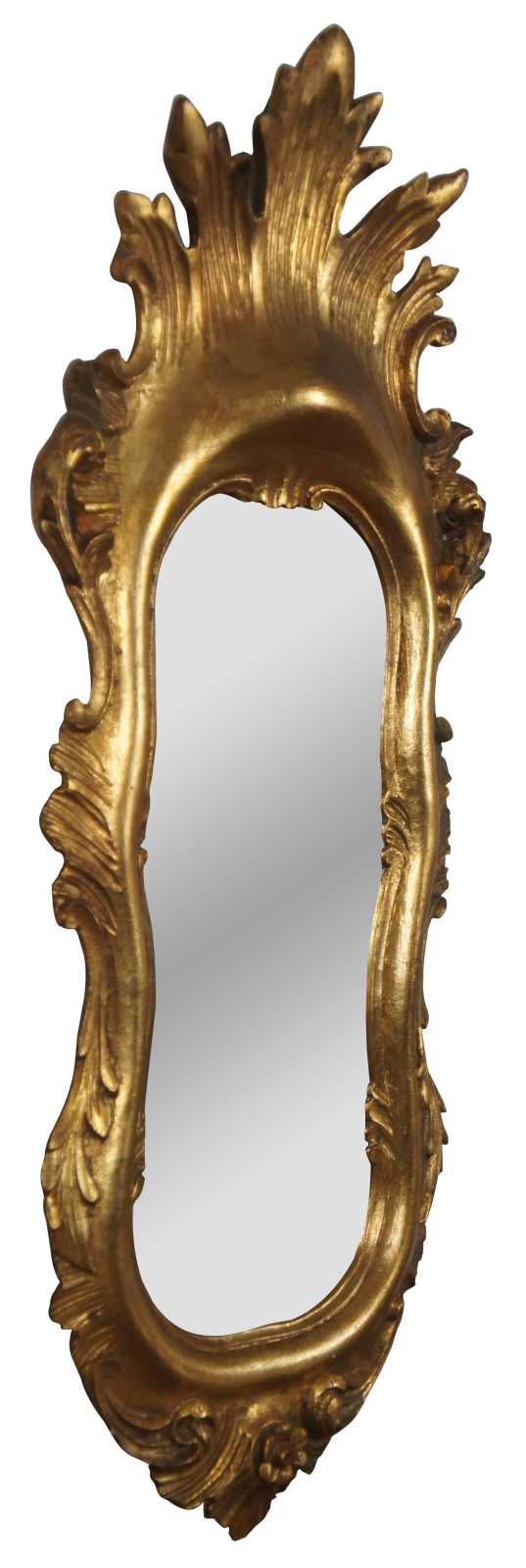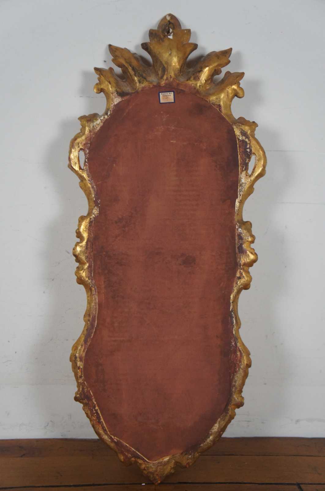 Vintage Italian rococo / baroque / Florentine oval gilt wall vanity mirror by Palmira Art Company, with a motif of scrolling leaves and a splash shape at the crest.
