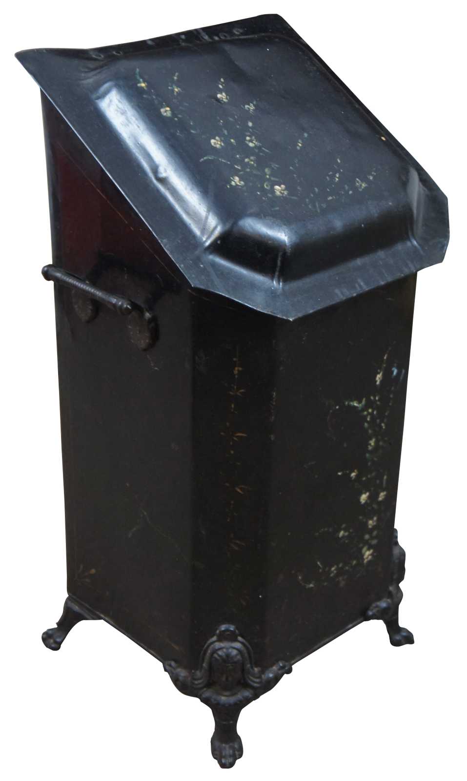 Antique Victorian toleware coal scuttle, painted black with a delicate design of small white flowers, twisted handles, paw feet on the back and Neoclassical / Egyptian Revival sphinx head and feet on the front.