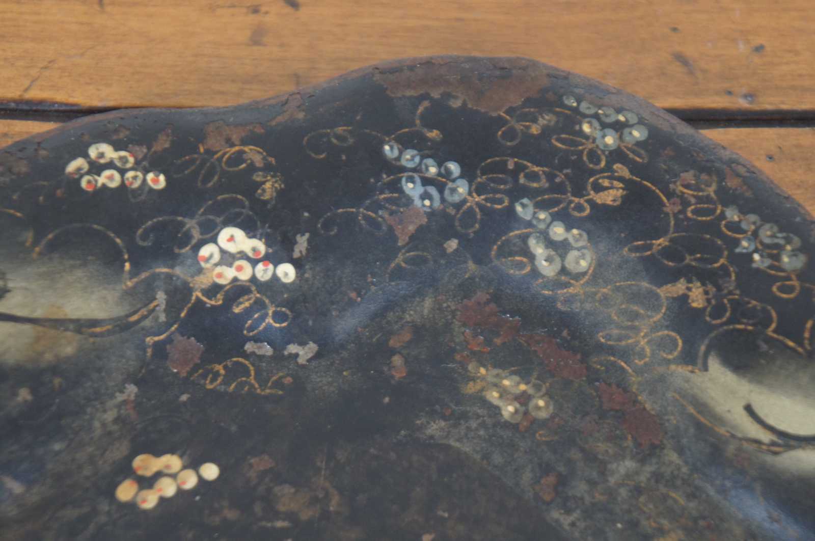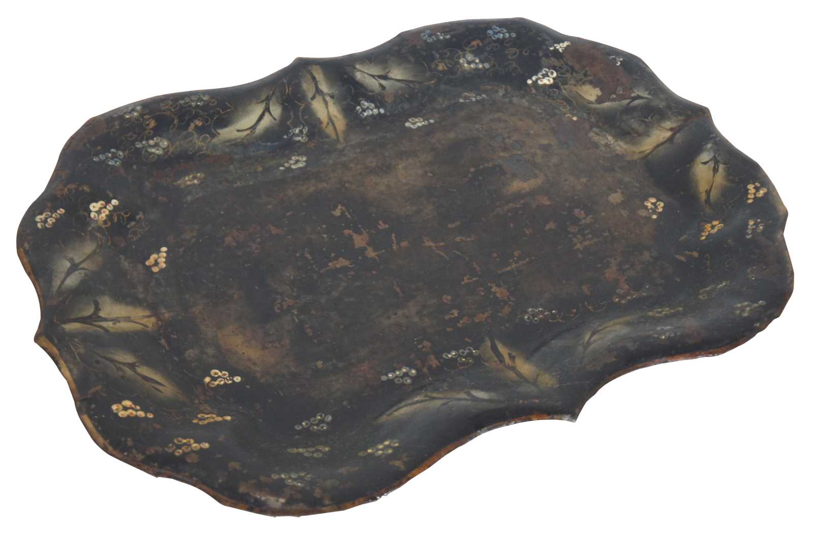 Antique scalloped metal toleware tray or platter featuring unique painted design of vines / grapes / flowers.