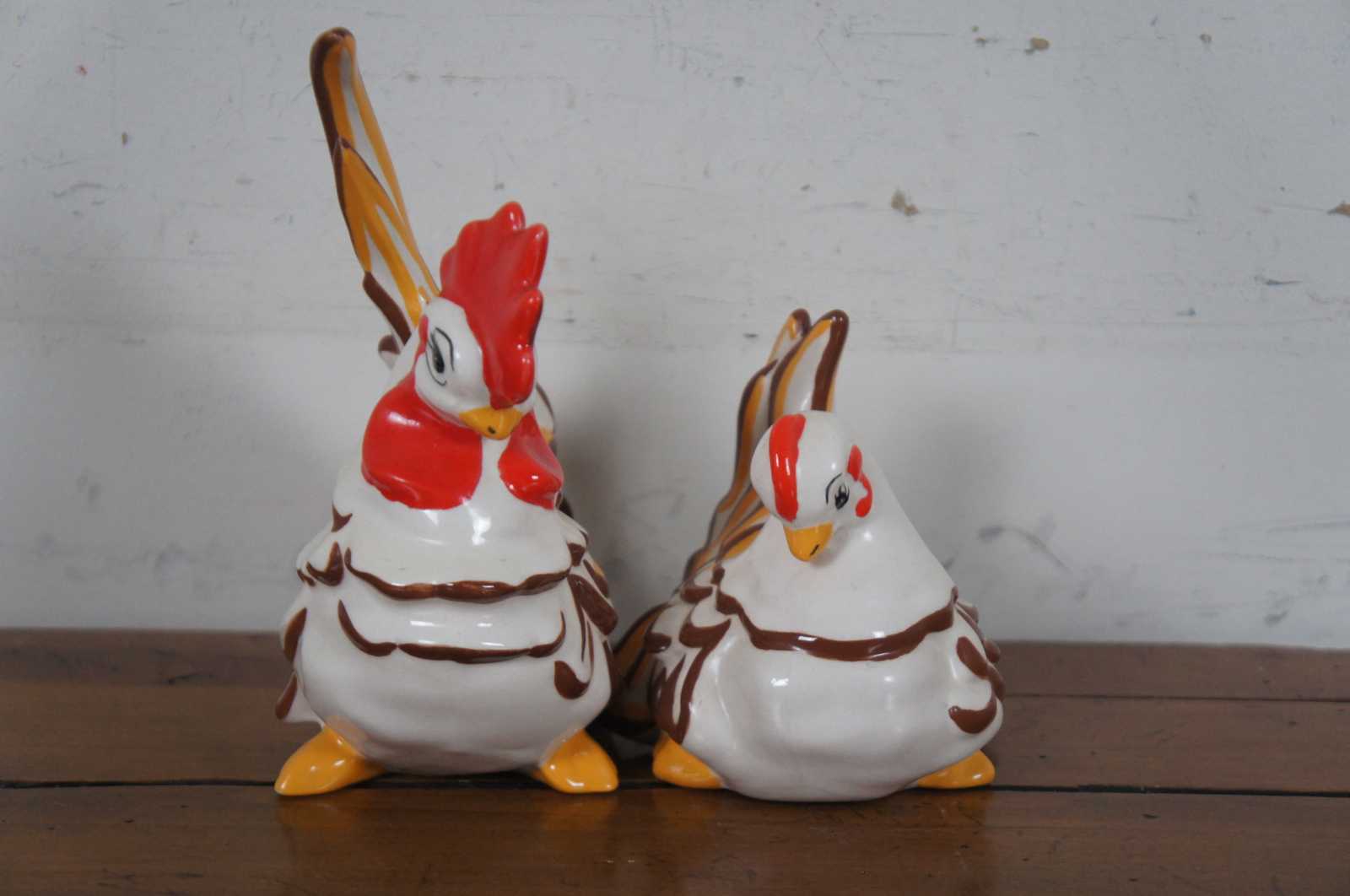 2 Vintage Ceramic Porcelain Hen Rooster Chicken Figurines Country Farmhouse 8"