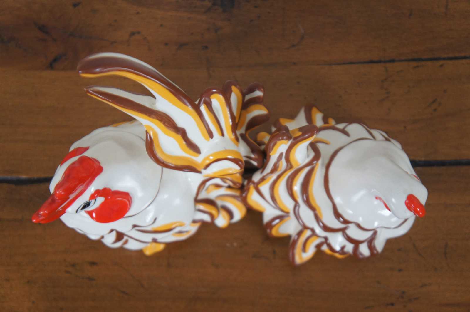 Vintage pair of porcelain chickens painted with red, brown, and yellow accents.