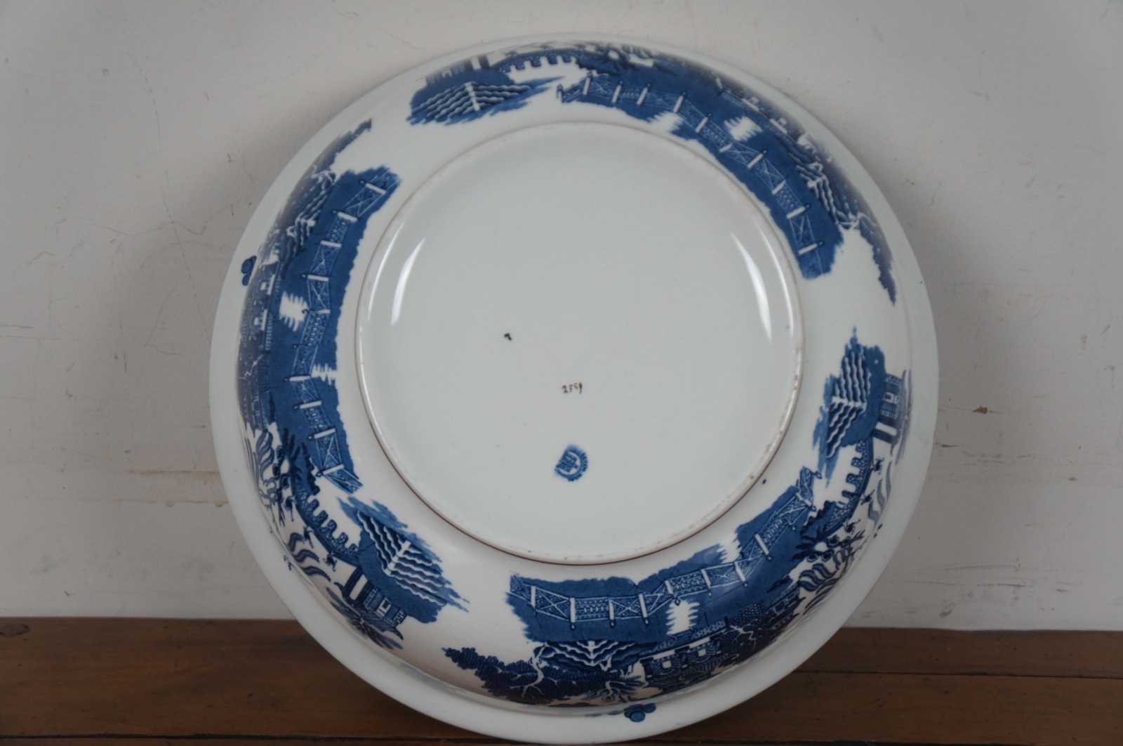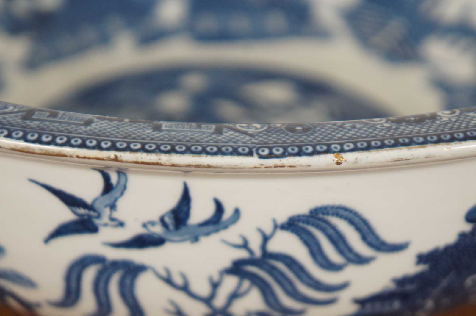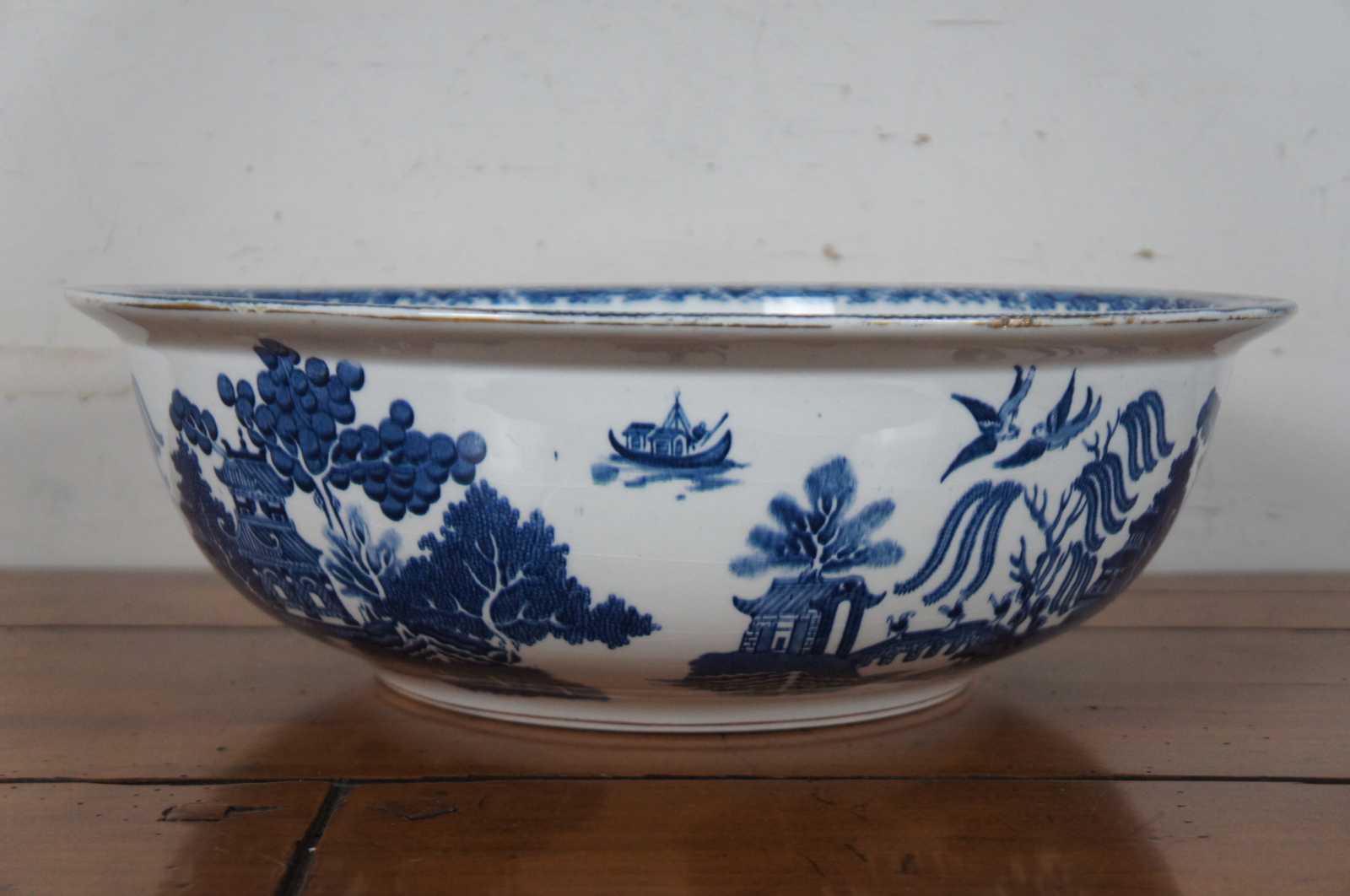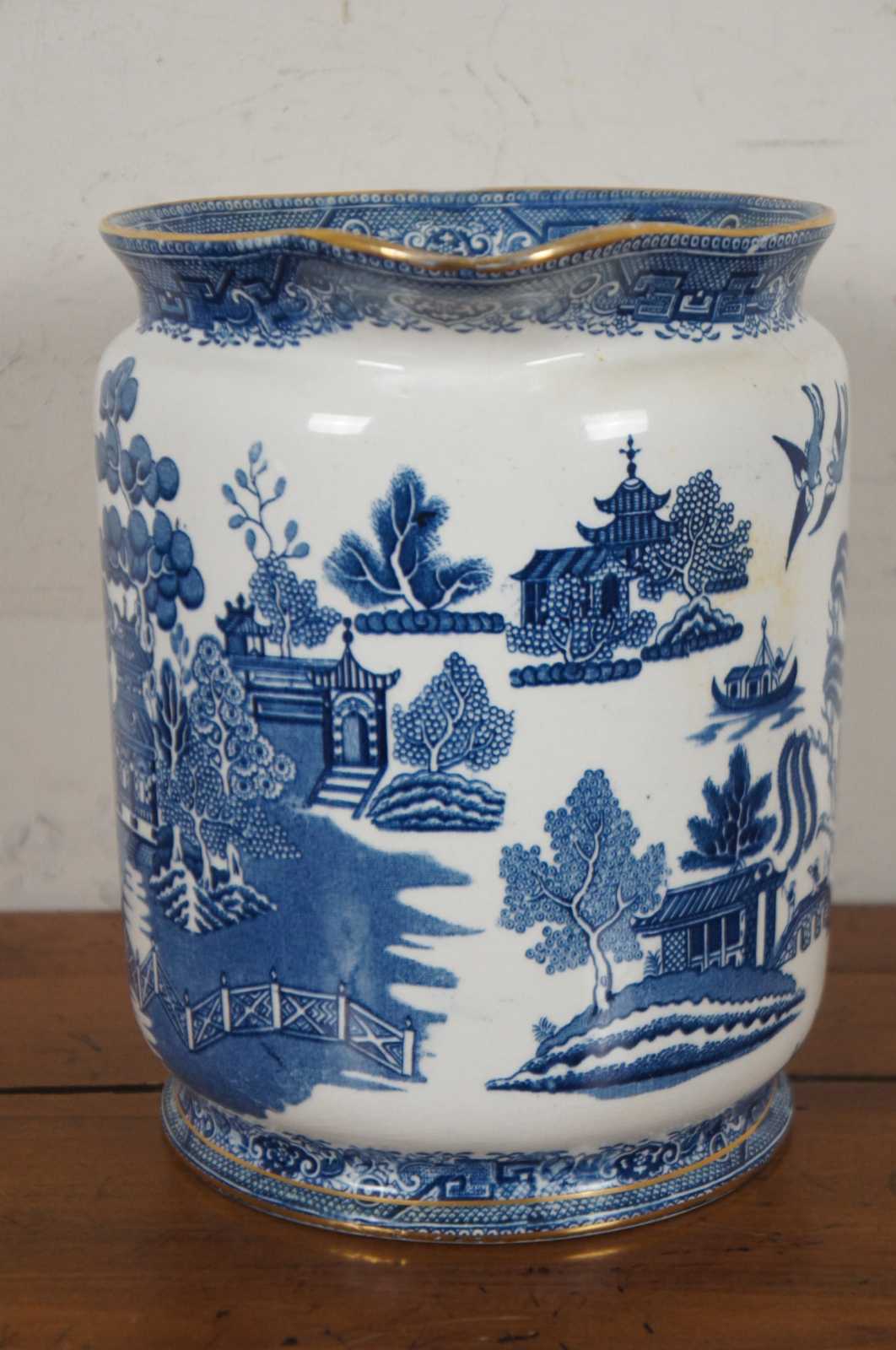 Antique early 20th century Victorian Cetem Ware blue willow pattern with gilded edge chamber wash bowl and pitcher / basin and ewer. “Maling pottery was produced in the north east of England for just over two centuries. The name of the pottery derives from the French surname of Malin. The family were Protestant Huguenots who fled their native land in the sixteenth century to escape the threat of religious persecution. They settled in England and prospered in a variety of business enterprises including coal, shipping and timber. Somewhere over the centuries the name was anglicized by the addition of a final ""g"". The pottery was founded at North Hylton, Sunderland in 1762,[1] and transferred to Newcastle upon Tyne in 1817.[2]