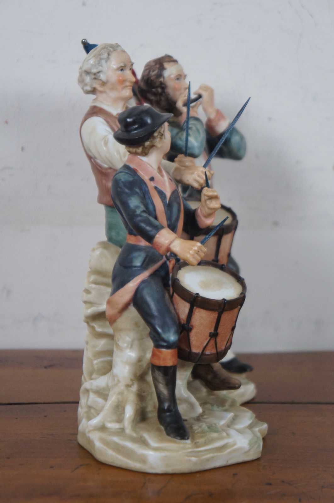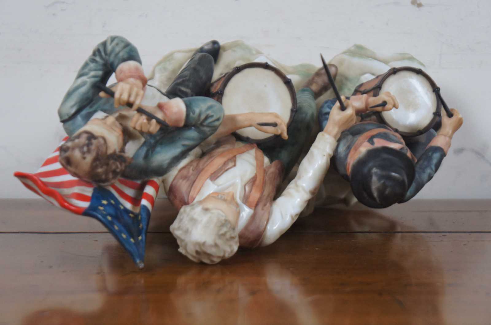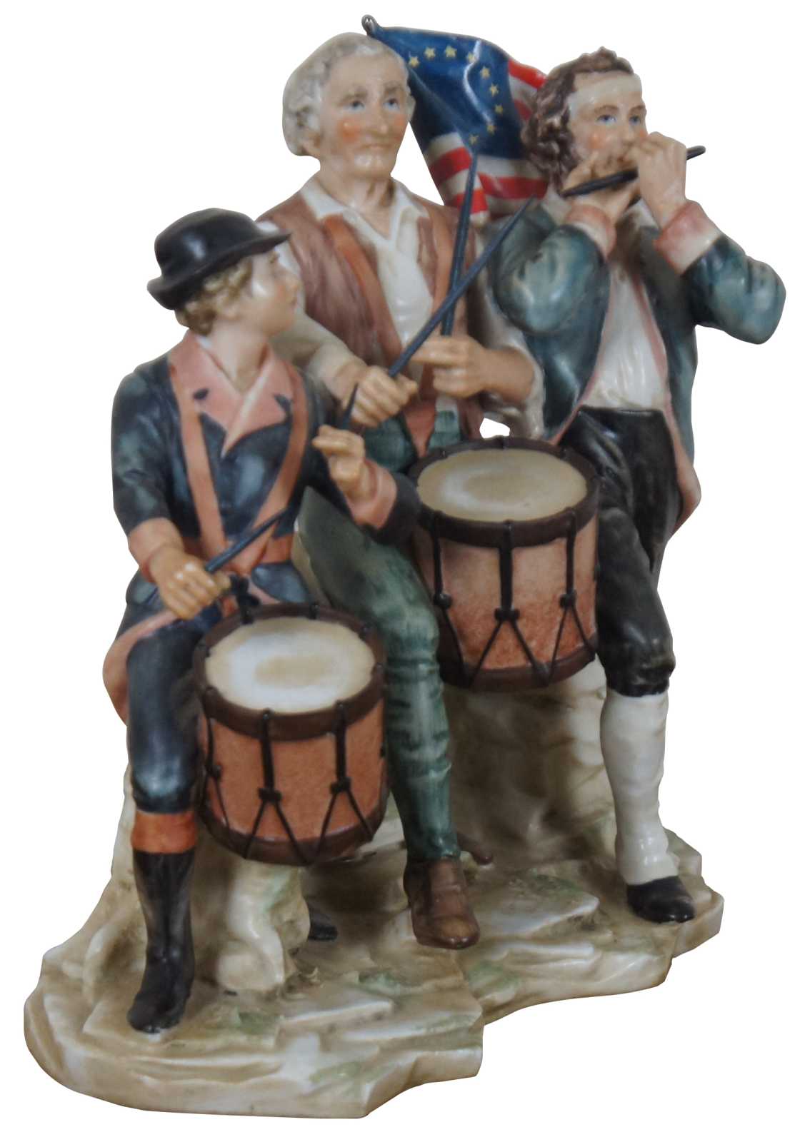 Vintage hand painted porcelain figurine after the painting Spirit of 1776 by Archibald Willard, showing George Washington marching triumphantly with two Revolutionary fife and drum playing soldiers. Crafted by Andrea by Sadek.