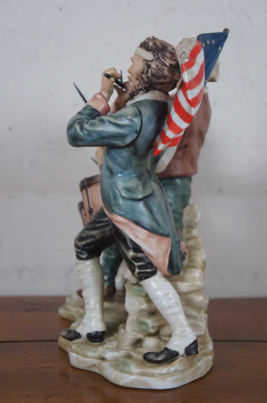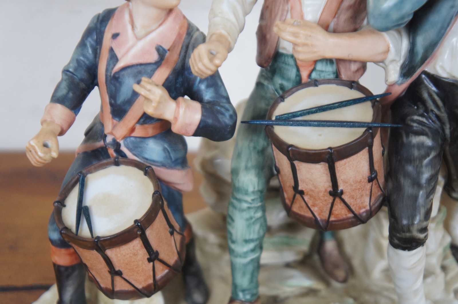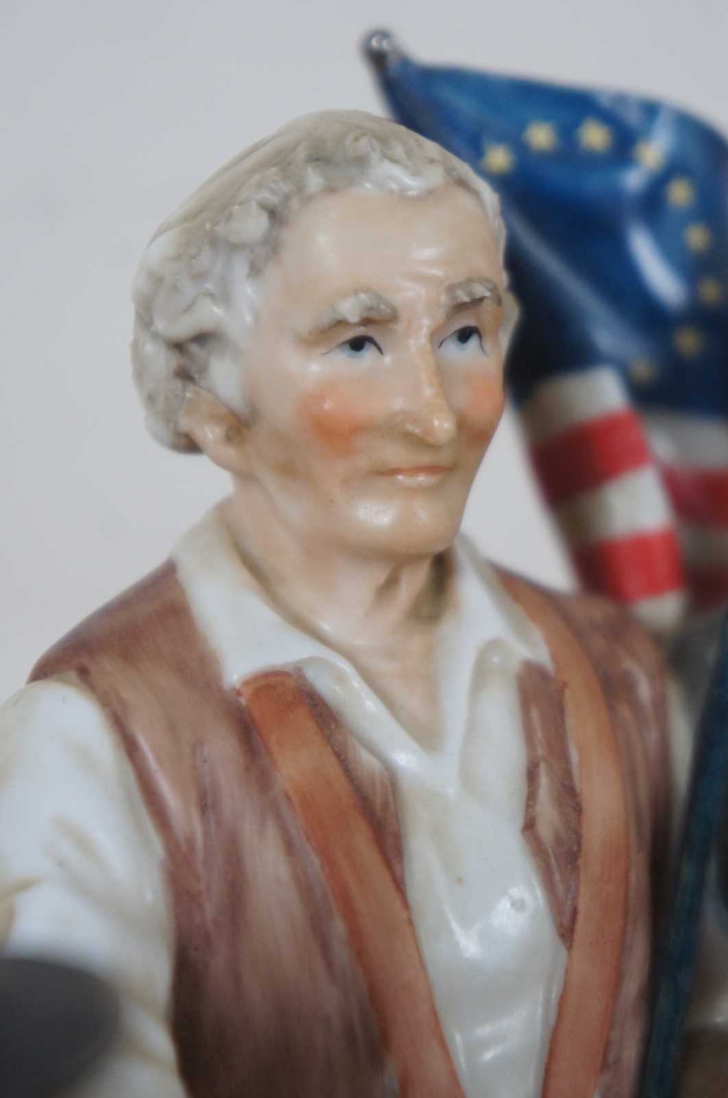 Vintage hand painted porcelain figurine after the painting Spirit of 1776 by Archibald Willard, showing George Washington marching triumphantly with two Revolutionary fife and drum playing soldiers. Crafted by Andrea by Sadek.