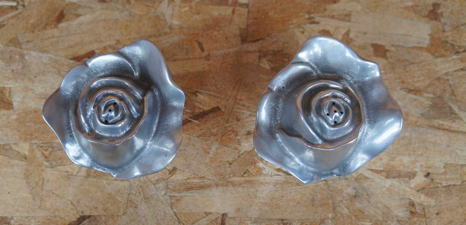 Pair of pewter or aluminum salt and pepper shakers in the form of rose buds or flowers, unmarked with rubber stoppers.