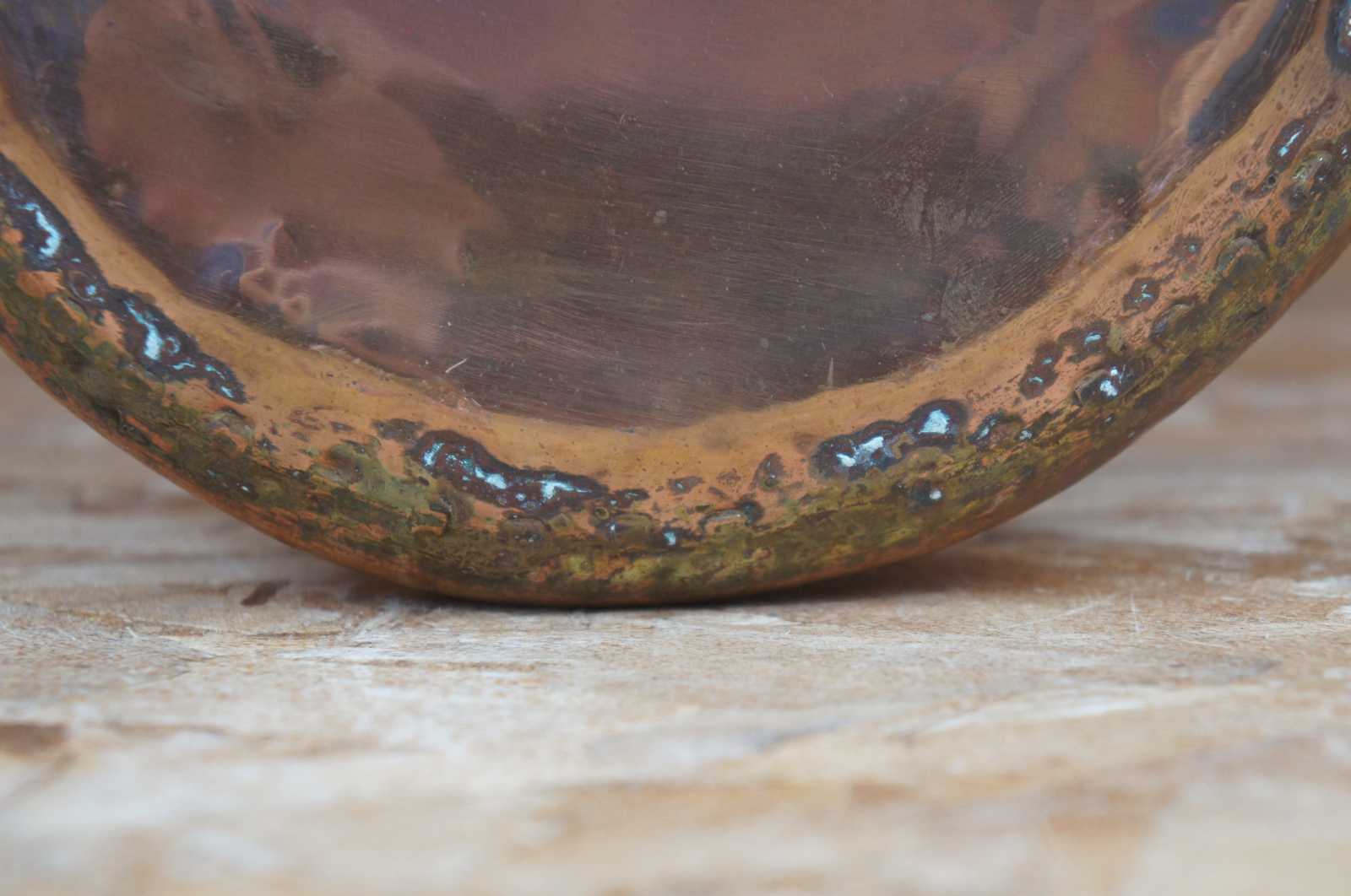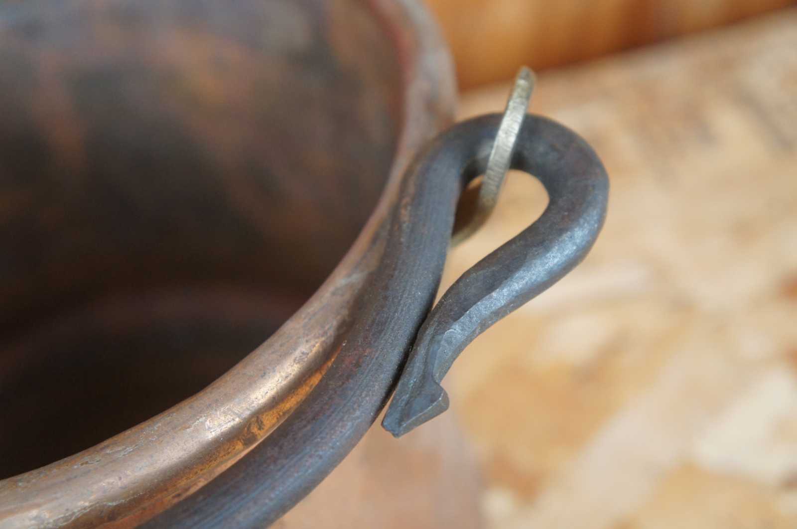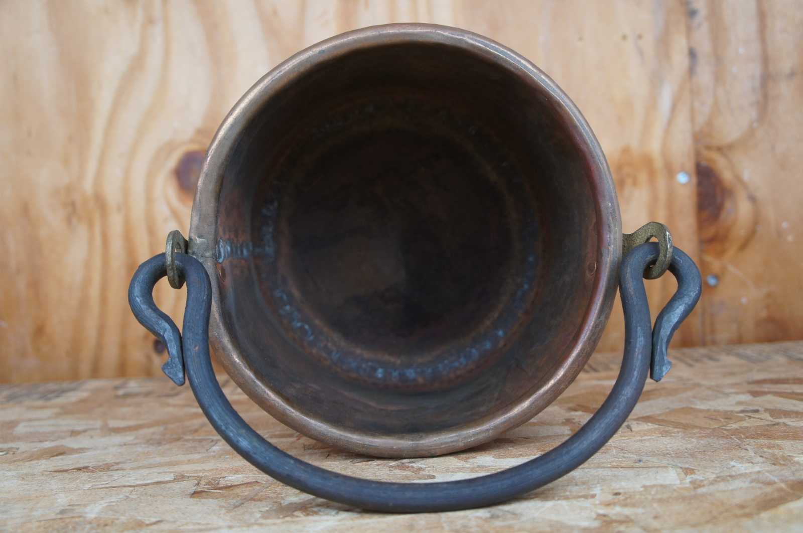 Antique hammered and dovetailed copper pot with forged iron handle and fixed bail.