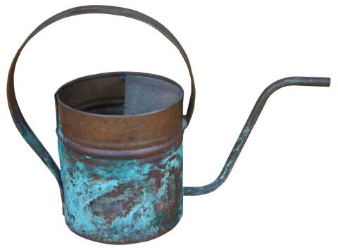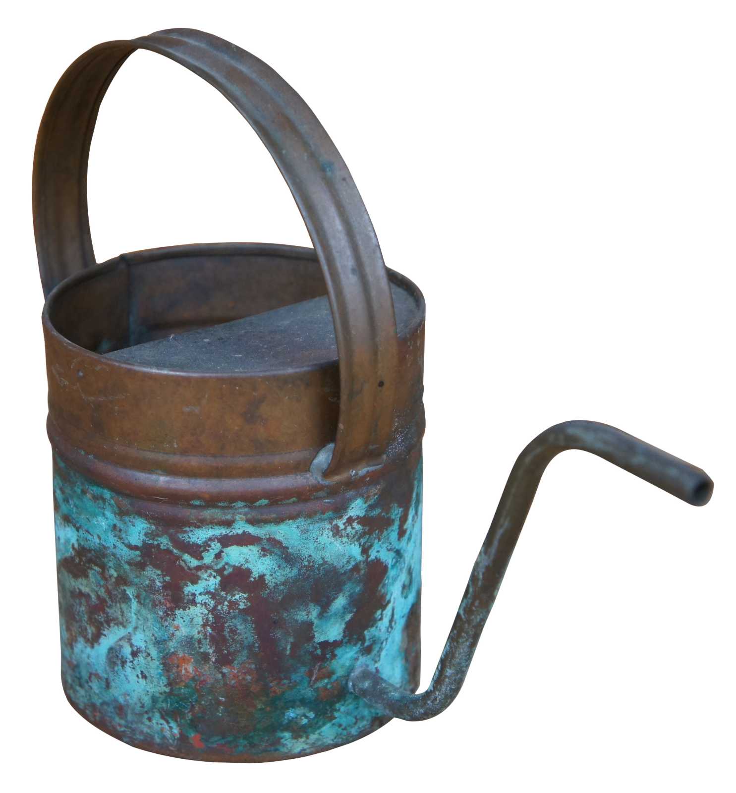 Antique copper watering can or sprinkler featuring long slim Bonsai or Gooseneck spout.