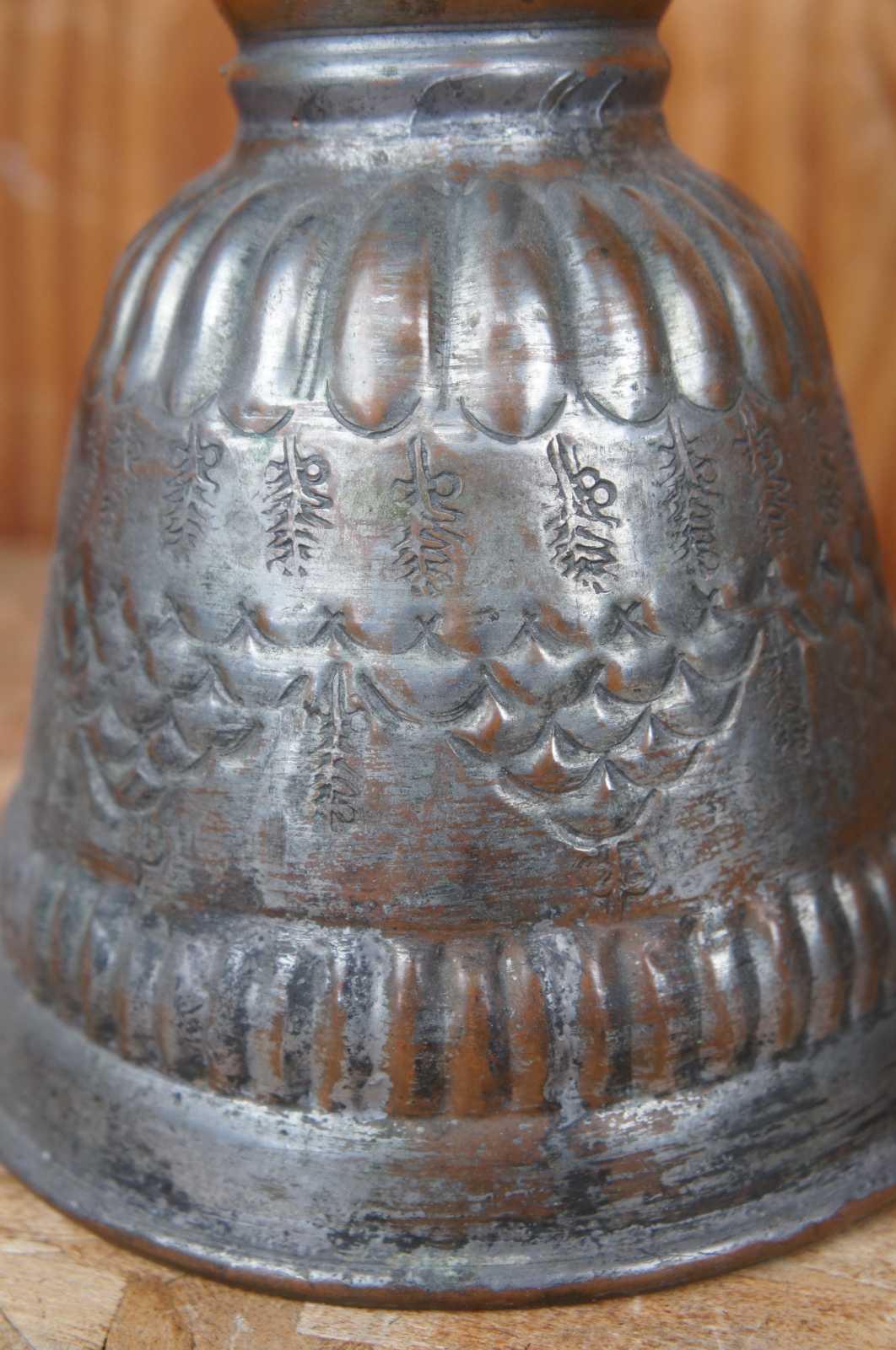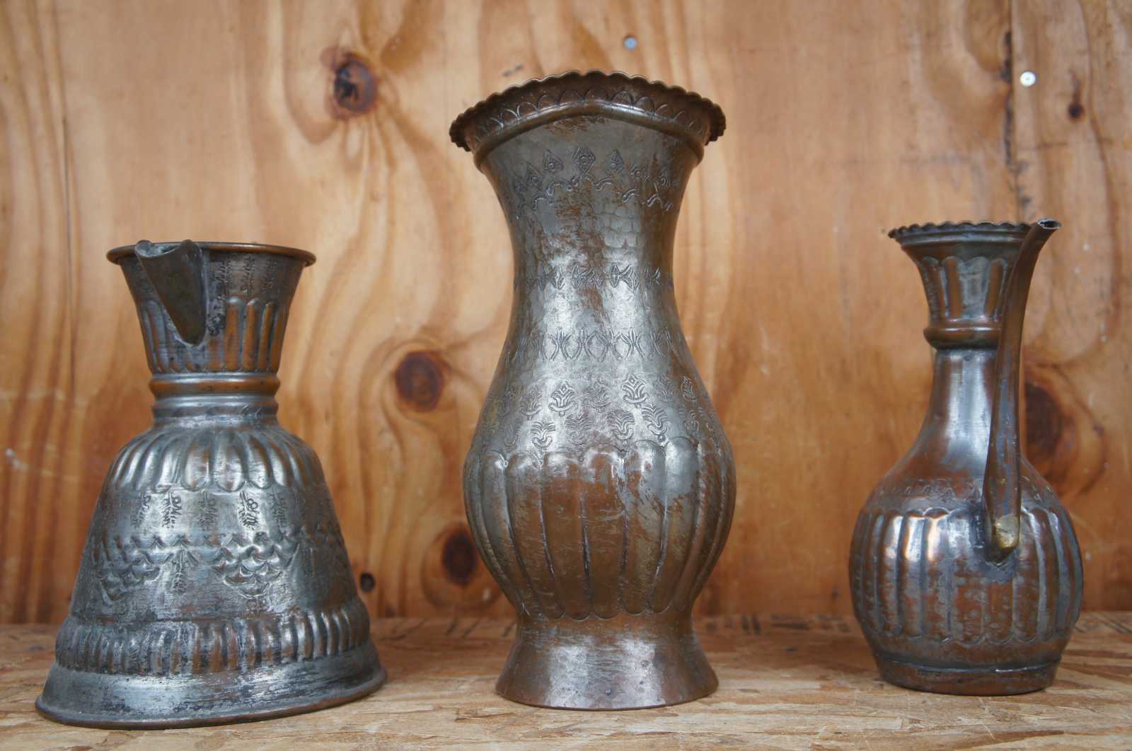 Three of assorted hammered copper pitchers featuring various designs and styles with fleur de lis and ribbed accents, and scrolled handles. One features a bonsai gooseneck spout. Stamped with ‘Egypt’ on the bottom.
