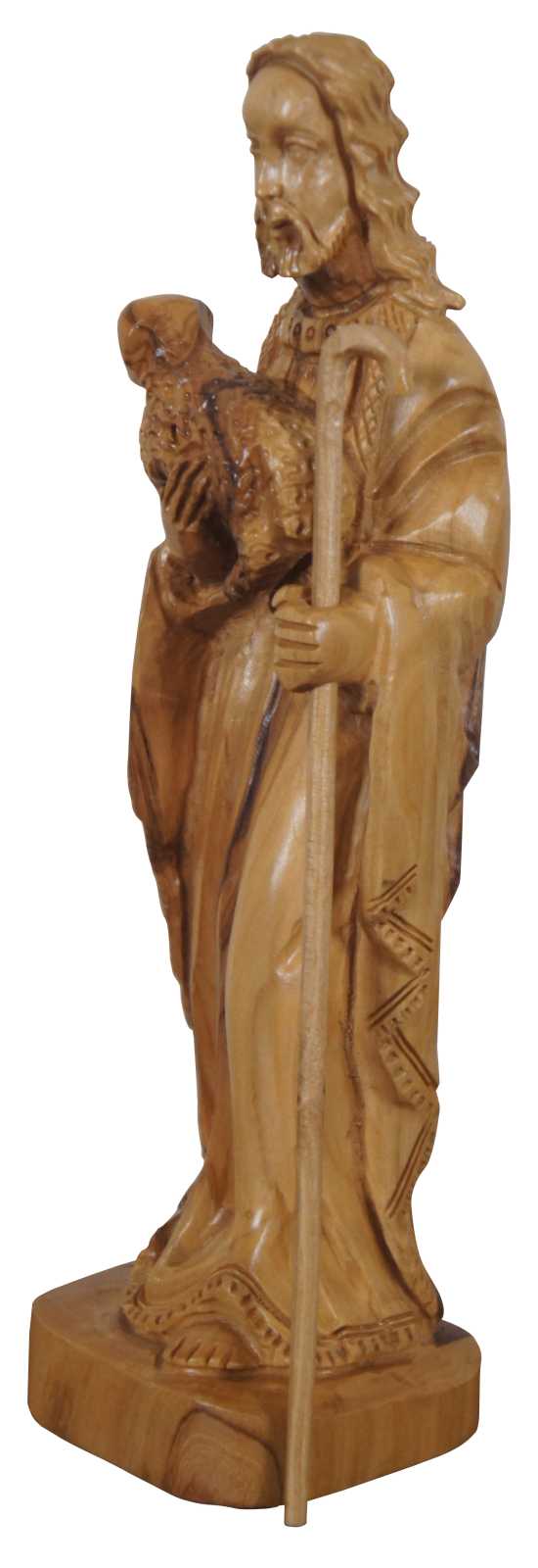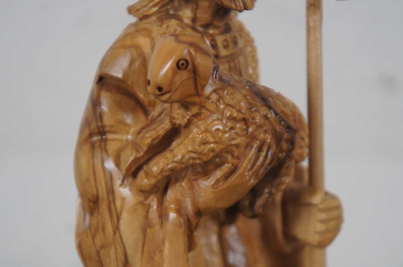 Vintage hand carved folk art olive wood figurine of Jesus as the good Shepherd, carrying a lamb and a shepherd’s crook staff.