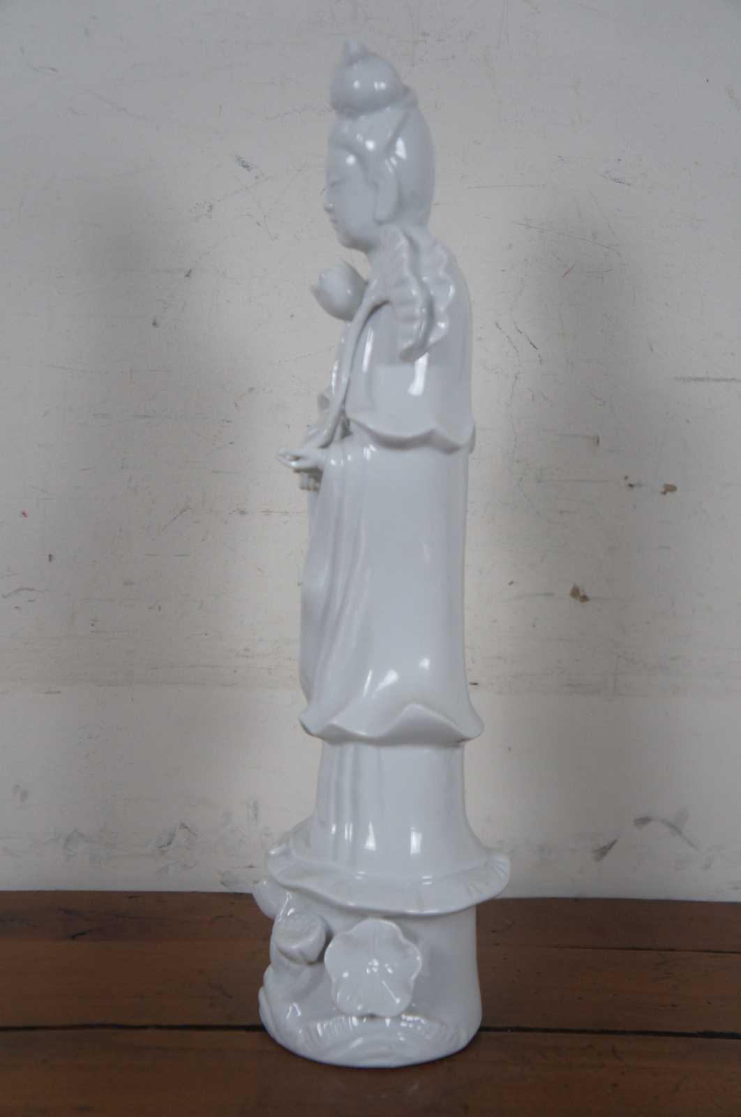 Vintage white porcelain figurine of the Goddess of Compassion Kwan Yin, made by MOC Japan. “The name Guan Yin also spelt Guan Yim, Kuan Yim, Kwan Im, or Kuan Yin, is a short form for Kuan-shi Yin, meaning ""Observing the Sounds (or Cries) of the (human) World"".