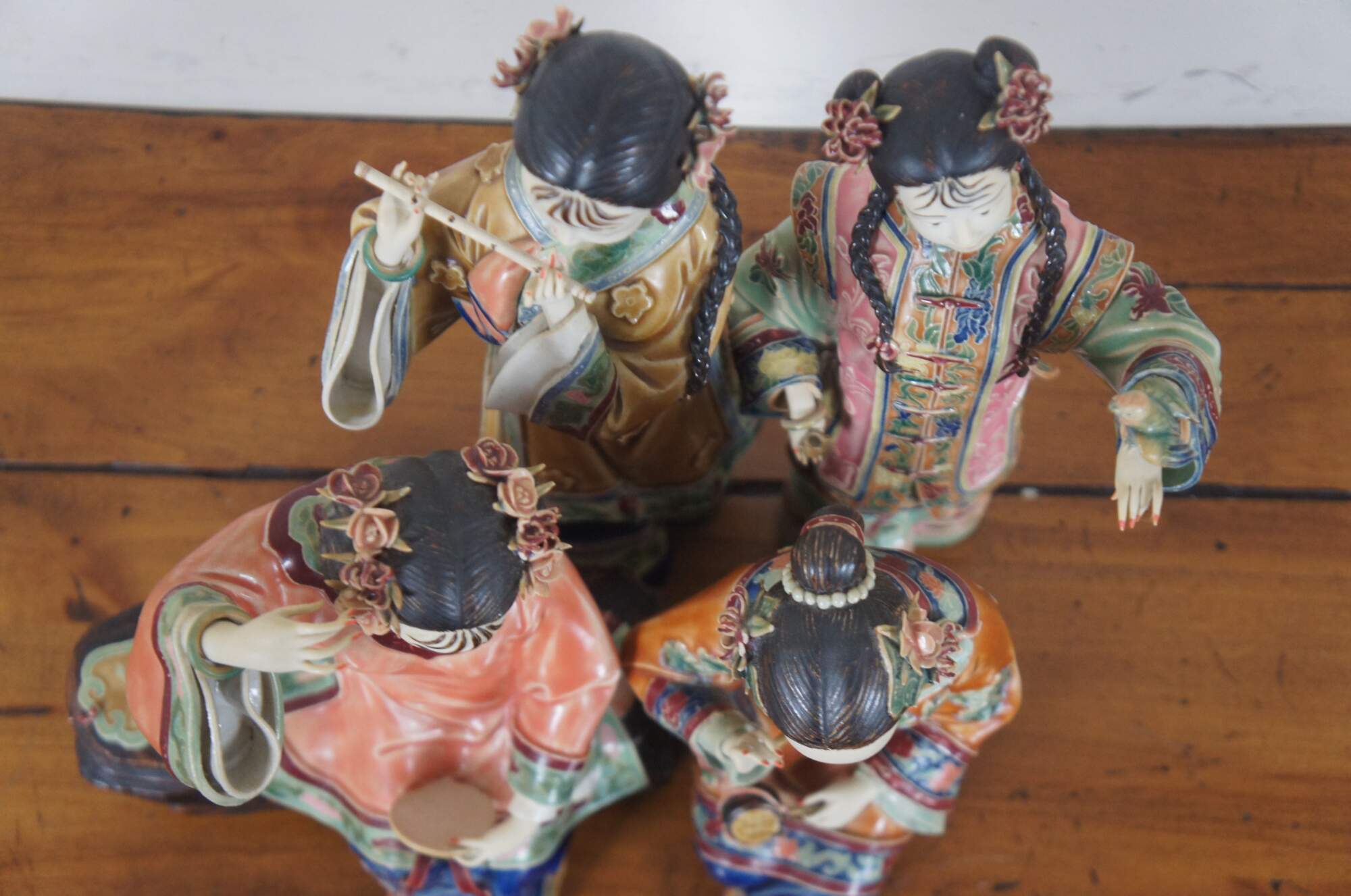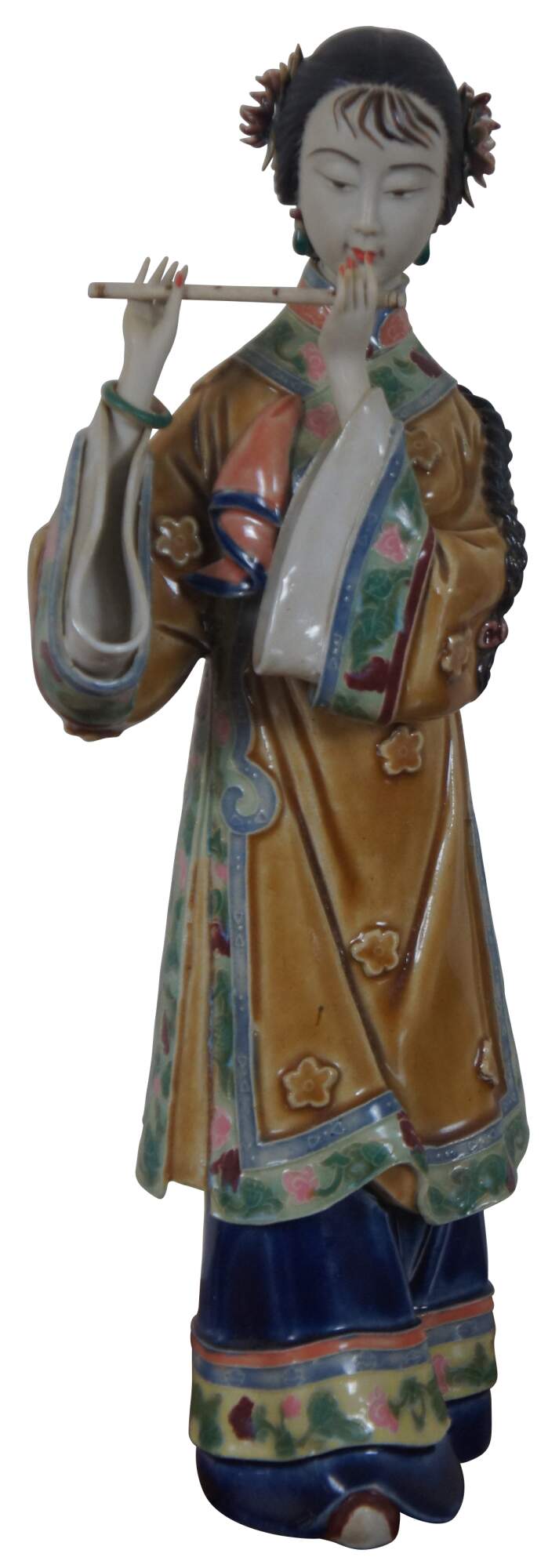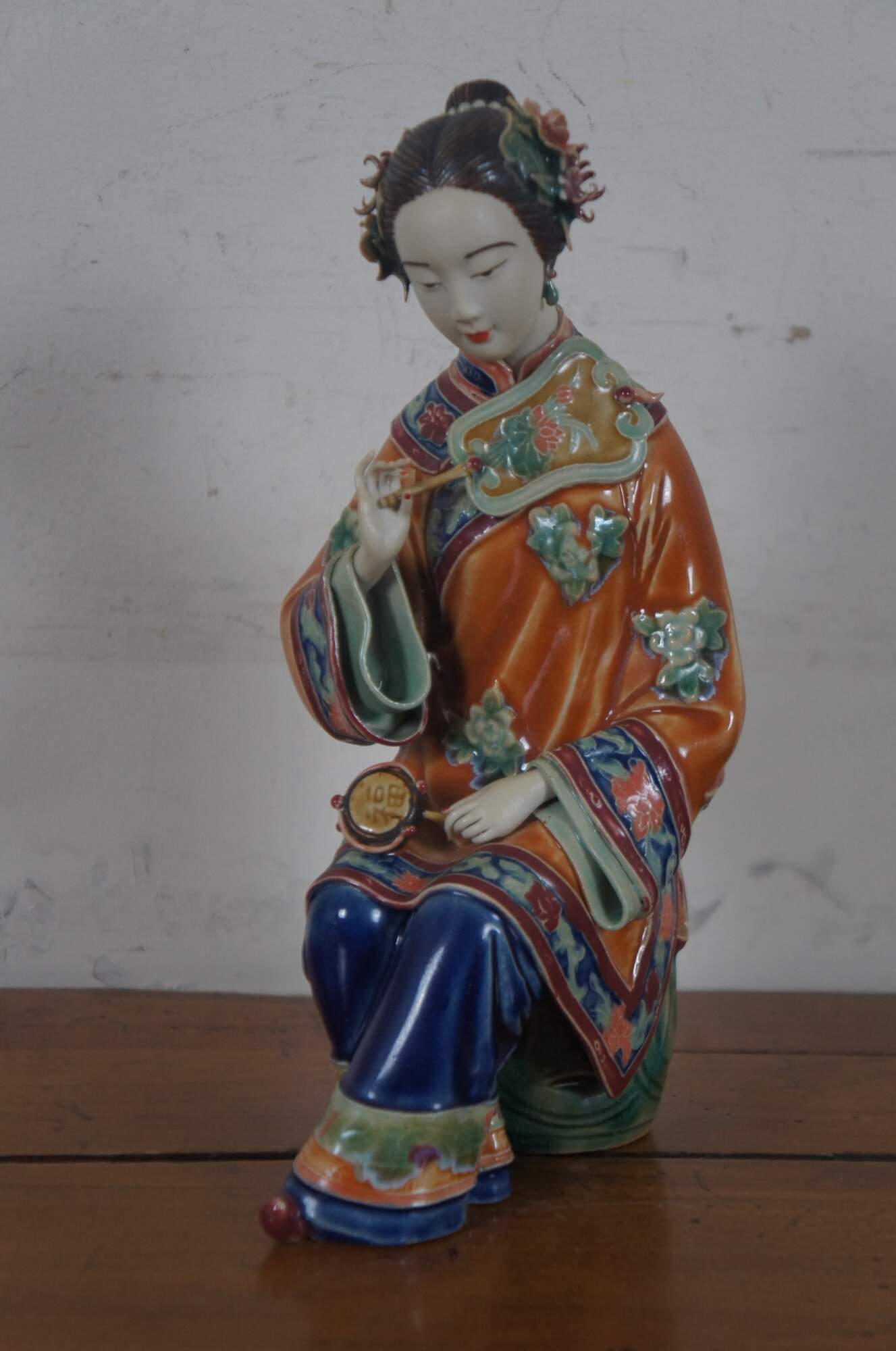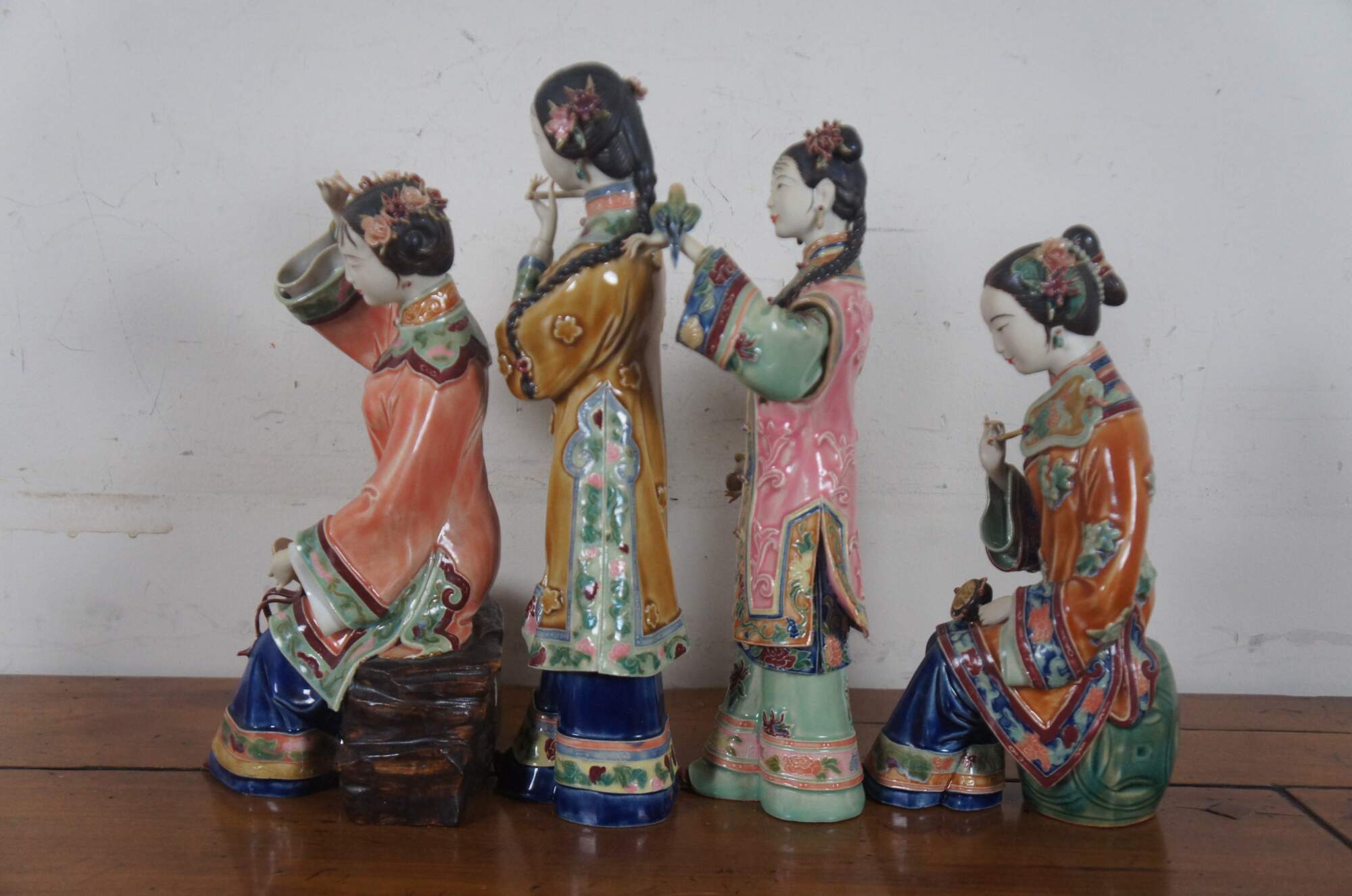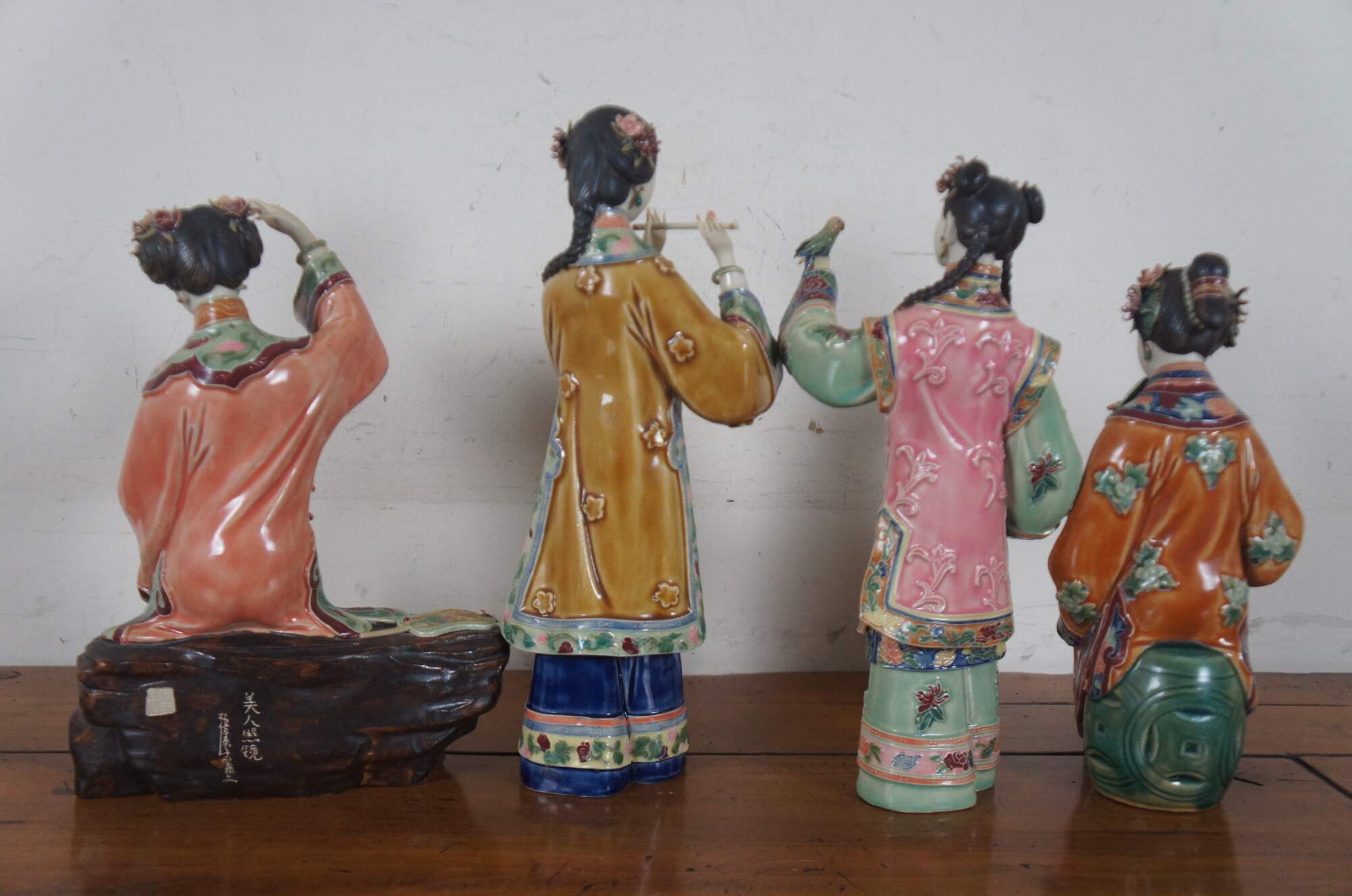 Set of four vintage Shiwan / Shi Wan / Shinwa signed Chinese ceramic maiden figurines in a variety of outfits and cultural styles from Imperial China, with delicate details and beautifully colored glazes. “China has a long history of ceramic production dating back over 3,000 years. The most famous Chinese ceramic town is Shiwan. It accounts for approximately 40% of China's ceramic production and around 25% of the world's capacity.