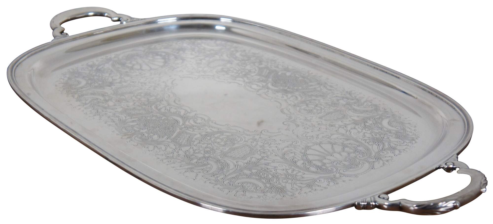 Vintage rectangular silver plate serving tray by International Silver Company, Georgian Court pattern, number 708, featuring etched floral and scallop shell designs with simple beveled border and scalloped handles.