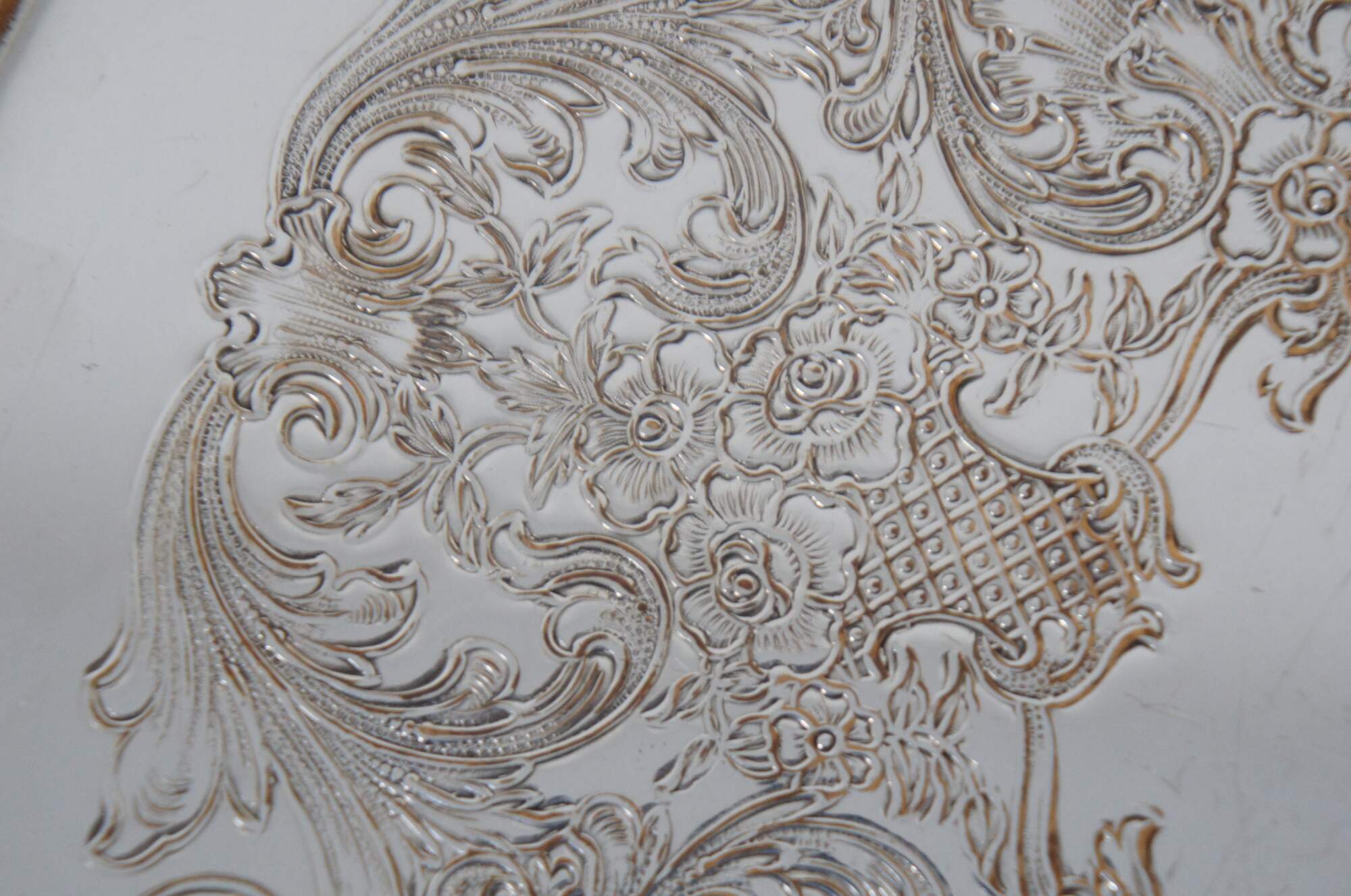Vintage round silver plate platter or tray by William Rogers, number 571, with etched floral center and edge of flowers and swirling leaves. “William Hazen Rogers (born May 13, 1801) was an American master silversmith and a pioneer in the silver-plate industry and whose work and name have survived to the present day.