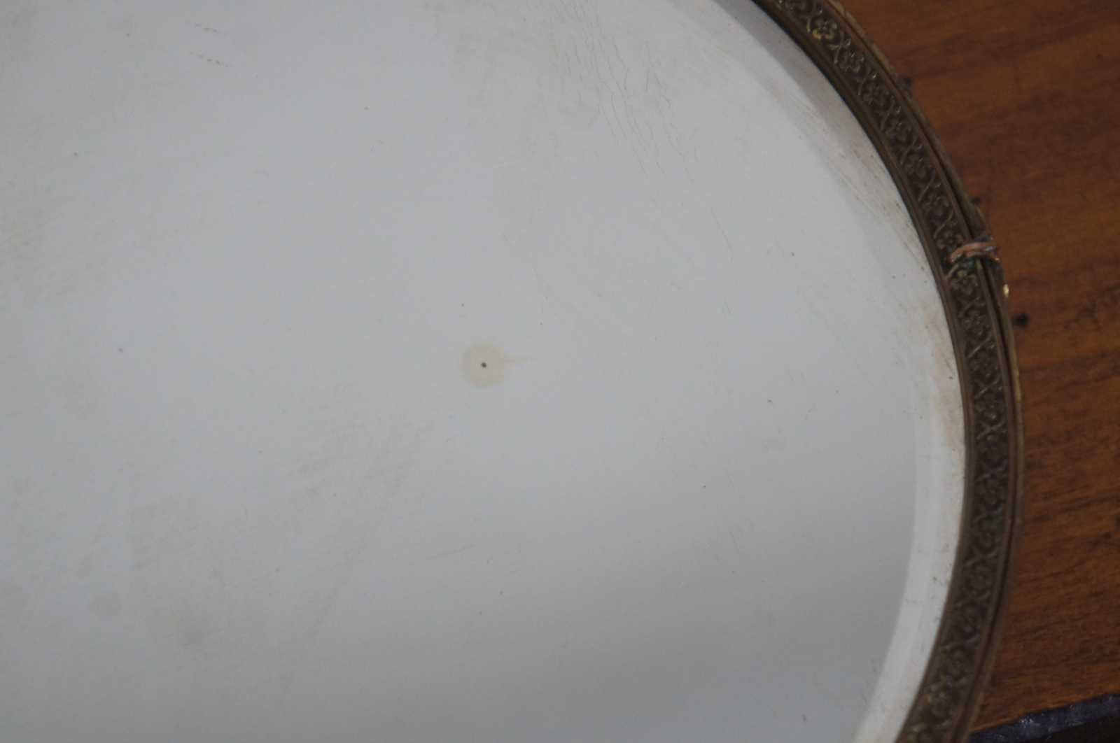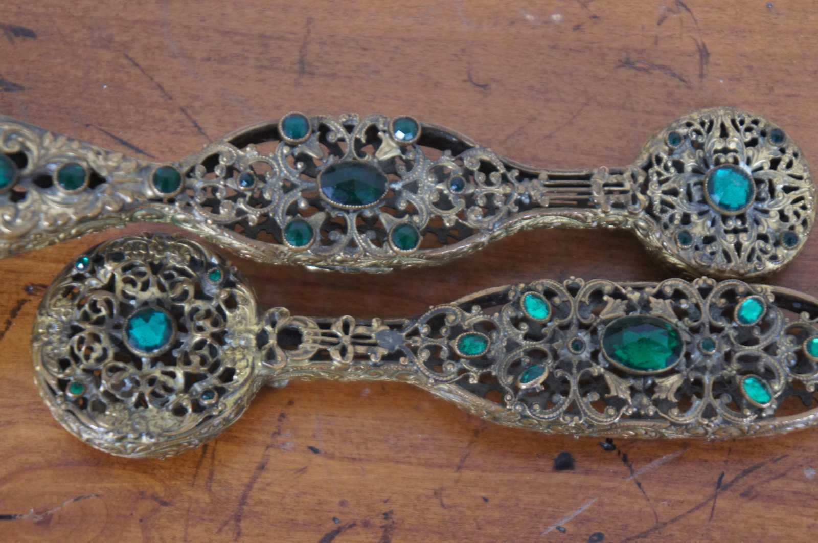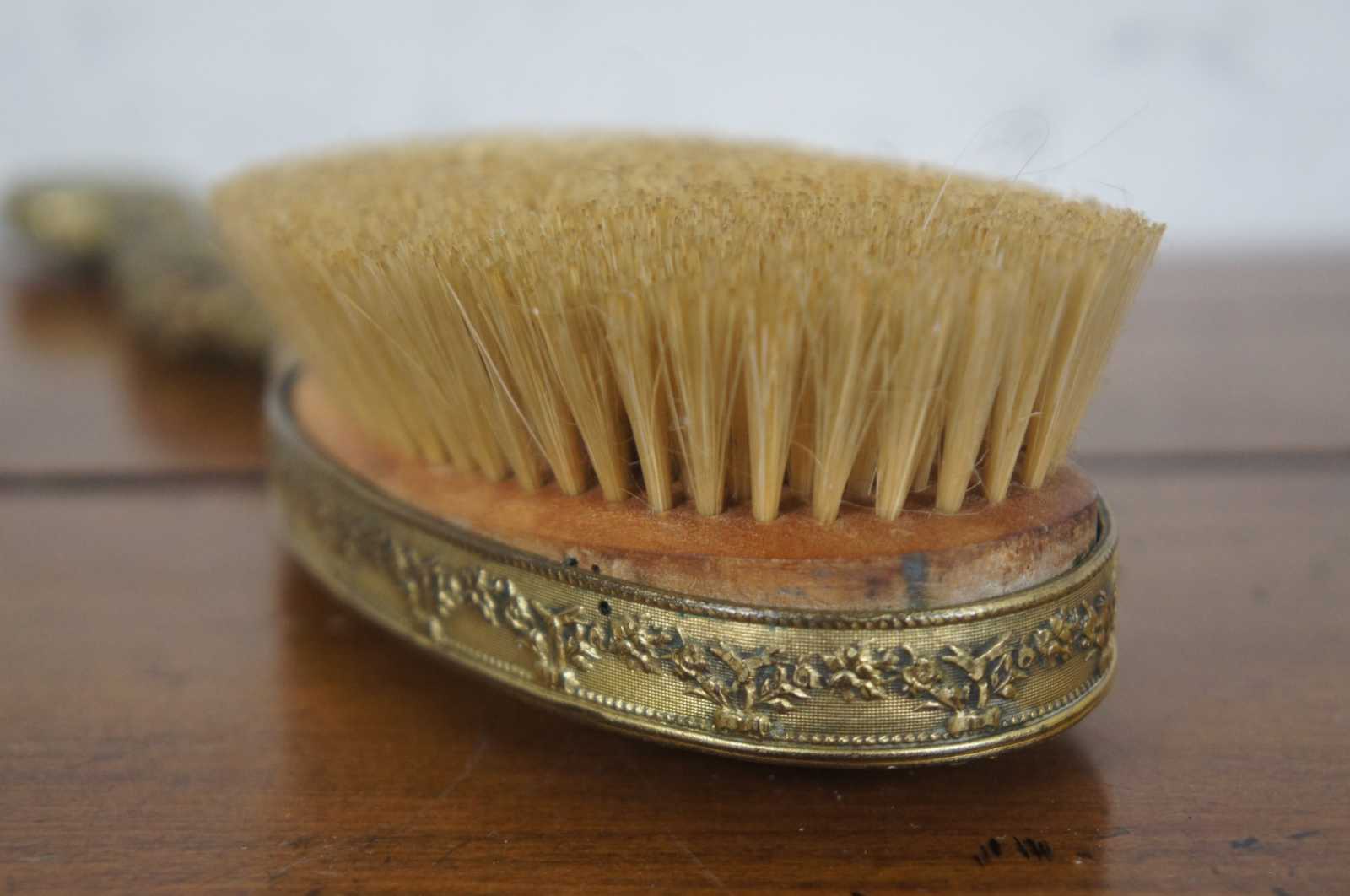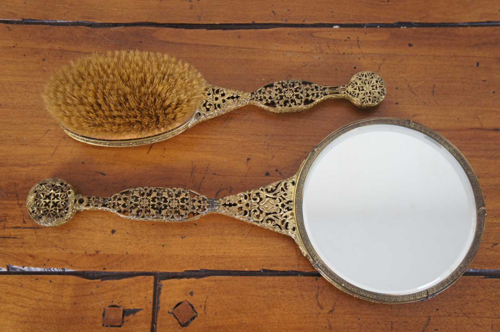 Antique early 20th century Art Deco gilt ormolu Empire Style hair brush and hand mirror set decorated with green glass jewels and guilloche enamel medallions. Attributed to E & JB.