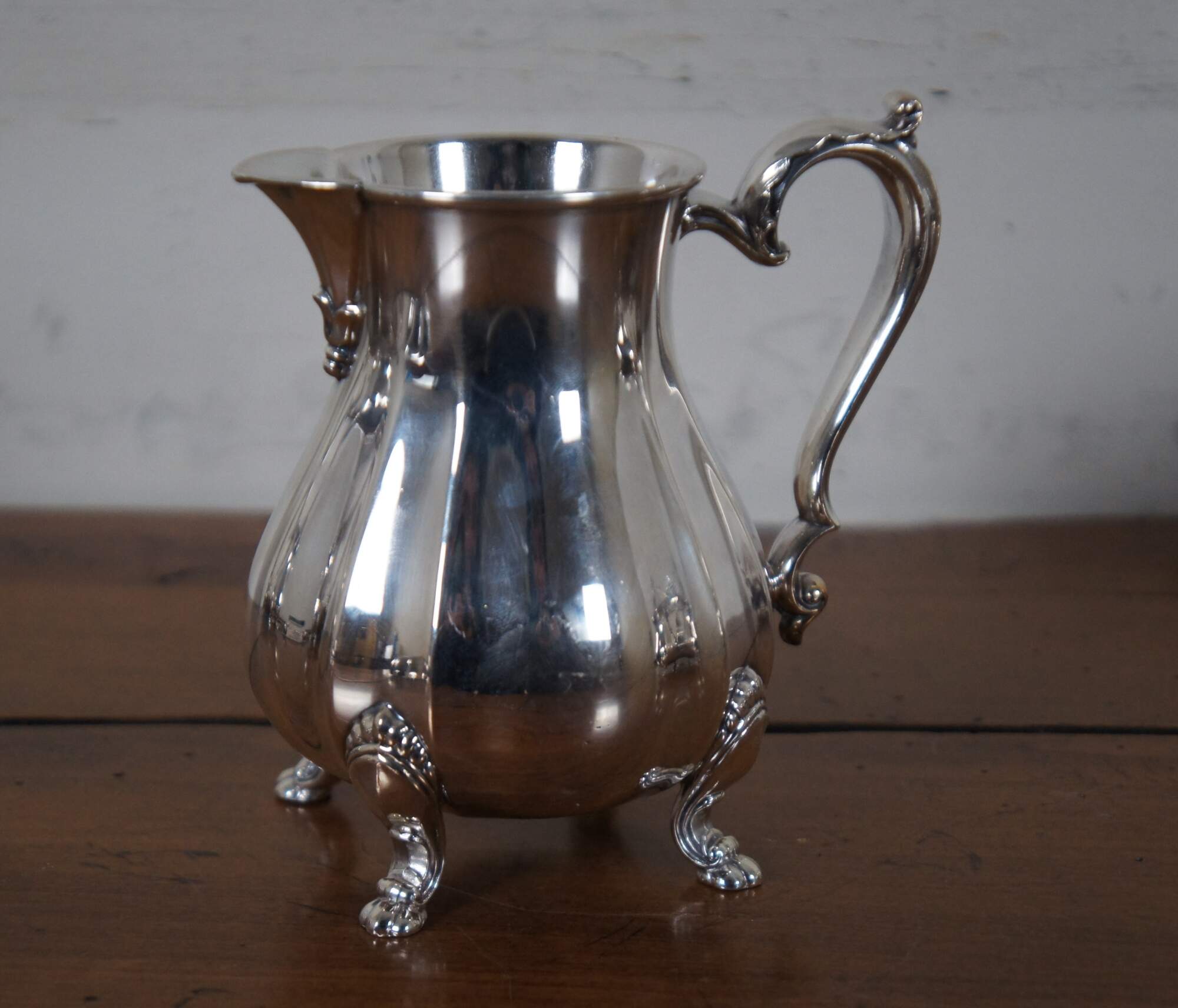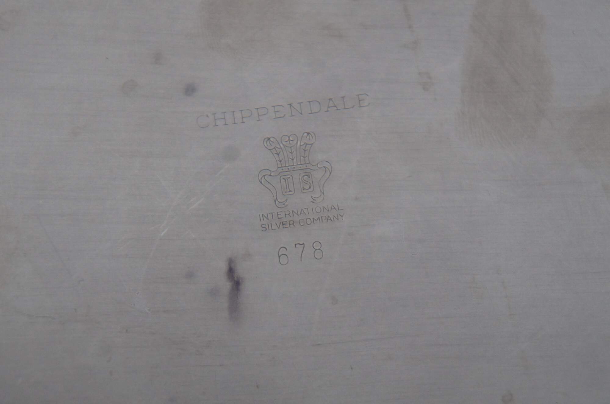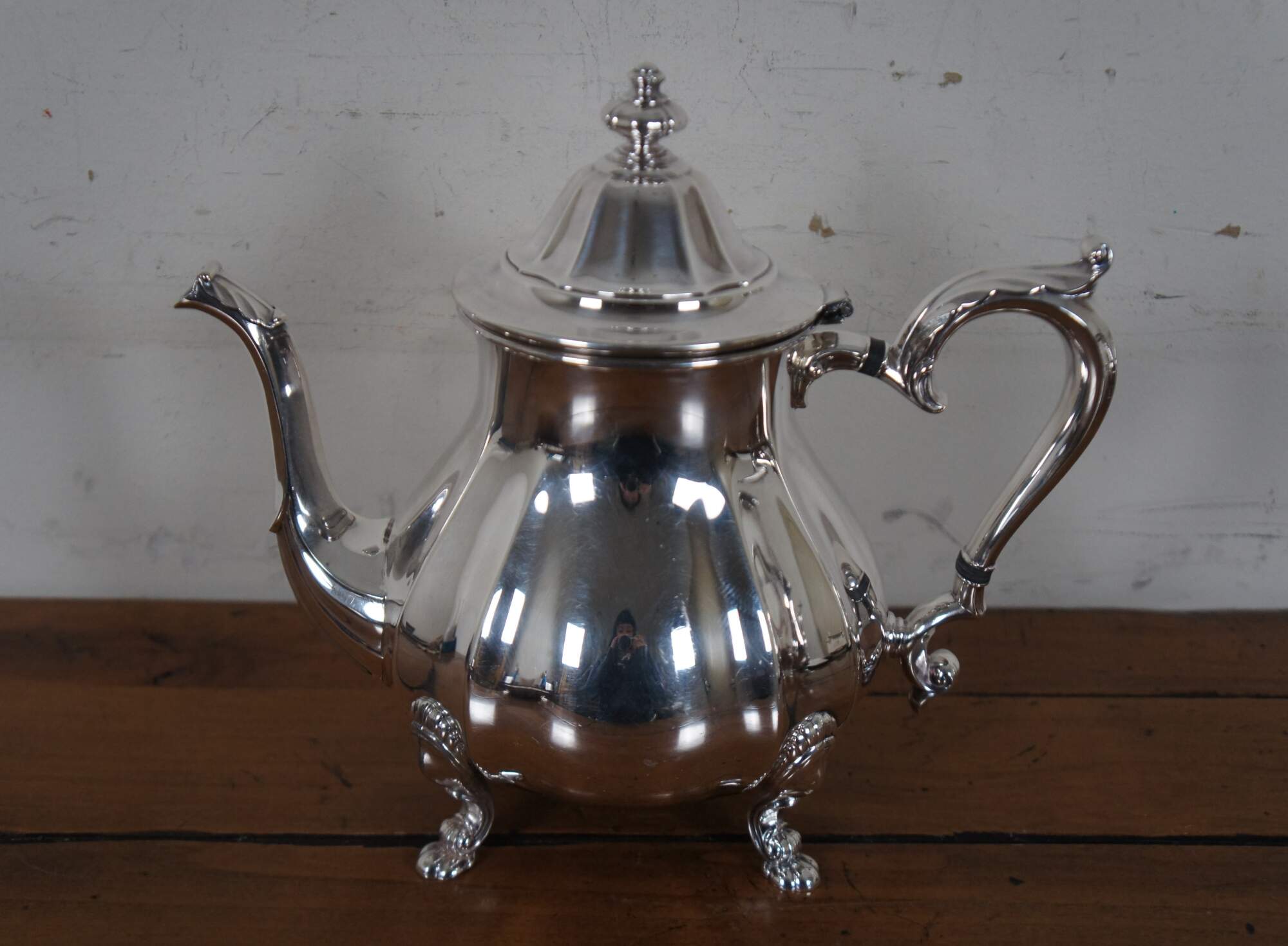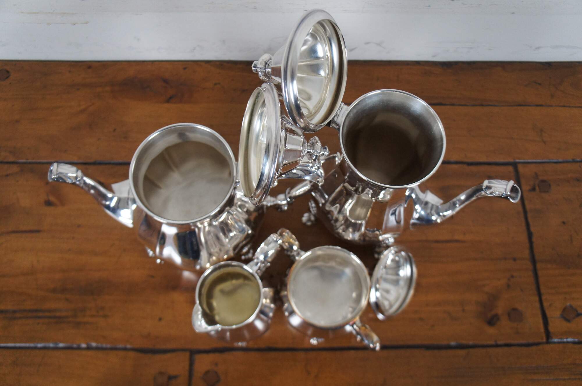 Five piece silver plate tea and coffee serving set by International Silver Company number 678 / 6301 / 6302 / 6303, including one scalloped serving dish, tea pot, coffee pot, creamer, and sugar bowl with lid.