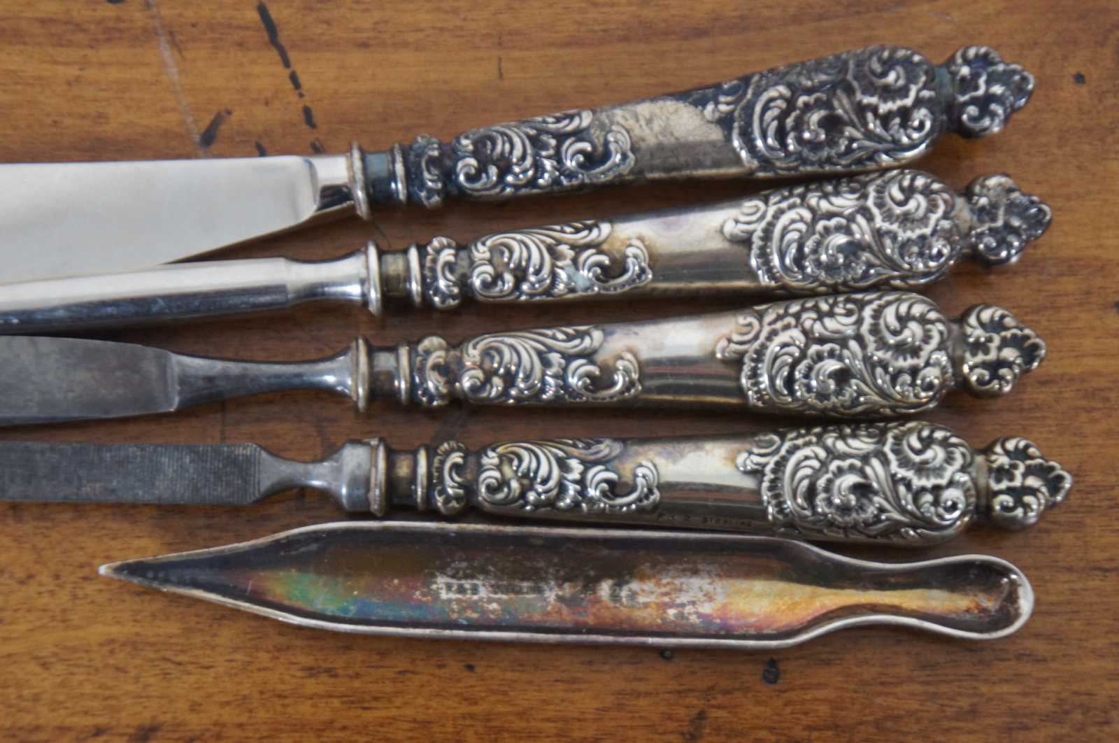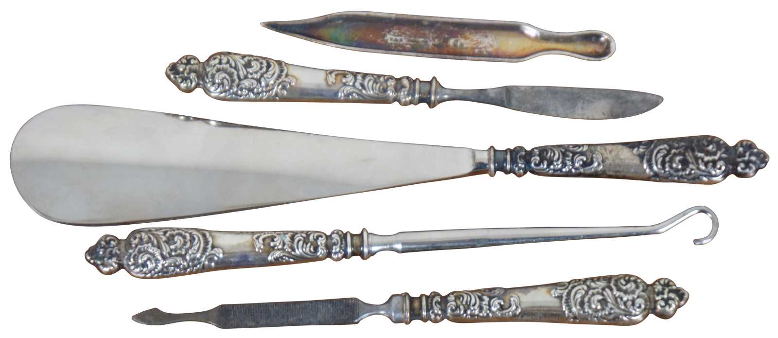 Early 20th century five piece vanity grooming set by Theodore W. Foster and Bros with art nouveau sterling silver handles, engraved with an M. Set includes a shoe horn, nail file, button hook, corn knife, and cuticle pusher. “Providence, RI - Founded in 1873 as White & Foster. From 1878 to 1898 the firm was active as Foster & Bailey as partnership of Theodore W. Foster and Samuel H. Bailey. From 1898 the company was incorporated under the name Theodore W. Foster & Bros. Co but continued to use the F&B mark until 1951.”