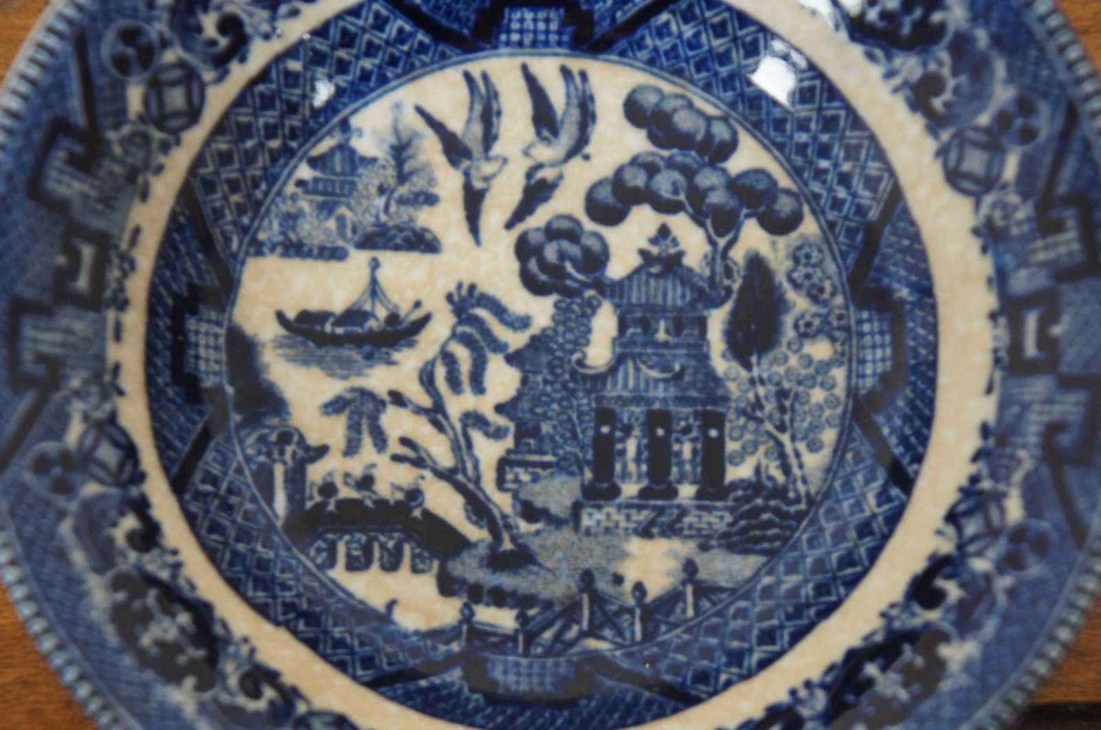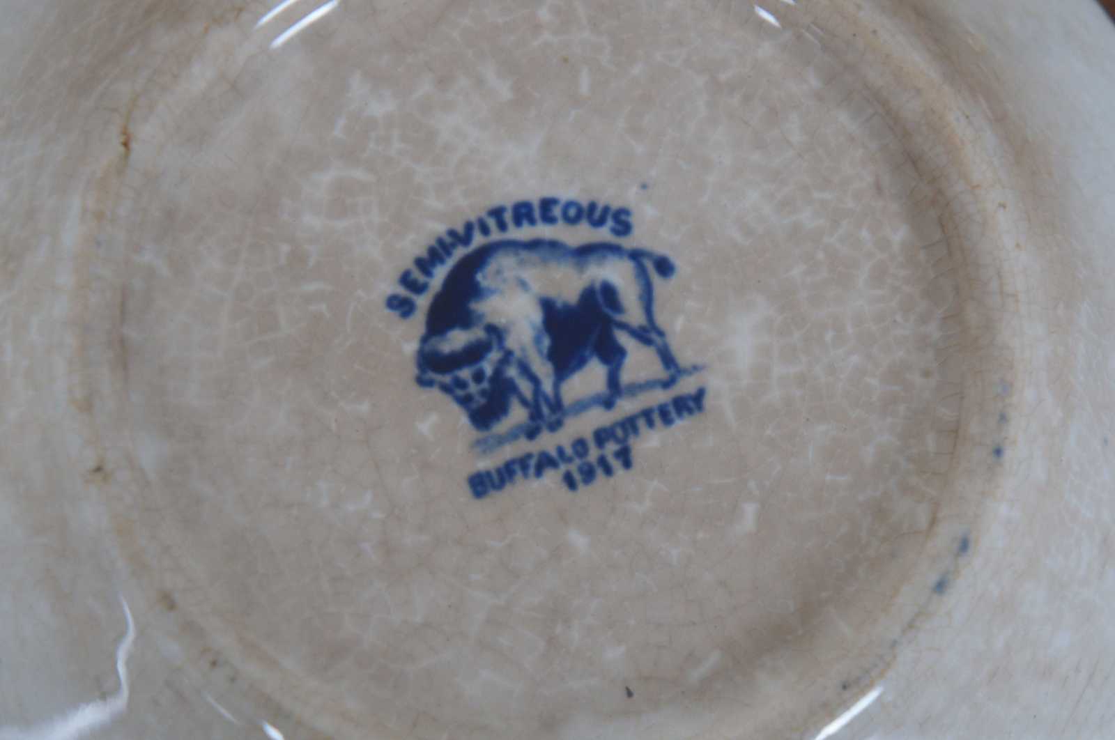 Set of six antique Buffalo Pottery Semi-Vitreous porcelain custard dishes, mark dated 1916 and 1917, featuring a traditional Blue Willow design. “Buffalo China, Inc., formerly known as Buffalo Pottery, was a company founded in 1901 in Buffalo, New York as a manufacturer of semi-vitreous, and later vitreous, china. Prior to its acquisition by Oneida Ltd. in 1983, the company was one of the largest manufacturers of commercial chinaware in the United States.