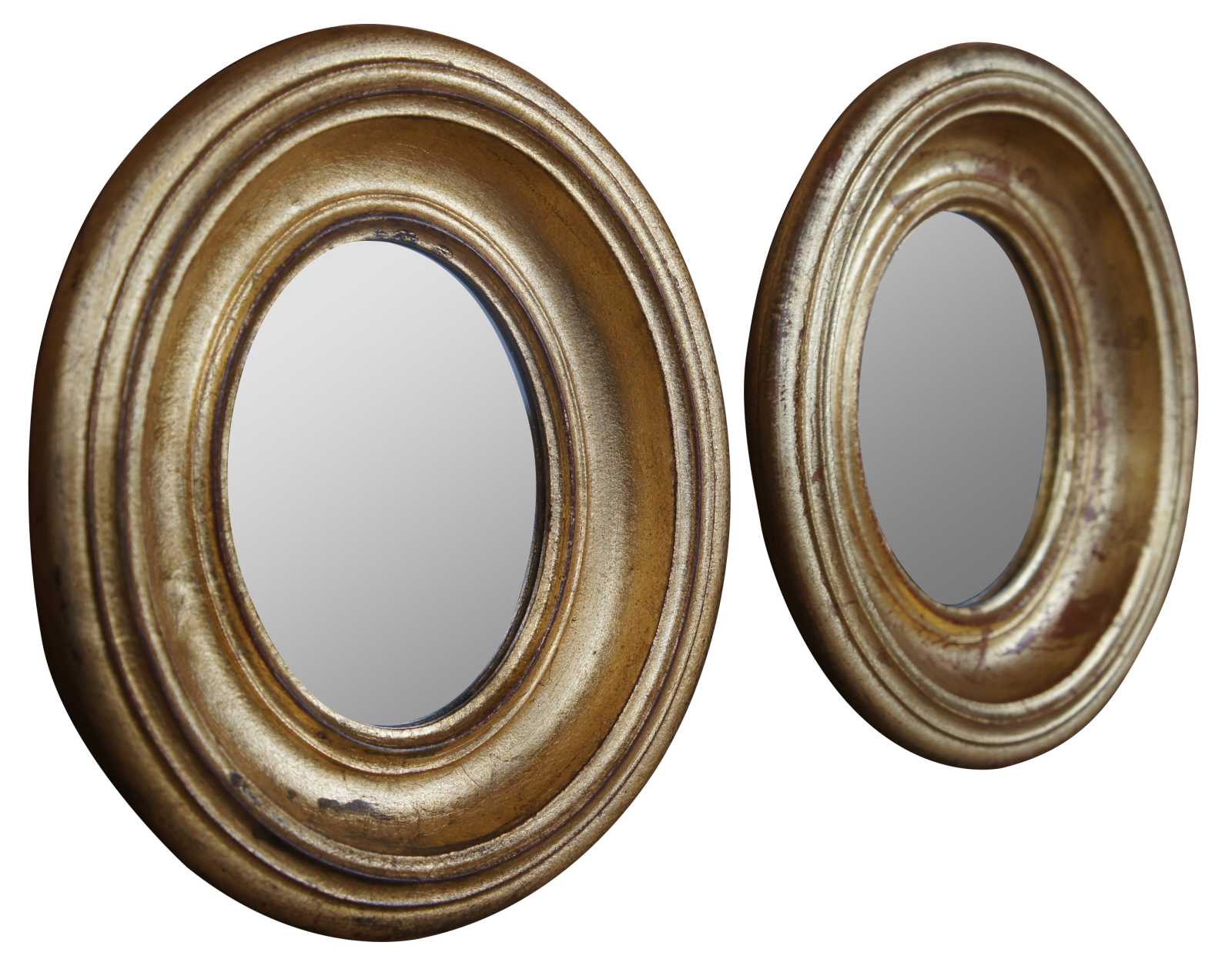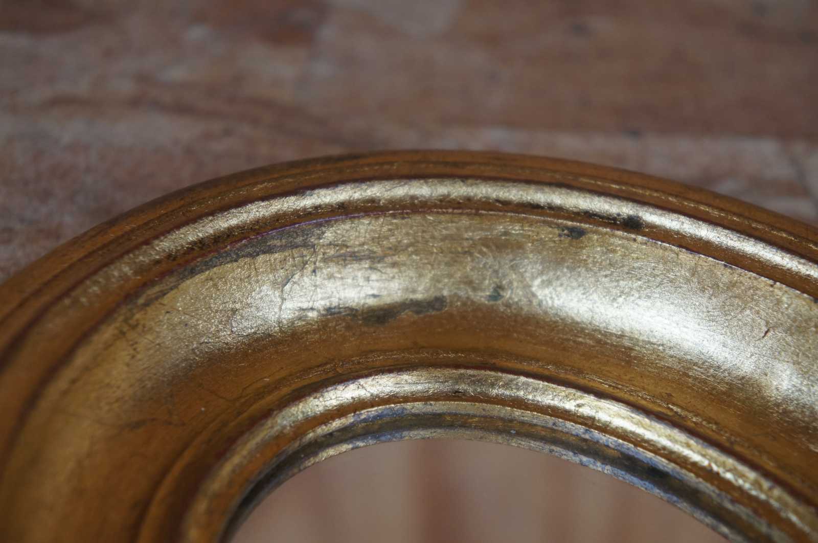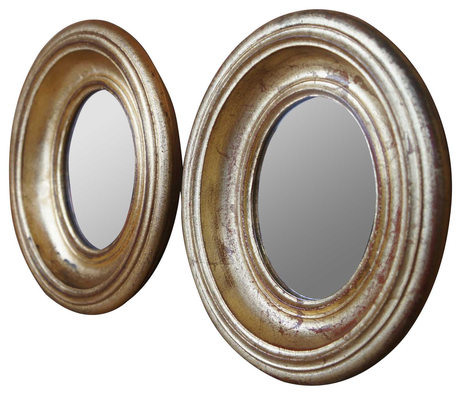 Pair of two mid century Hollywood Regency style Italian Florentine gold gilt mirror frames featuring oval form with beveled frame. Marked Italy, Italia, decorative craft, Florentia.