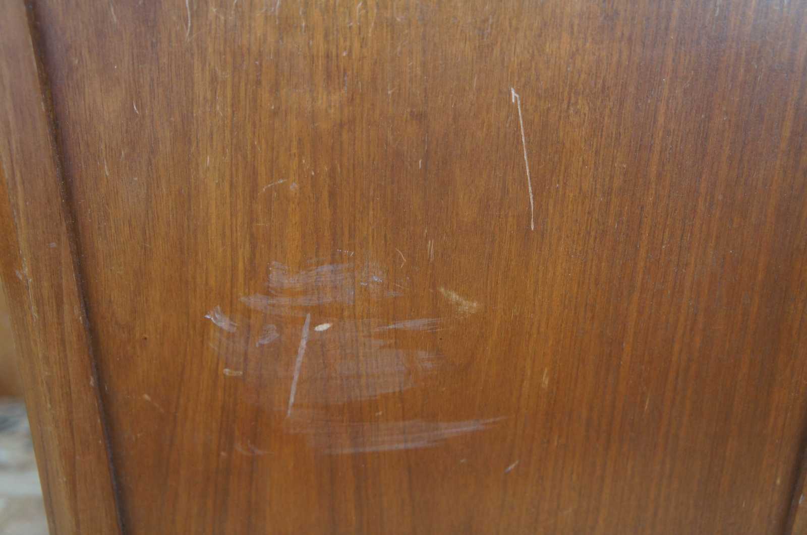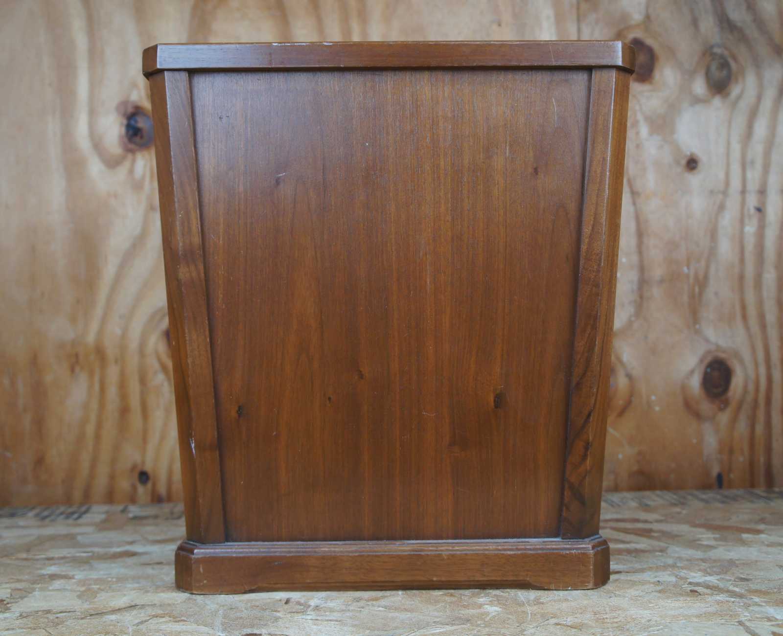 Large mid century modern executive desk walnut waste basket or wood trash can with square tapered form, attributed to Nucraft. Founded in Grand Rapids, Michigan, in 1945 by George W. Schad, Nucraft’s early days were built upon an idea to craft solid walnut Chippendale office accessories, such as coat racks, letter trays, and wastepaper baskets.