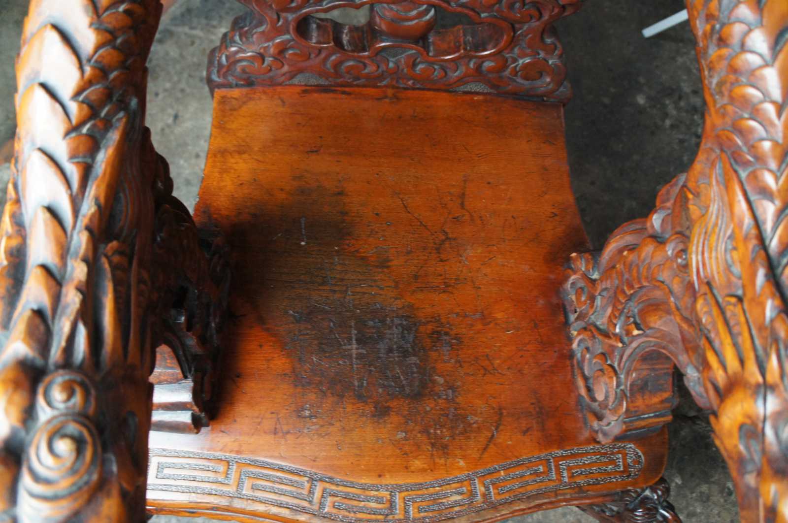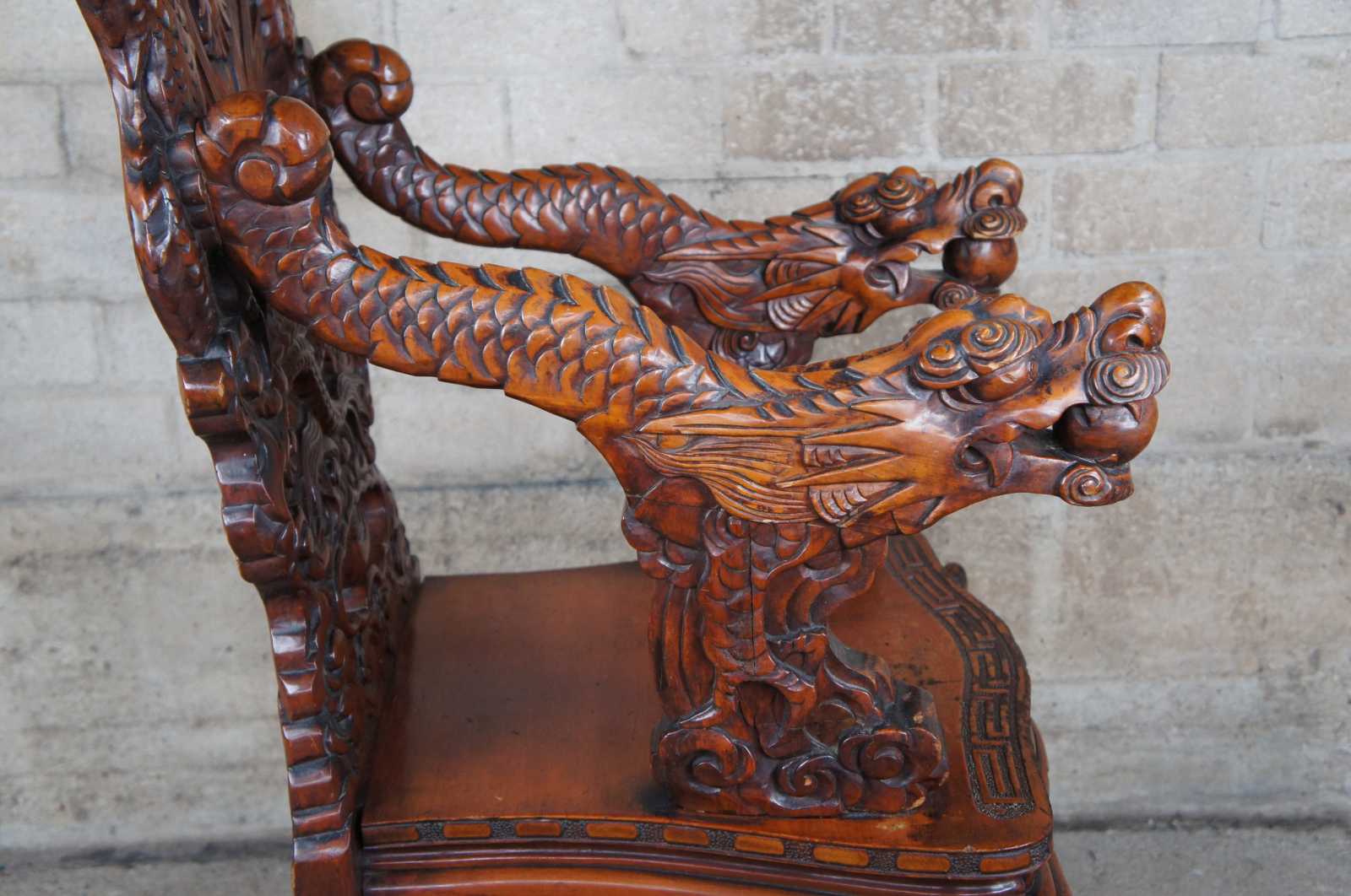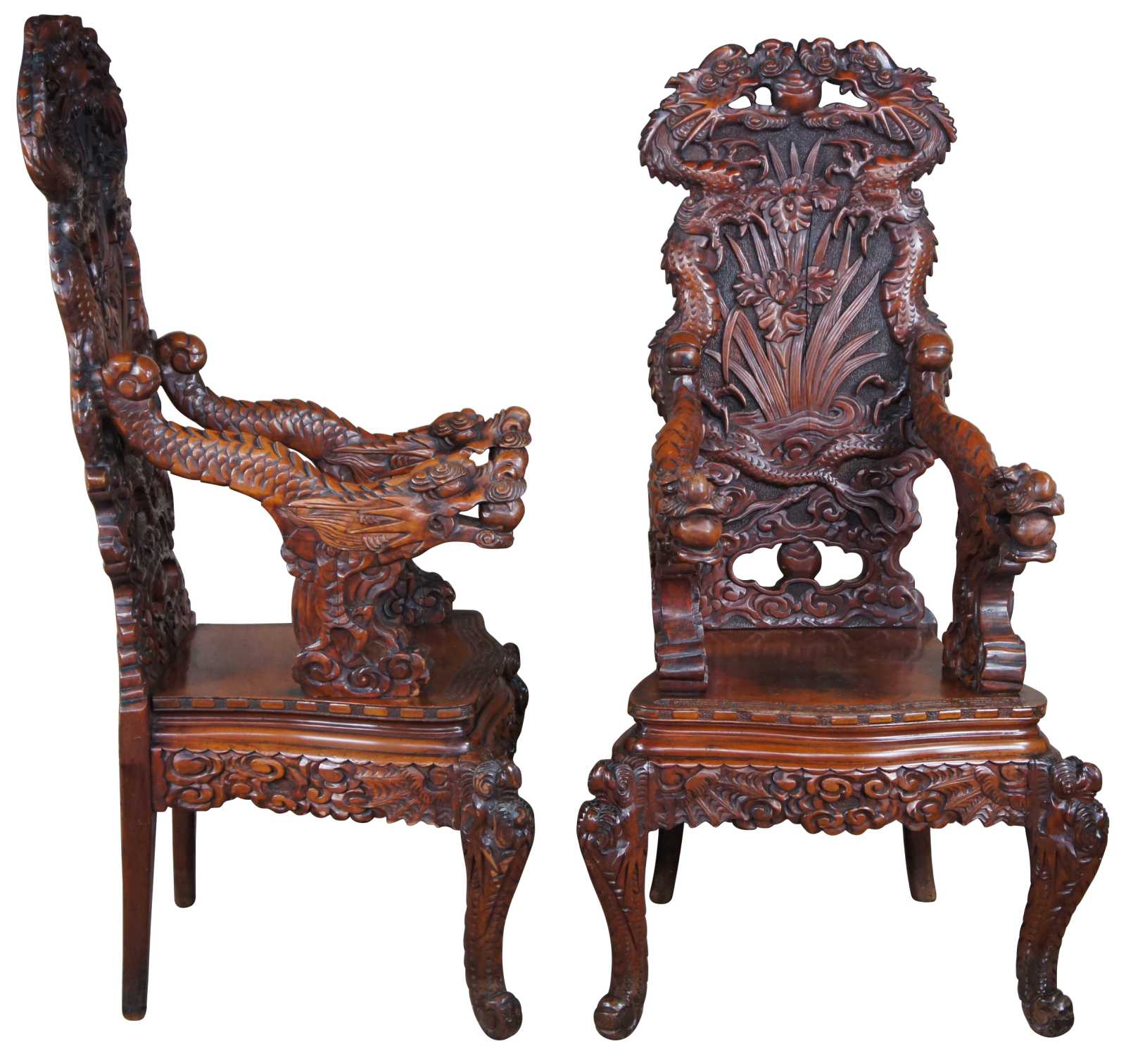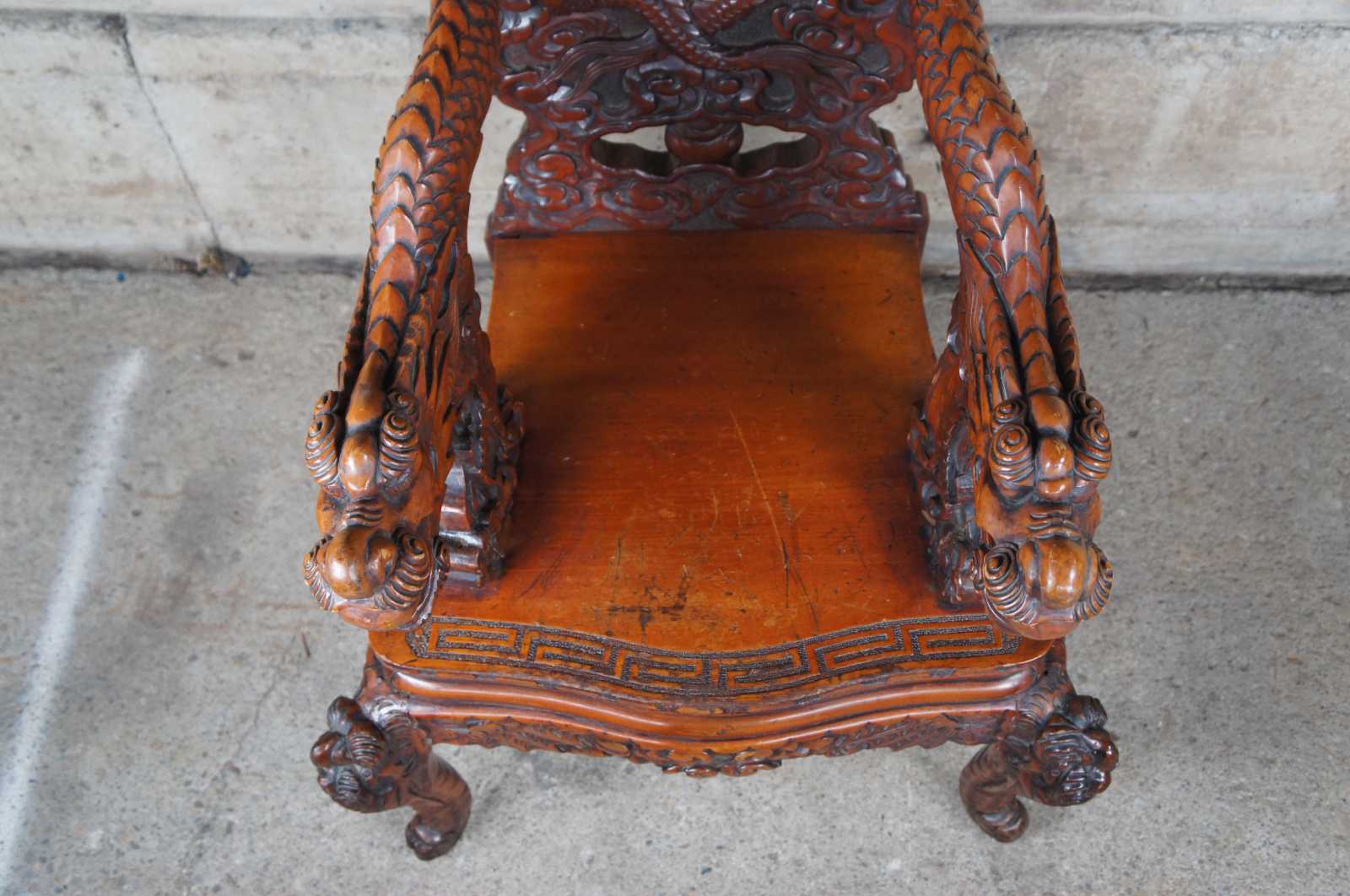 A breathtaking pair of 19th century Imperial Meiji throne chairs. Made from Elm with an elaborate and meticulous carved dragon motif. At the center are a pair of orchids flanked by sprawling dragons which can be seen sharing a ball or pearl along the crown. The pearl represents the beginning of life and are associated with spiritual energy, wisdom, prosperity, power and immortality. The dragons extend from the crown towards the shoe of the back where their tails cross amidst a field of clouds and pierced lower backing. This motif is mirrored into the arms with thick scales and gnarling mouths. This serpent design continues into the seat rest with a serpentine front featuring a Greek key carved edge. Each chair is supported by 4 legs and includes a pierced apron of winged dragons within a field of clouds. The front legs smoothly taper into a scrolled foot. An impressive yet elegant pair for any setting.