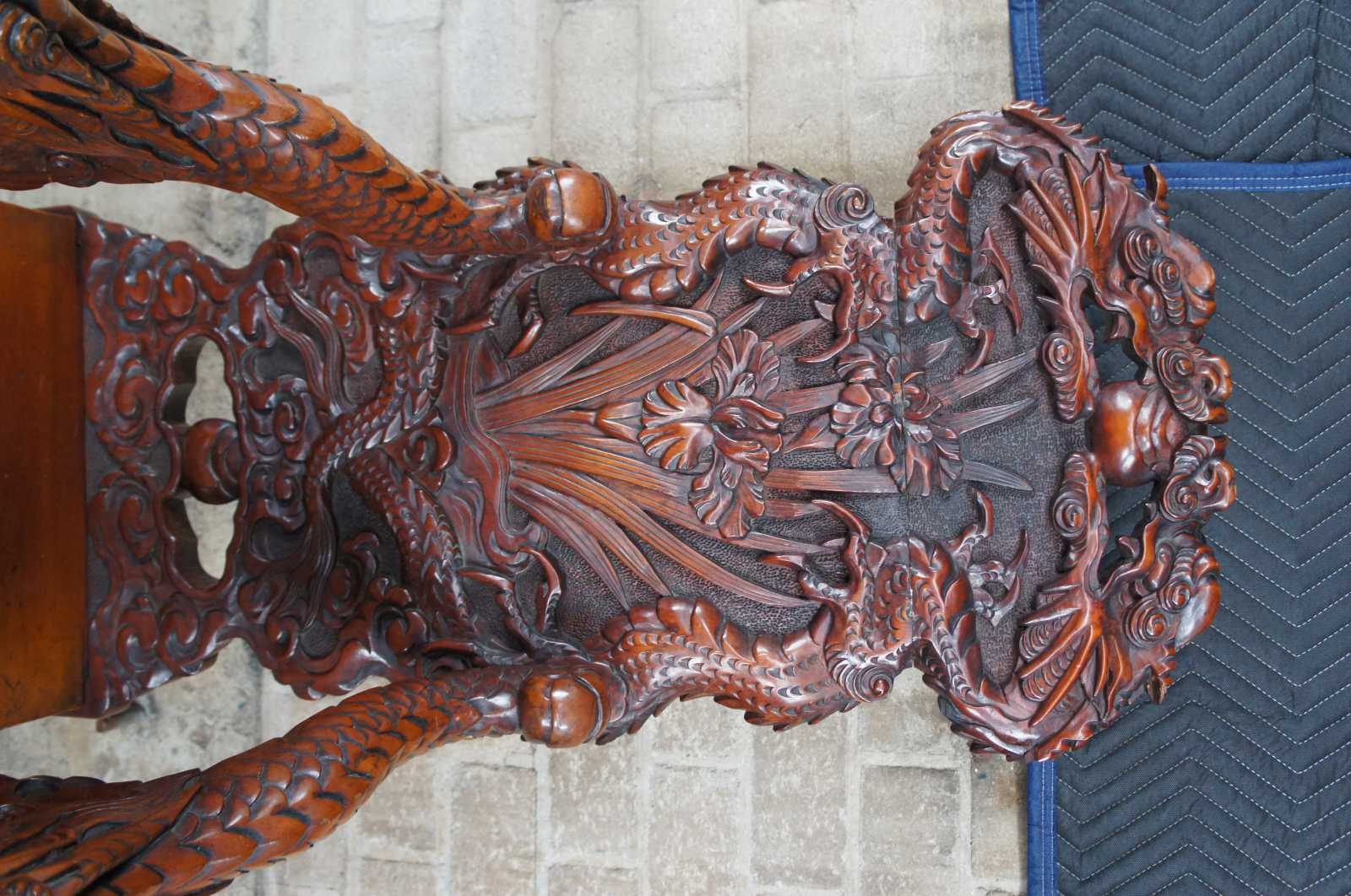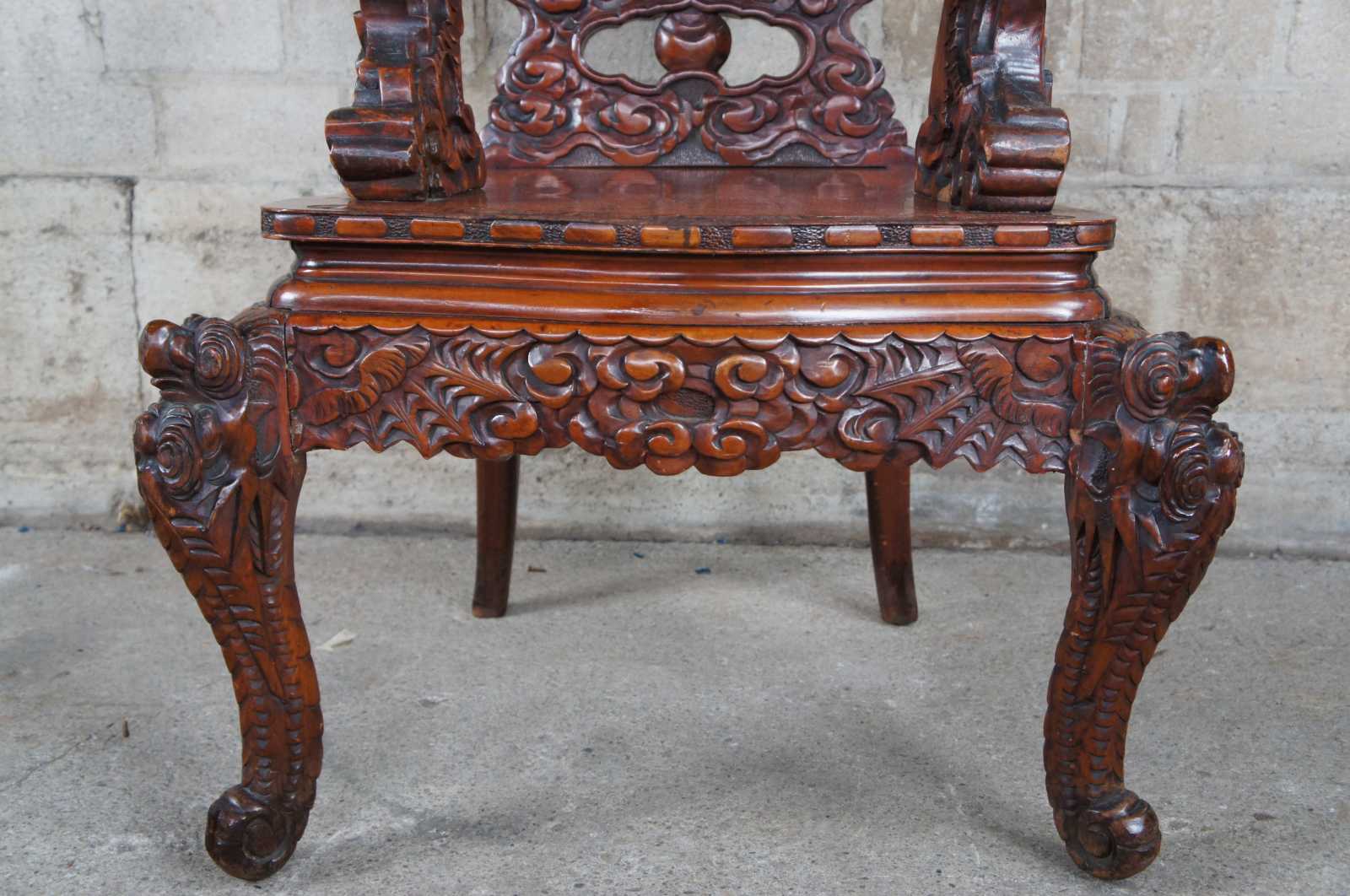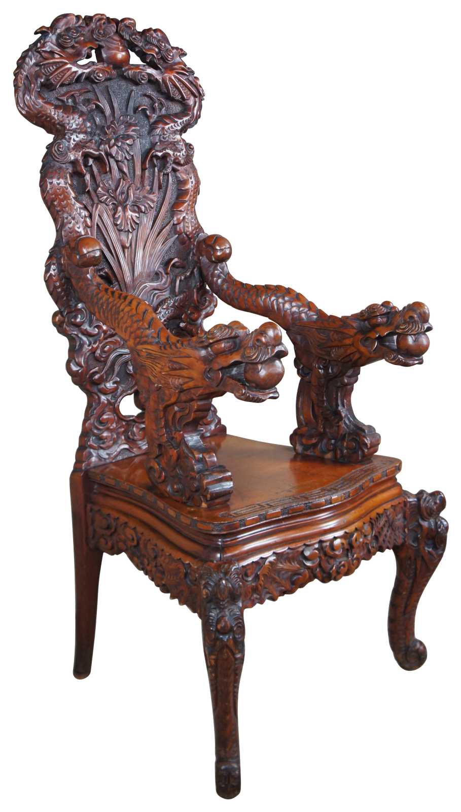 A breathtaking pair of 19th century Imperial Meiji throne chairs. Made from Elm with an elaborate and meticulous carved dragon motif. At the center are a pair of orchids flanked by sprawling dragons which can be seen sharing a ball or pearl along the crown. The pearl represents the beginning of life and are associated with spiritual energy, wisdom, prosperity, power and immortality. The dragons extend from the crown towards the shoe of the back where their tails cross amidst a field of clouds and pierced lower backing. This motif is mirrored into the arms with thick scales and gnarling mouths. This serpent design continues into the seat rest with a serpentine front featuring a Greek key carved edge. Each chair is supported by 4 legs and includes a pierced apron of winged dragons within a field of clouds. The front legs smoothly taper into a scrolled foot. An impressive yet elegant pair for any setting.