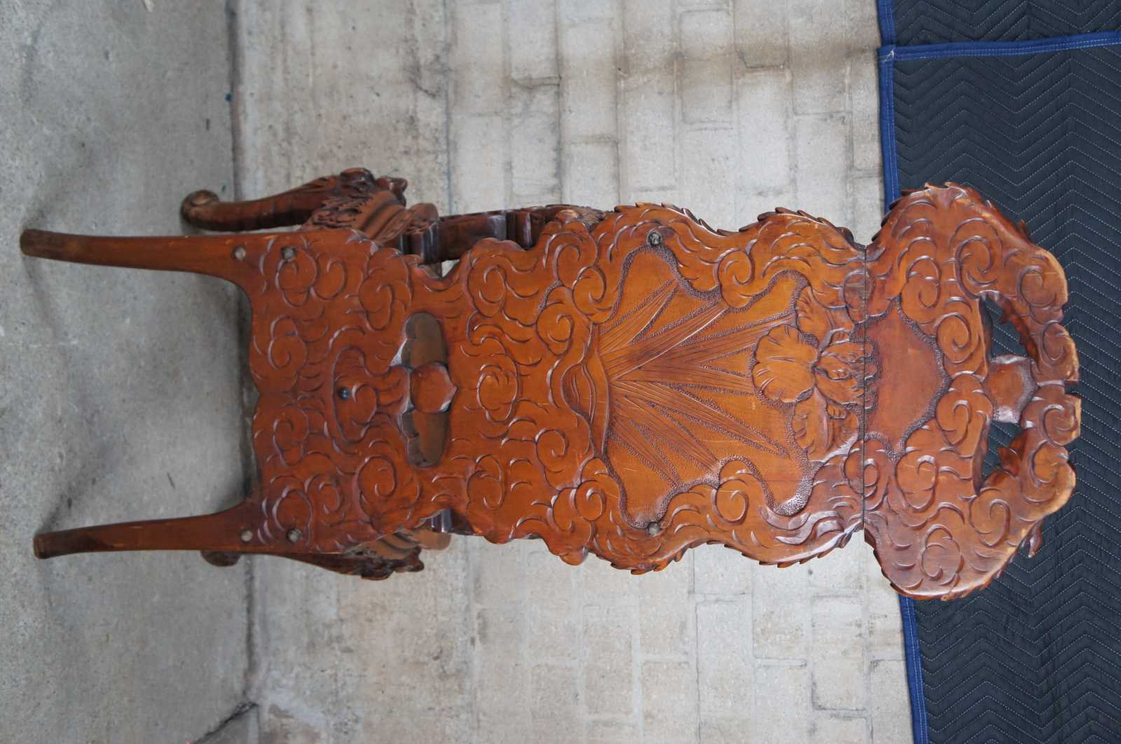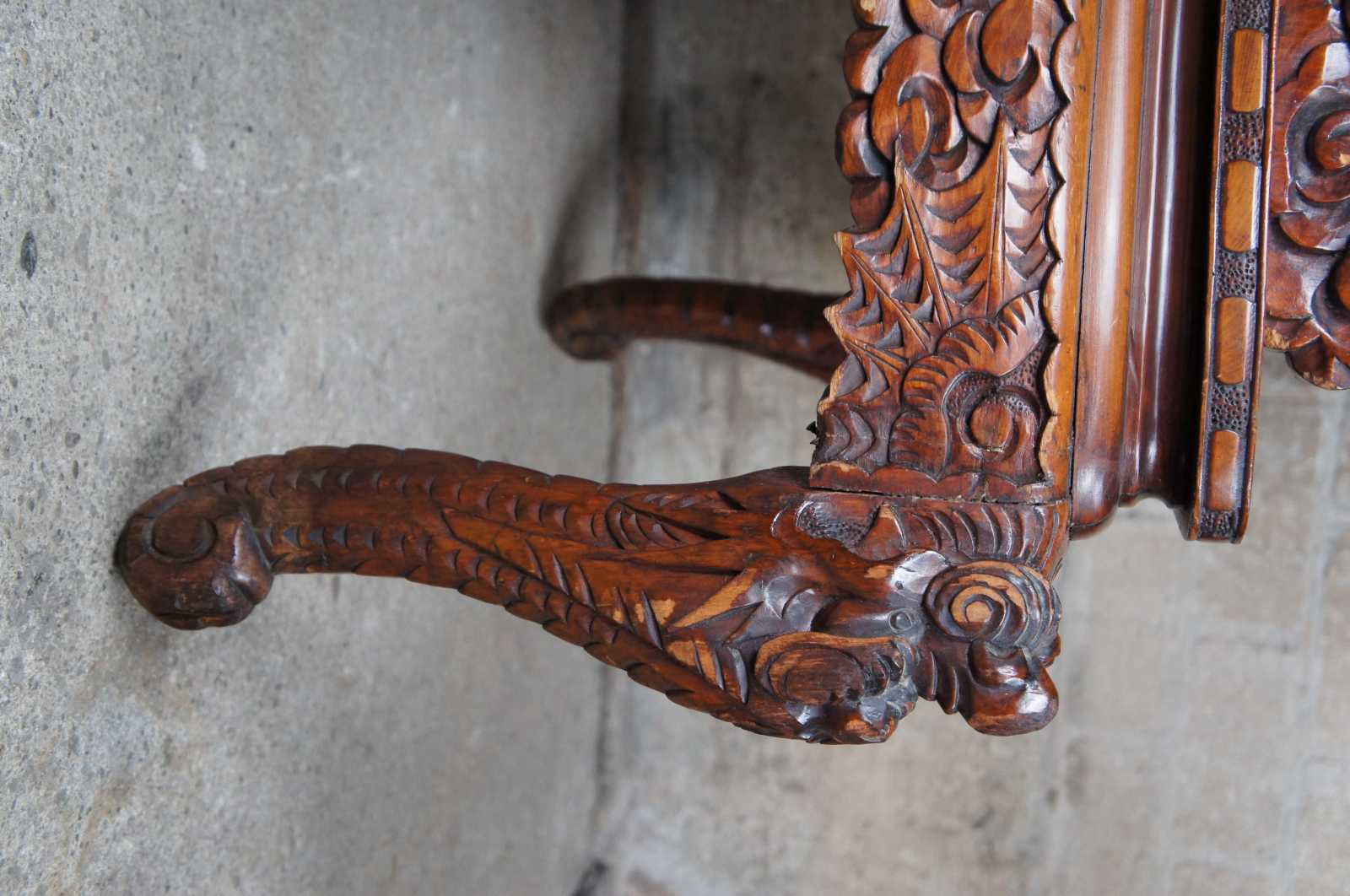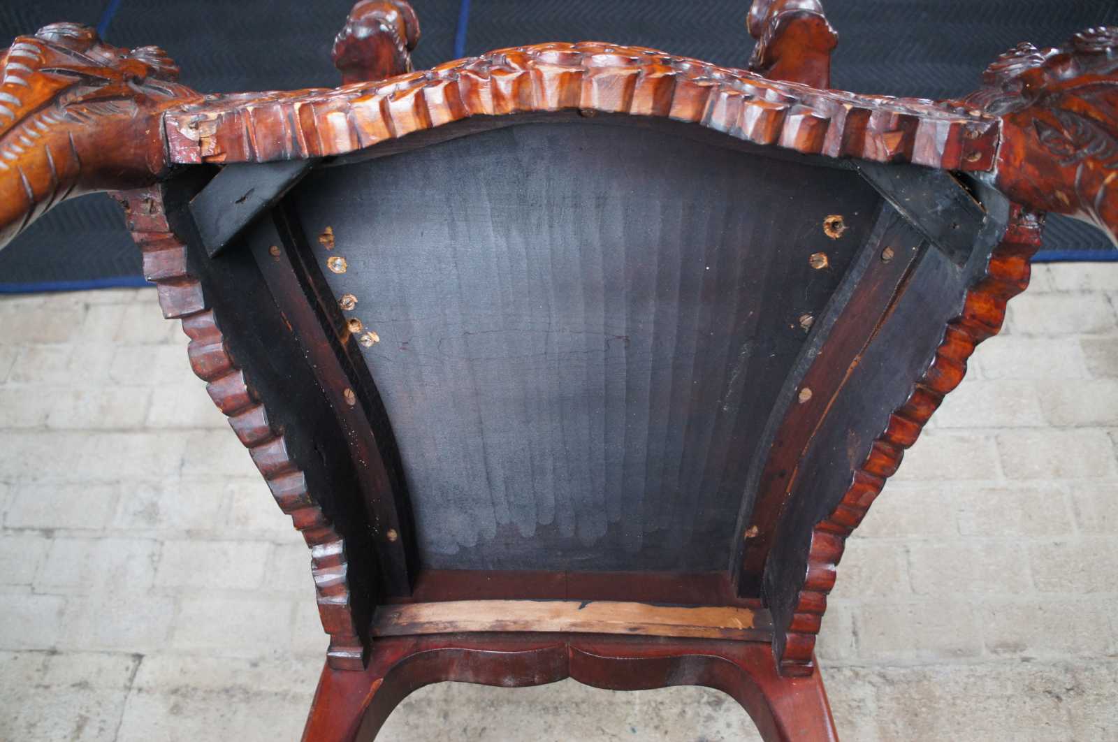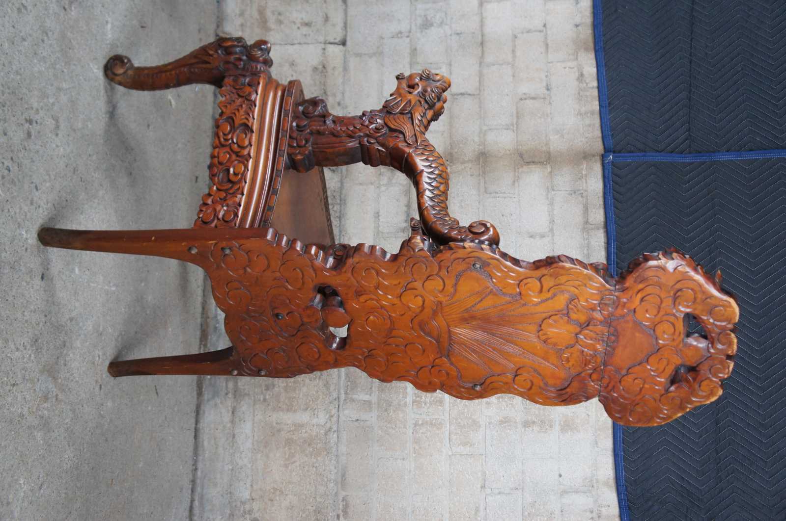 A breathtaking pair of 19th century Imperial Meiji throne chairs. Made from Elm with an elaborate and meticulous carved dragon motif. At the center are a pair of orchids flanked by sprawling dragons which can be seen sharing a ball or pearl along the crown. The pearl represents the beginning of life and are associated with spiritual energy, wisdom, prosperity, power and immortality. The dragons extend from the crown towards the shoe of the back where their tails cross amidst a field of clouds and pierced lower backing. This motif is mirrored into the arms with thick scales and gnarling mouths. This serpent design continues into the seat rest with a serpentine front featuring a Greek key carved edge. Each chair is supported by 4 legs and includes a pierced apron of winged dragons within a field of clouds. The front legs smoothly taper into a scrolled foot. An impressive yet elegant pair for any setting.