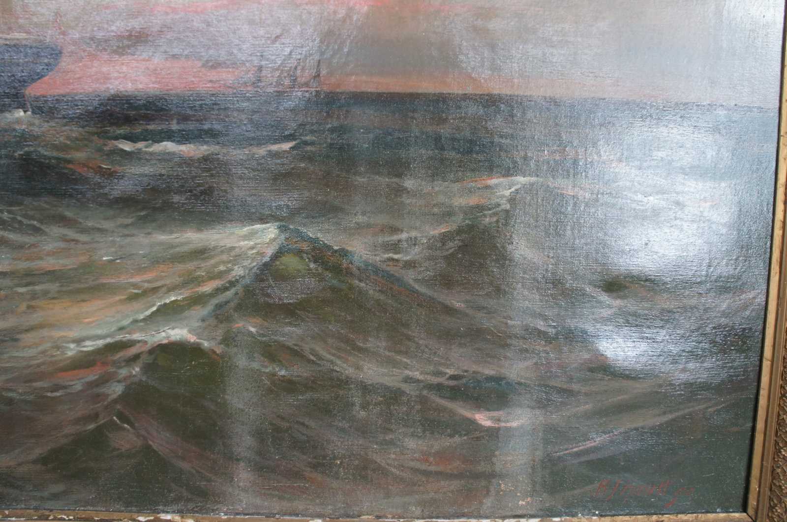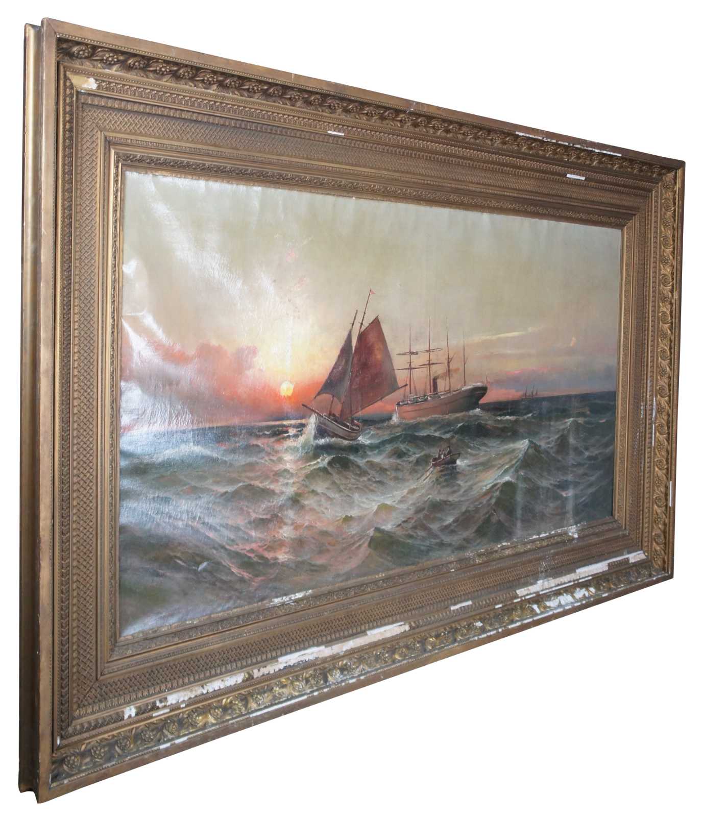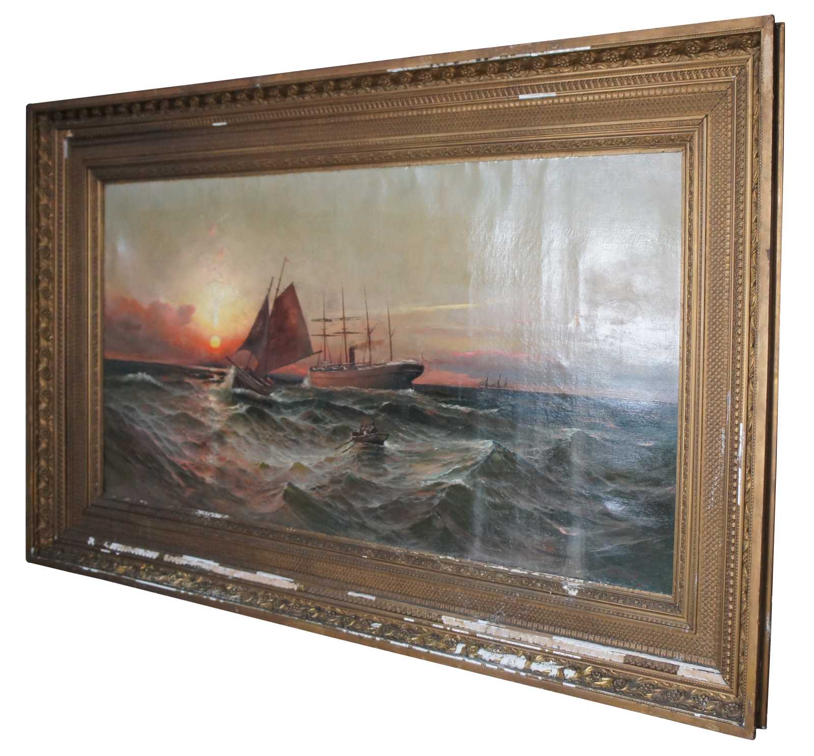 Monumental antique 1890 nautical maritime seascape oil painting on canvas by B.J. Harnett. The scene features a choppy ocean with sailboats / steamboat / rowboat and figures under a sunset. Signed Lower right. Features an exquisite 1880s frame with layered gesso including lattice, acanthus, beading and foliate designs.