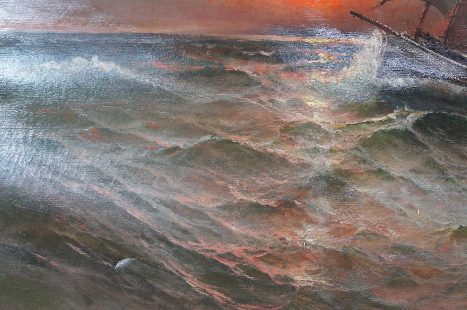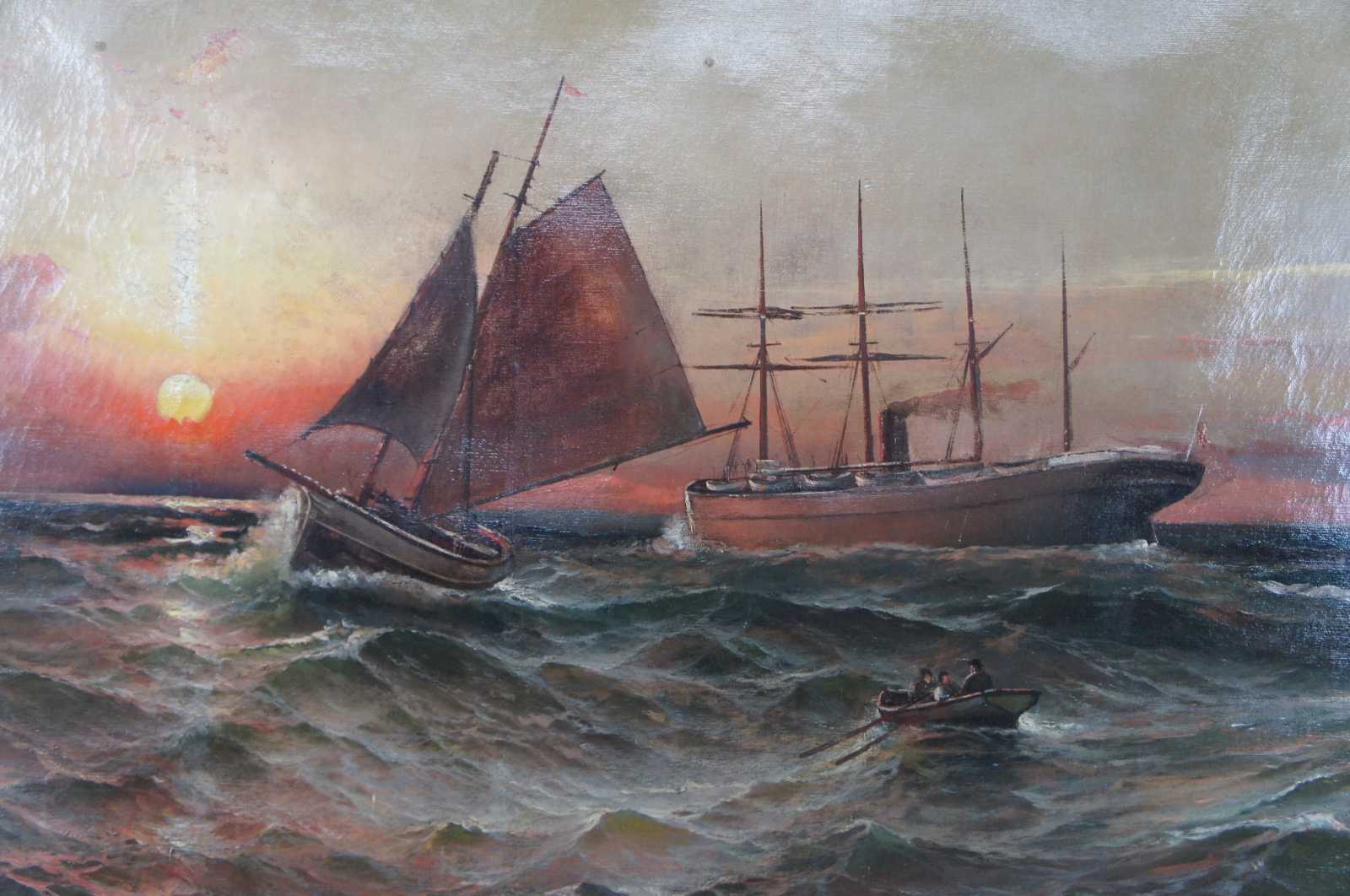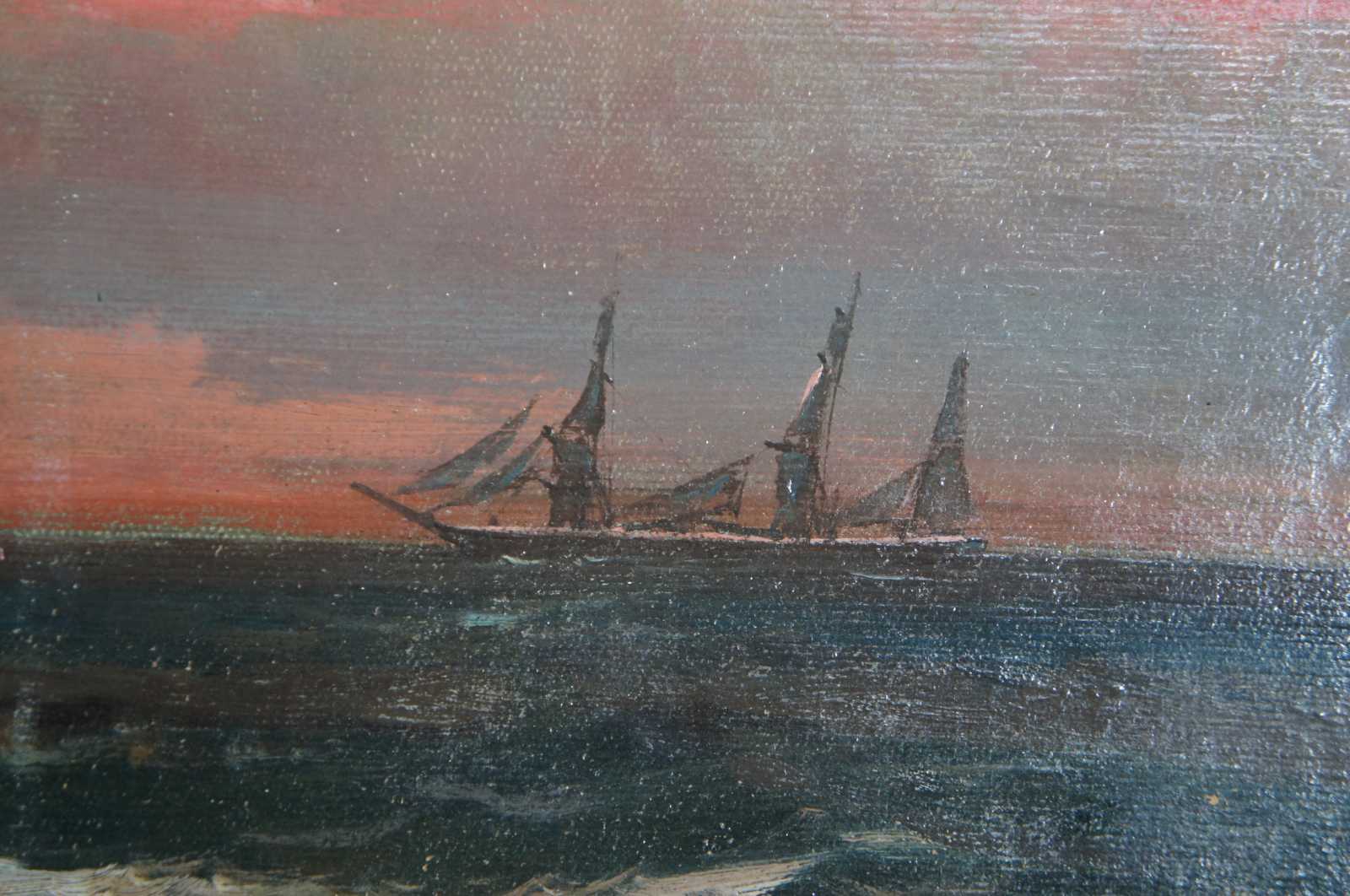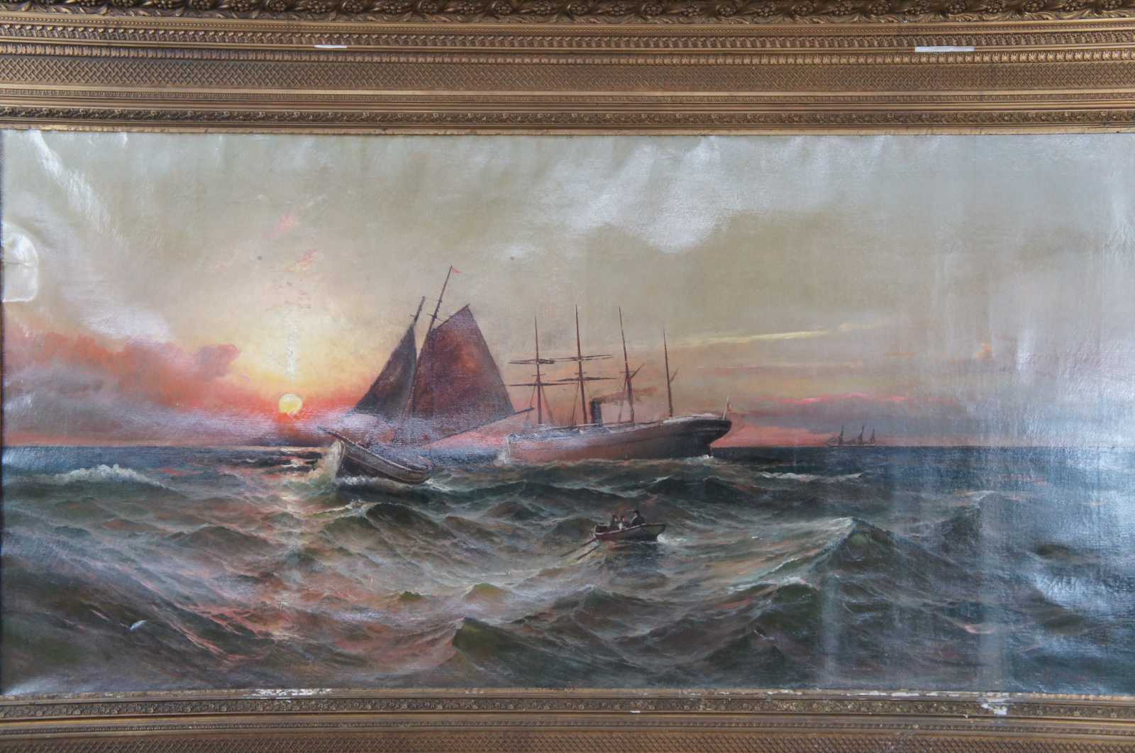 Monumental antique 1890 nautical maritime seascape oil painting on canvas by B.J. Harnett. The scene features a choppy ocean with sailboats / steamboat / rowboat and figures under a sunset. Signed Lower right. Features an exquisite 1880s frame with layered gesso including lattice, acanthus, beading and foliate designs.