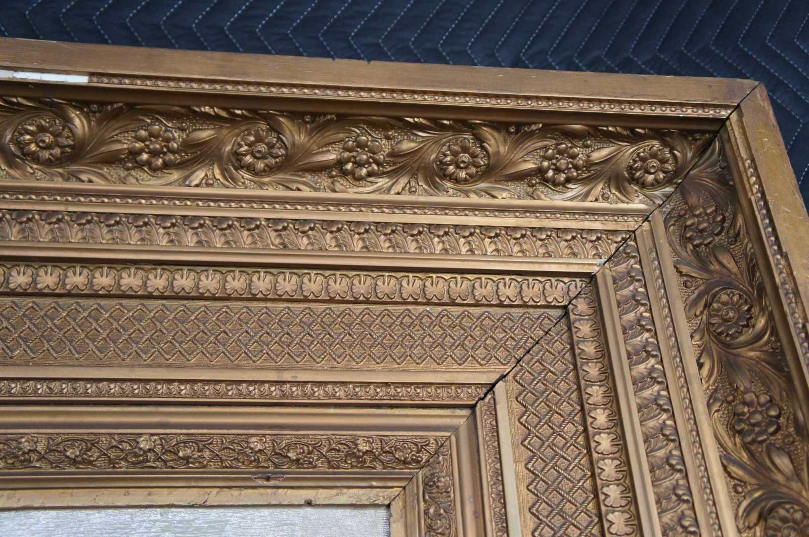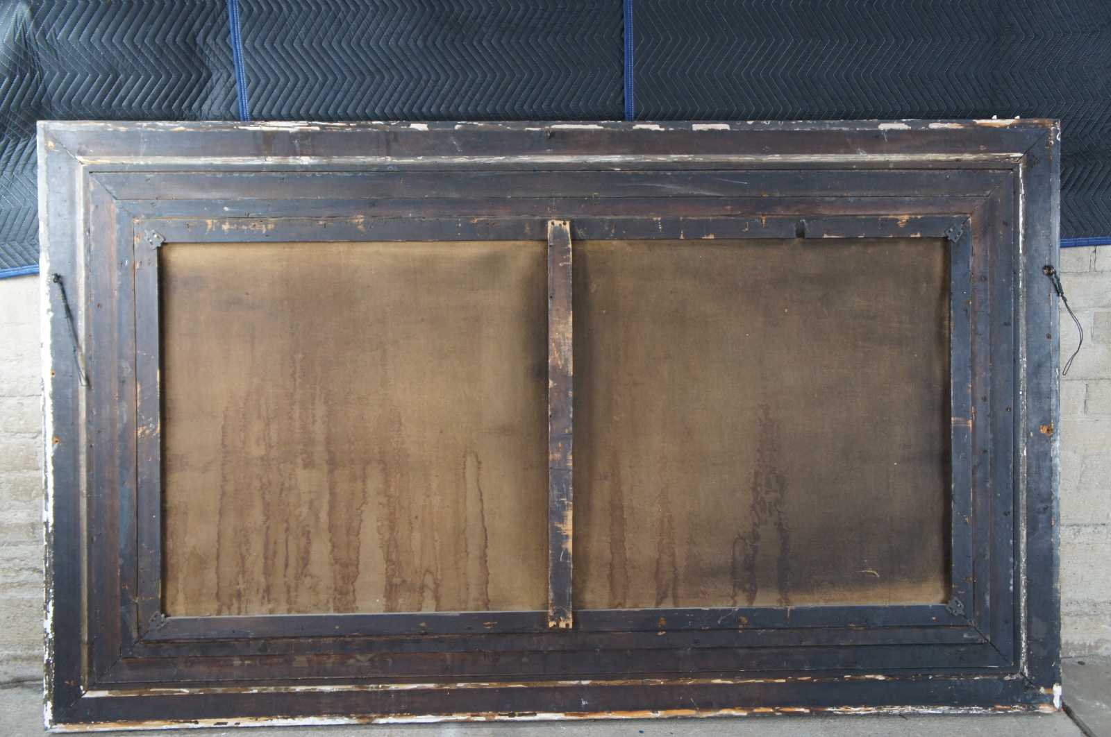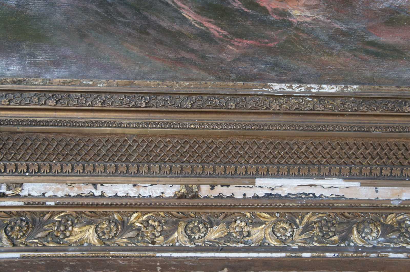 Wear and distressing commensurate with age, water / moisture damage / paint loss, puncture / rippling to canvas, missing gesso / loss to frame.