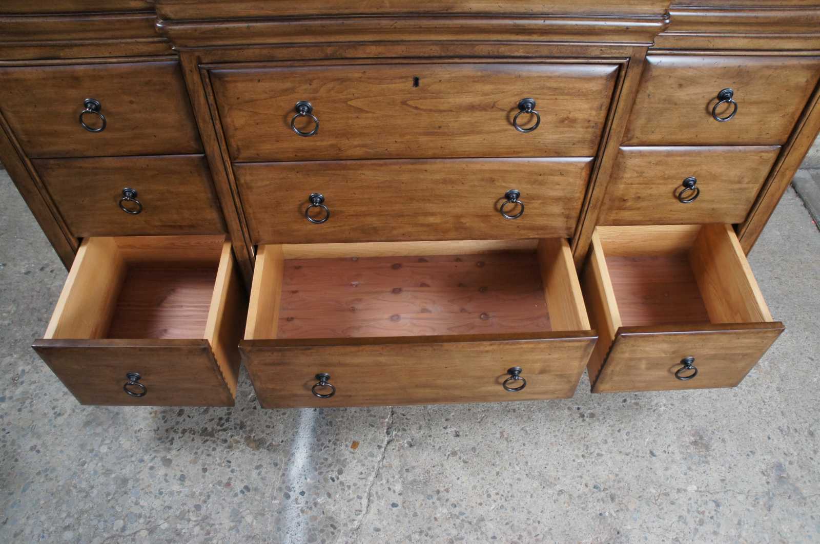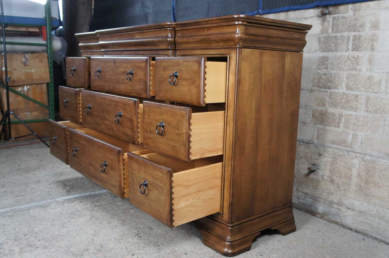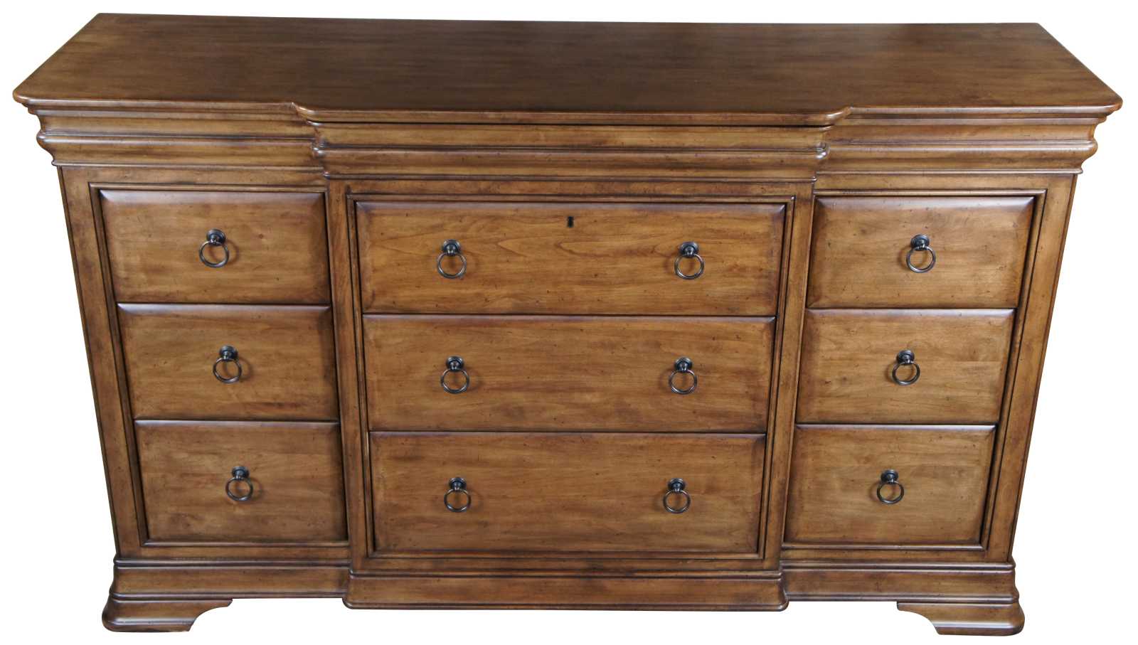 New Lou 12 Drawer Dresser by Pennsylvania House & Universal. Drawing inspiration from Louis Phillipe styling. Crafted of solid alder in a lightly distressed, distinctly brown finish with graceful lines and modern sensibility. Features nine dovetailed drawers with lower cedar drawers. Top left drawer has drop down front for audio player or cable box storage. Includes 3 hidden felt lined cornice drawers. SKU 1020591, Cognac Finish