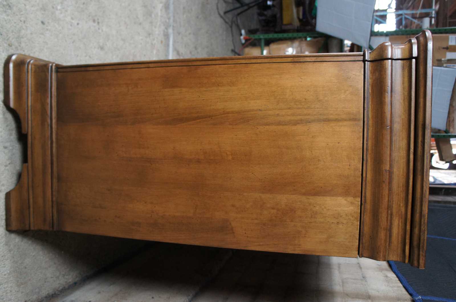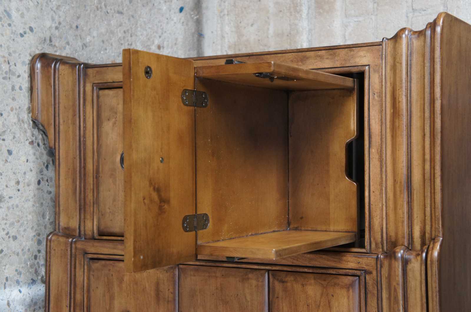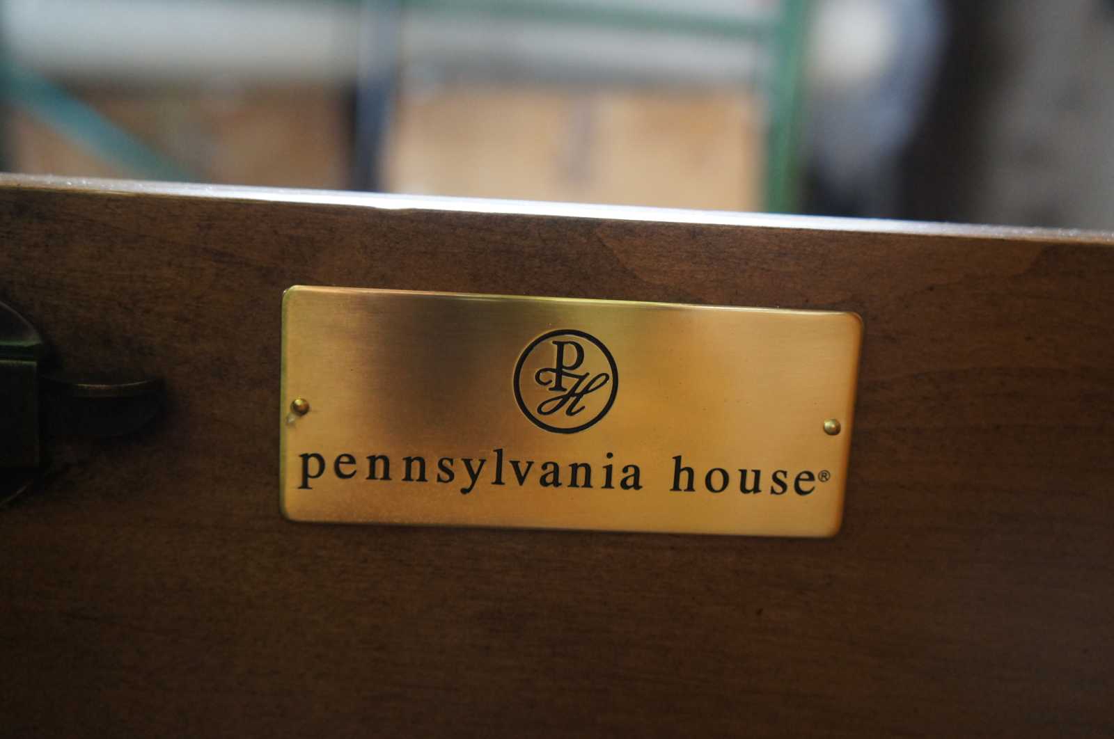 New Lou 12 Drawer Dresser by Pennsylvania House & Universal. Drawing inspiration from Louis Phillipe styling. Crafted of solid alder in a lightly distressed, distinctly brown finish with graceful lines and modern sensibility. Features nine dovetailed drawers with lower cedar drawers. Top left drawer has drop down front for audio player or cable box storage. Includes 3 hidden felt lined cornice drawers. SKU 1020591, Cognac Finish