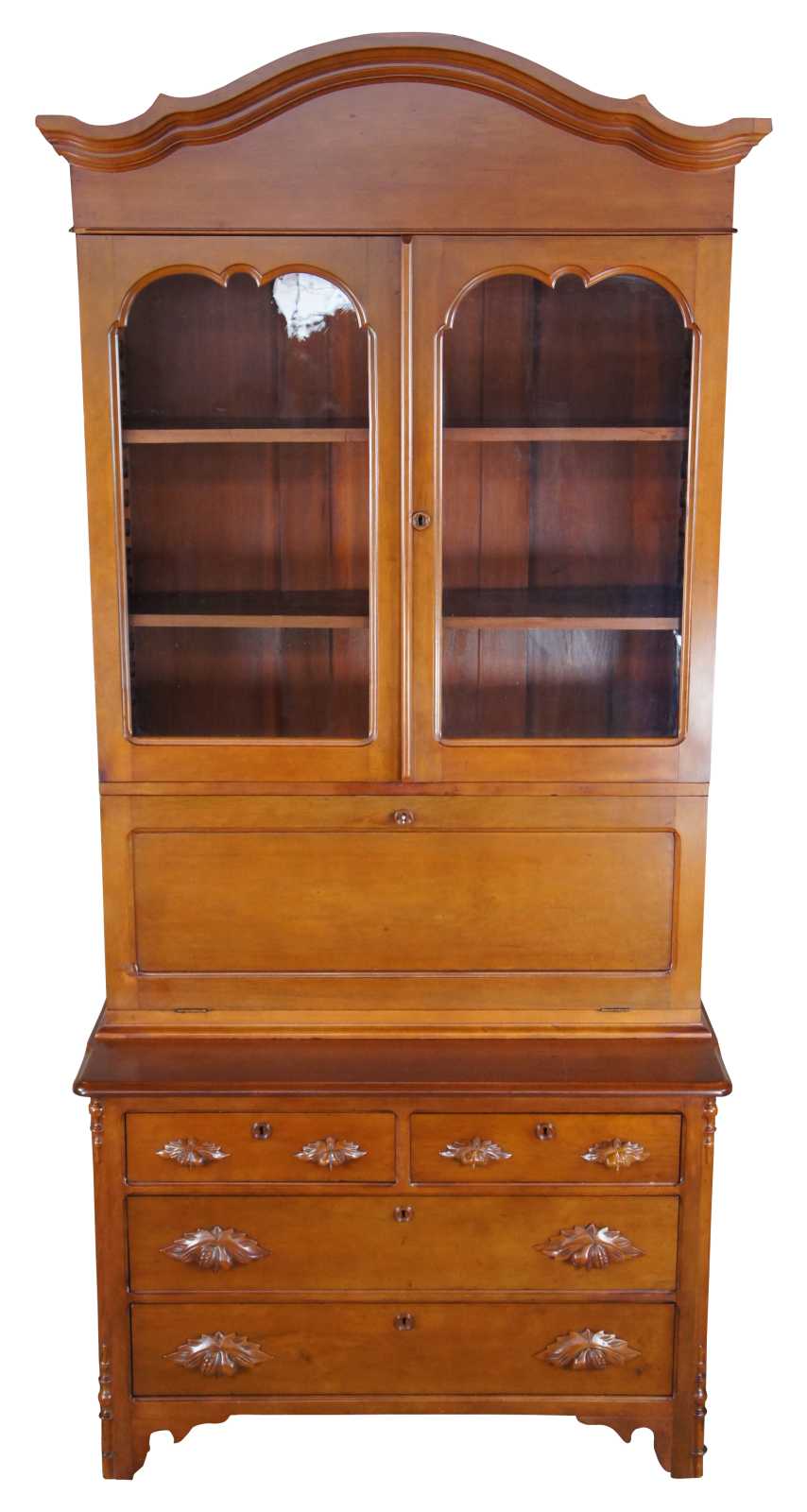 Antique American Victorian fall/ drop front secretary desk, bookcase, hutch and curio. Made of solid cherry featuring rectangular form with upper bookcase curio that retains original wavy glass, central drop front secretary desk with multiple divided storage areas , cubbies and a serpentine crown. Lower four drawer chest includes 2 over 2 design, hand dovetailing, chamfered edges with quarter cut spindles and carved fruit and nut pulls.