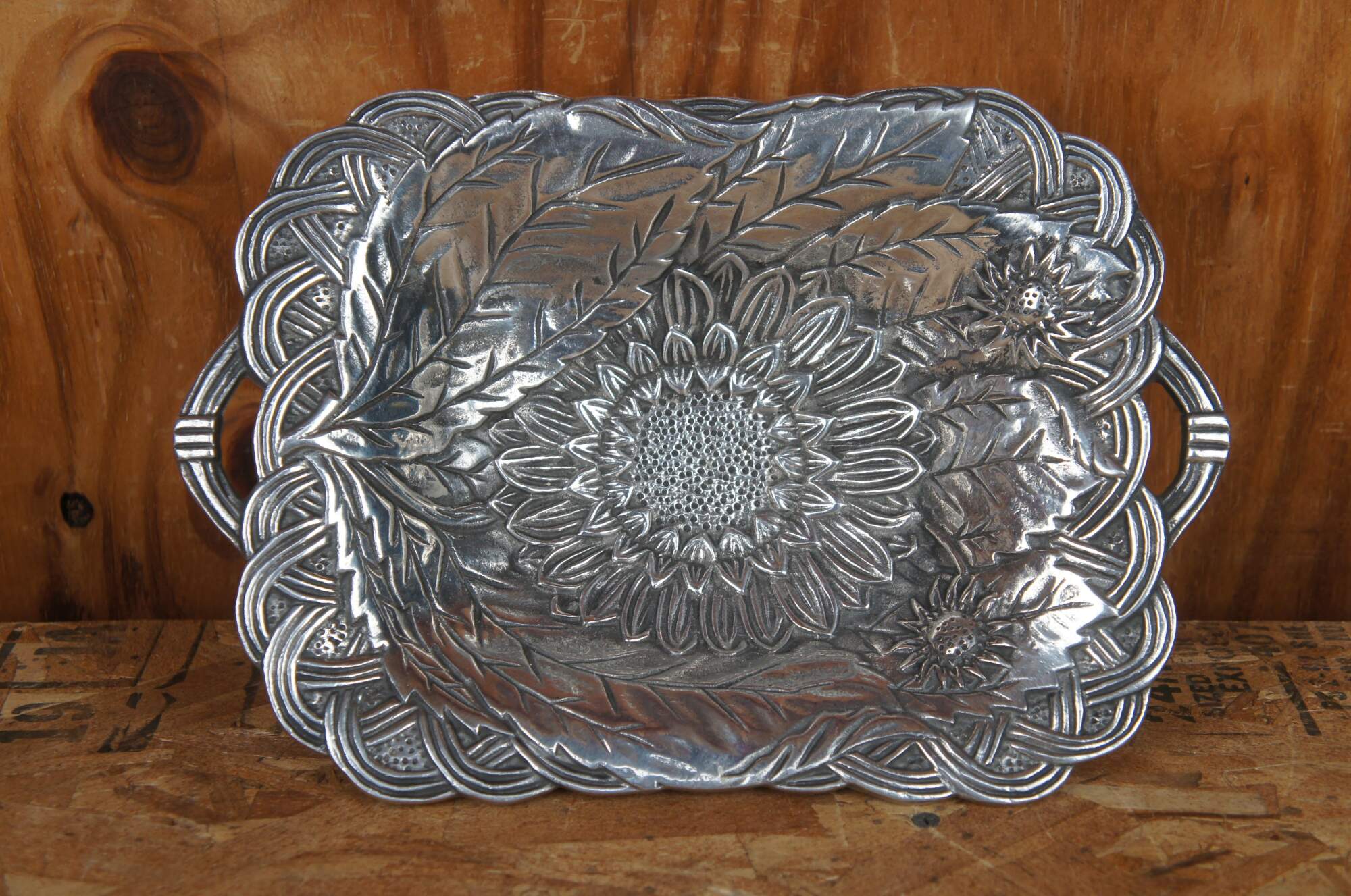 1983 vintage The Haldon Group cast aluminum footed centerpiece bowl or compote featuring low relief floral Sunflower design with scalloped basket weave edge and handles.