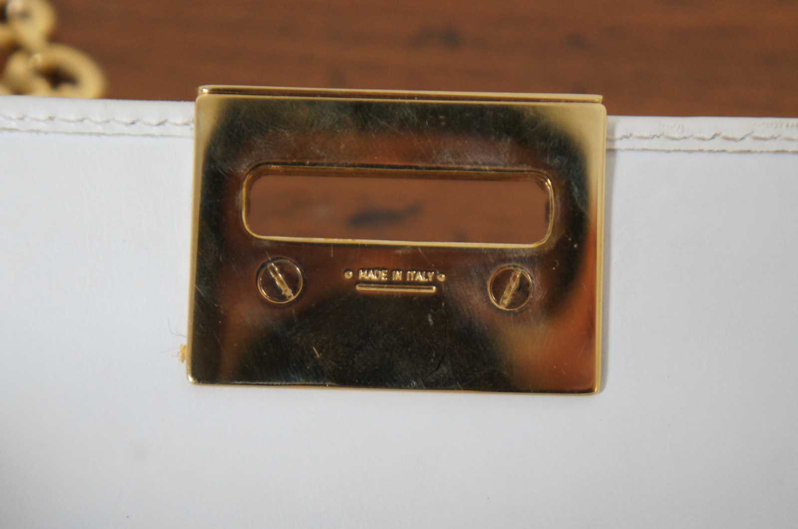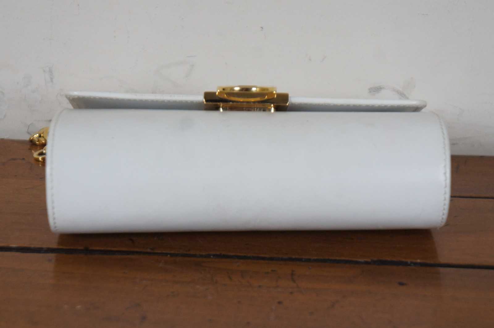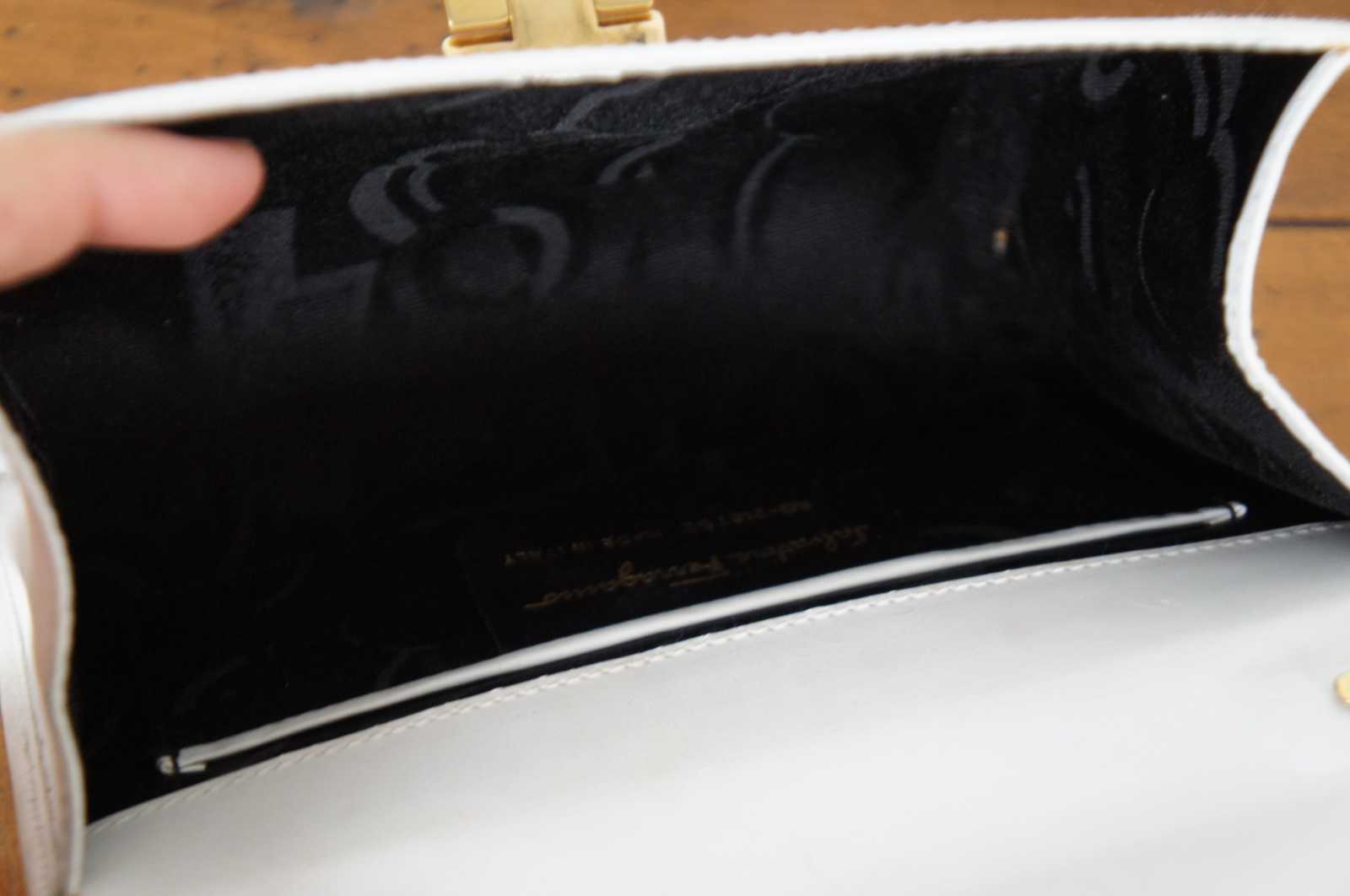 Vintage Salvatore Ferragamo, white Epsom leather crossbody purse or clutch on a gold tone chain, number AQ-21 8752, made in Italy with buckle closure, and black interior subtly patterned with the Gancini monogram.