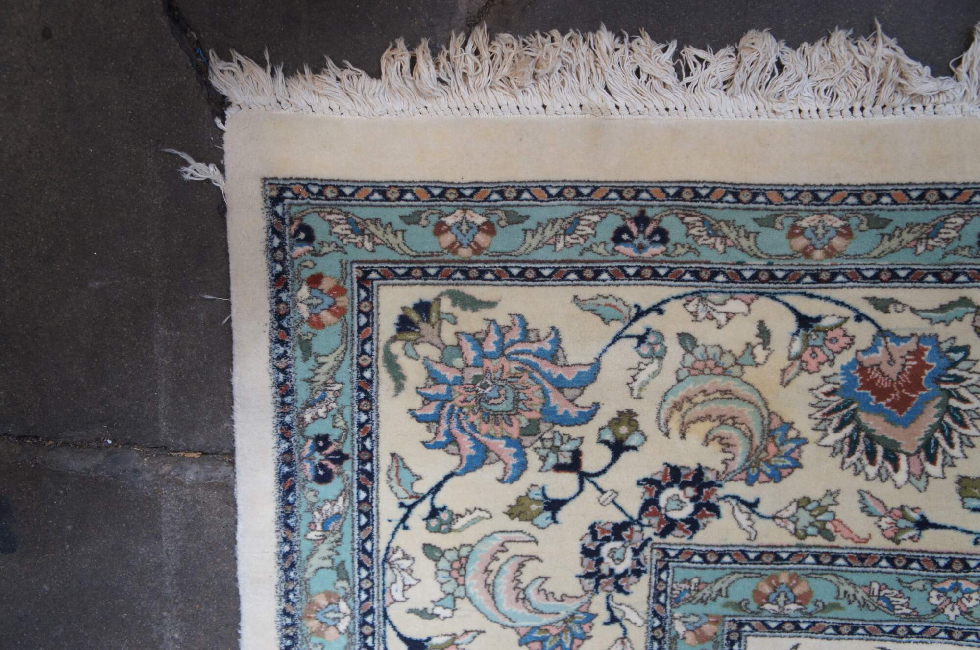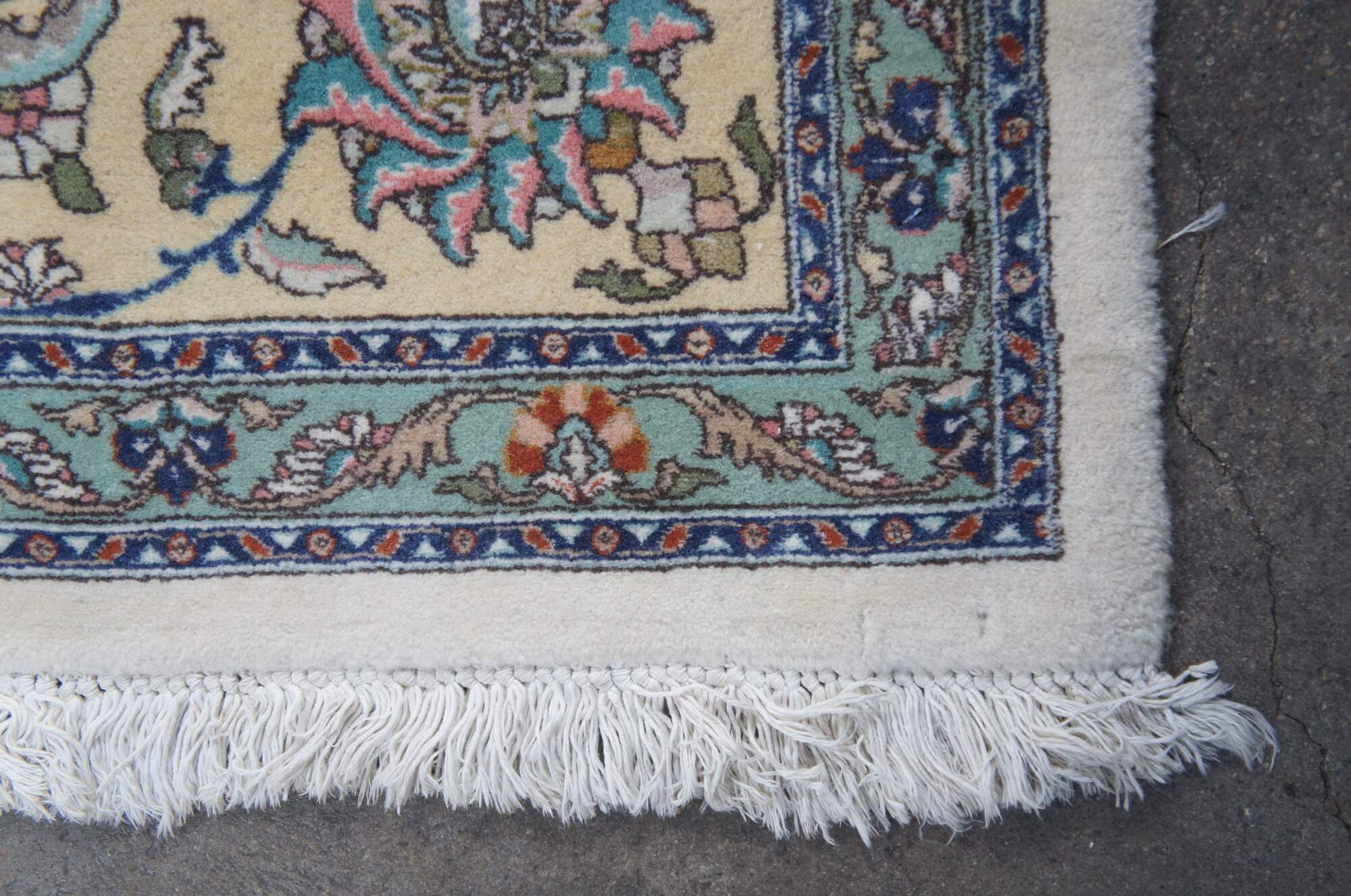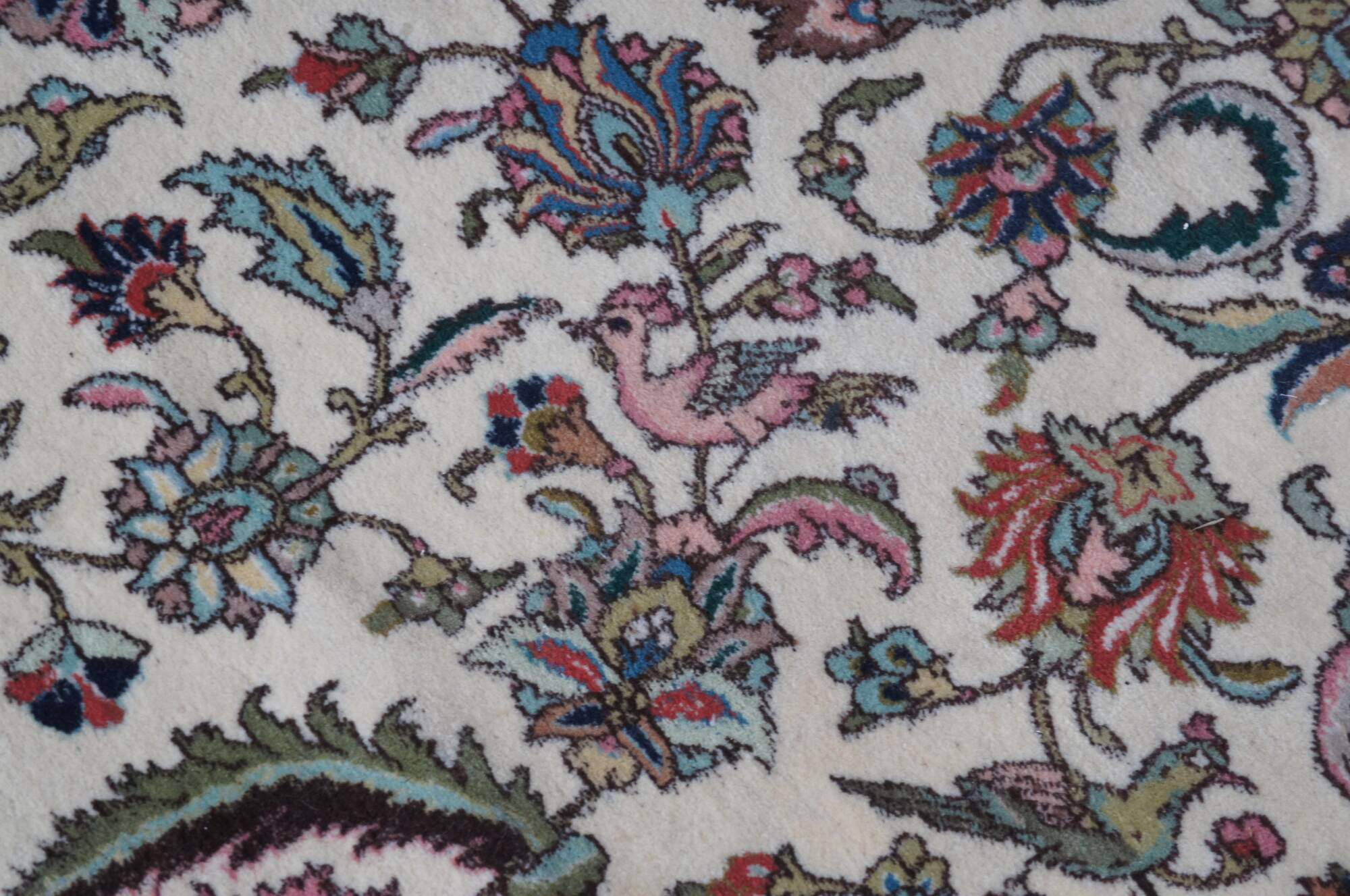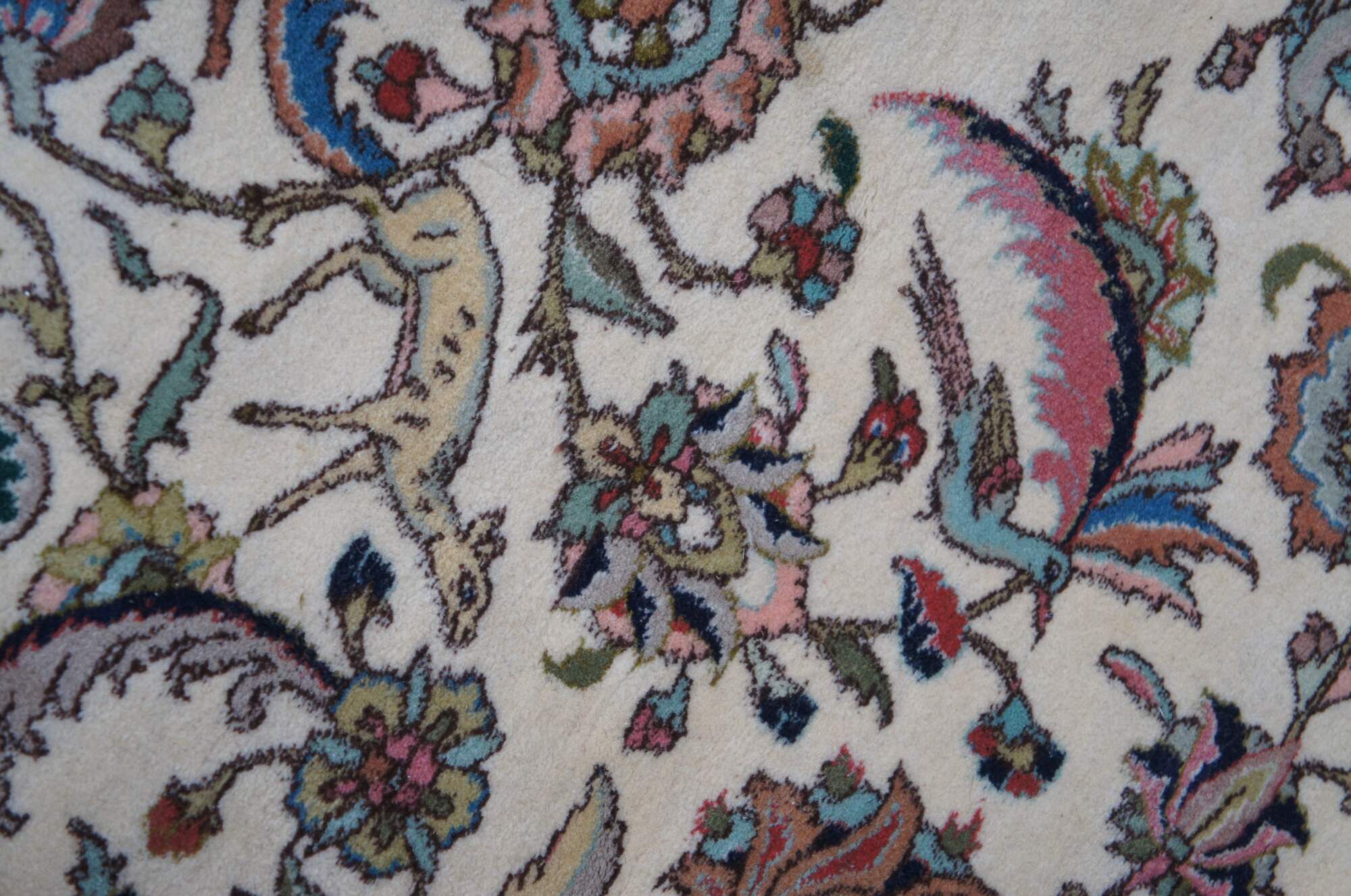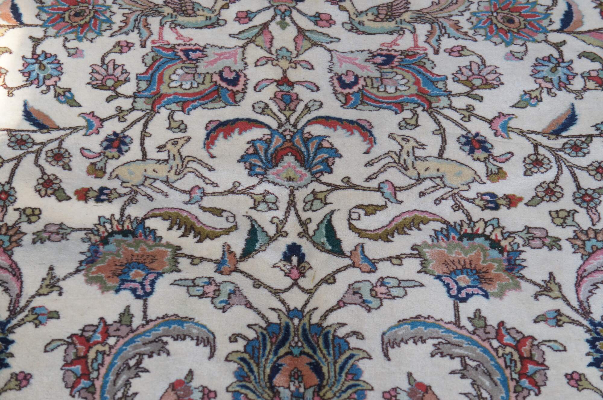 A large and impressive 100% wool pile area rug featuring a floral scene with animals (Deer, Birds) on a beige field with pinks, greens, browns, reds, tans, blues and greens.