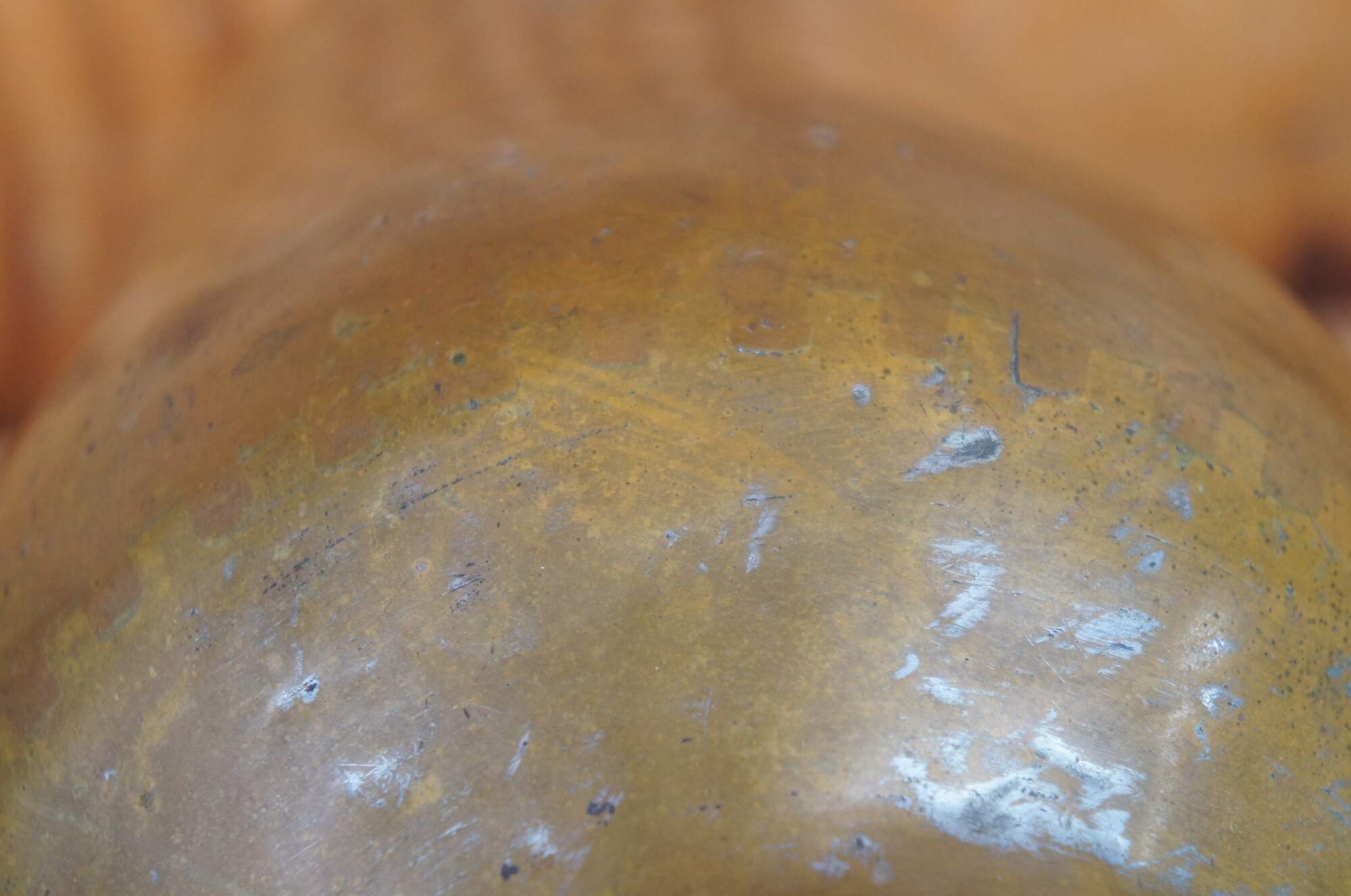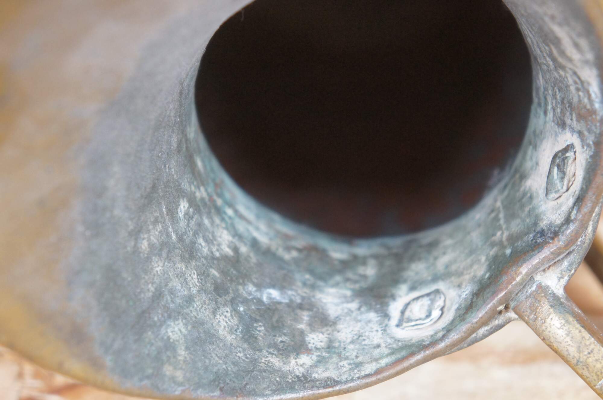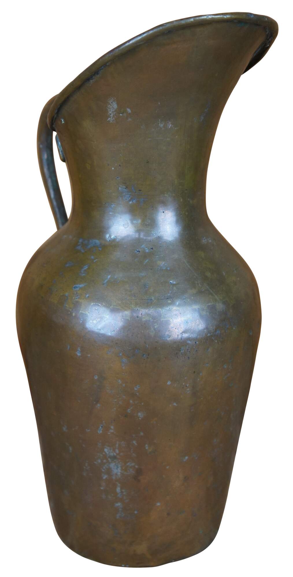 Antique hammered copper pitcher featuring a large handle and sloped spout with dovetailed joinery.