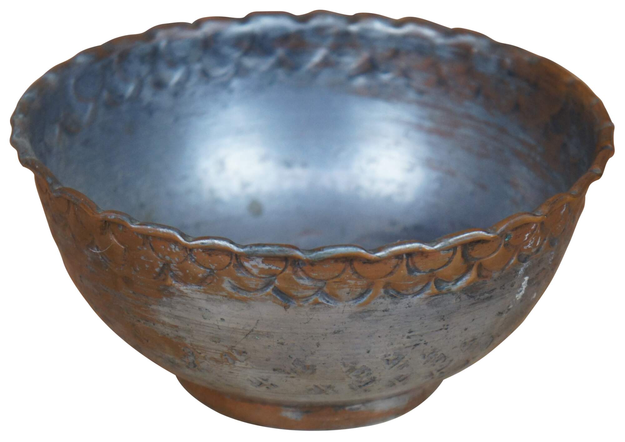 Vintage hammered and engraved copper bowl or compote featuring a scalloped rim with etched scale design, footed base, marked Made in Egypt.