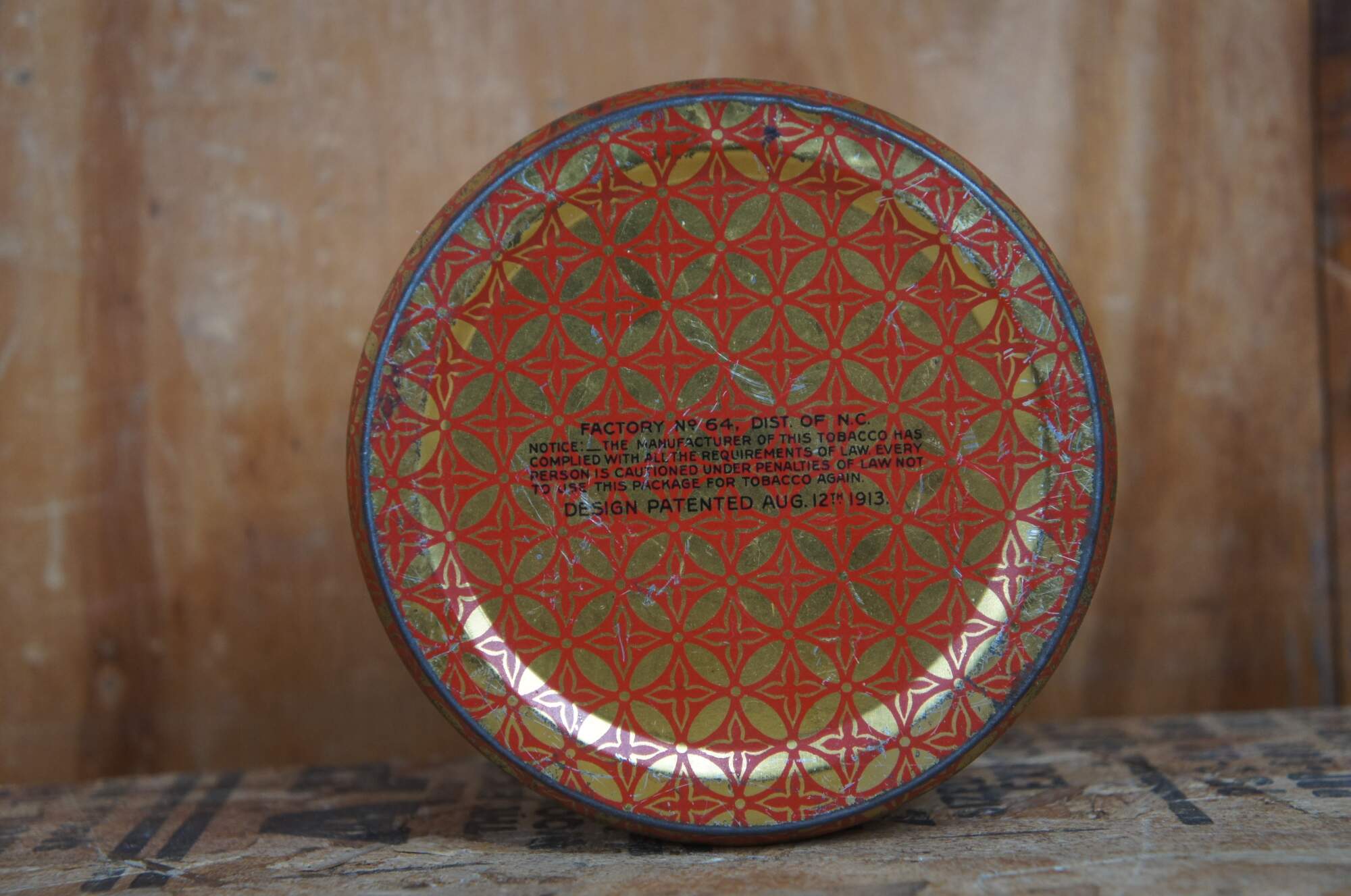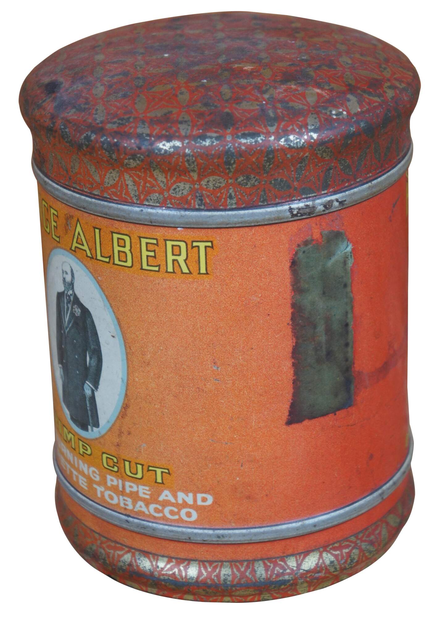 Antique Prince Albert ad can, made of tin, featuring a domed top with the slogan Crimp Cut Long Burning Pipe and Cigarette Tobacco.