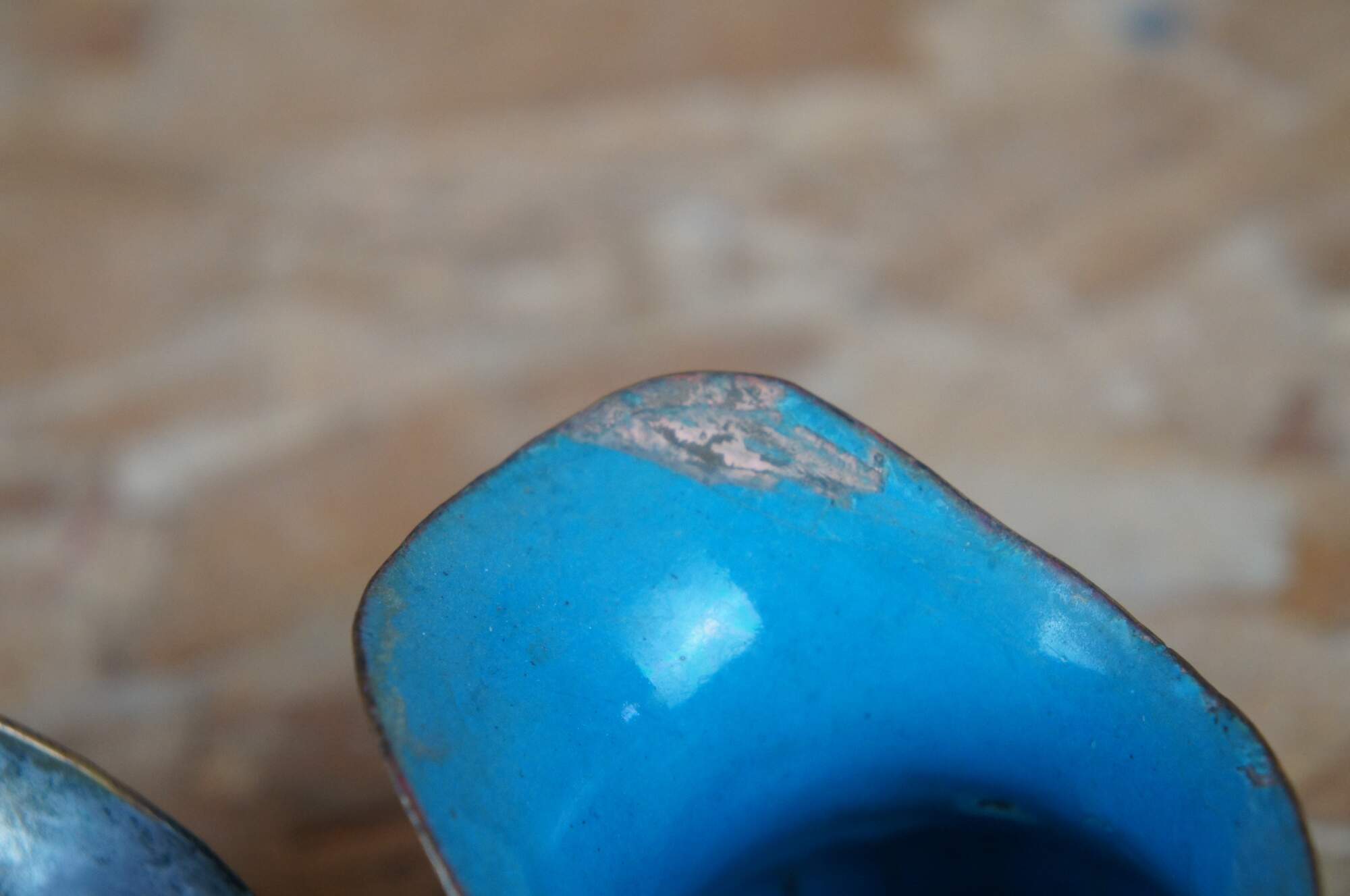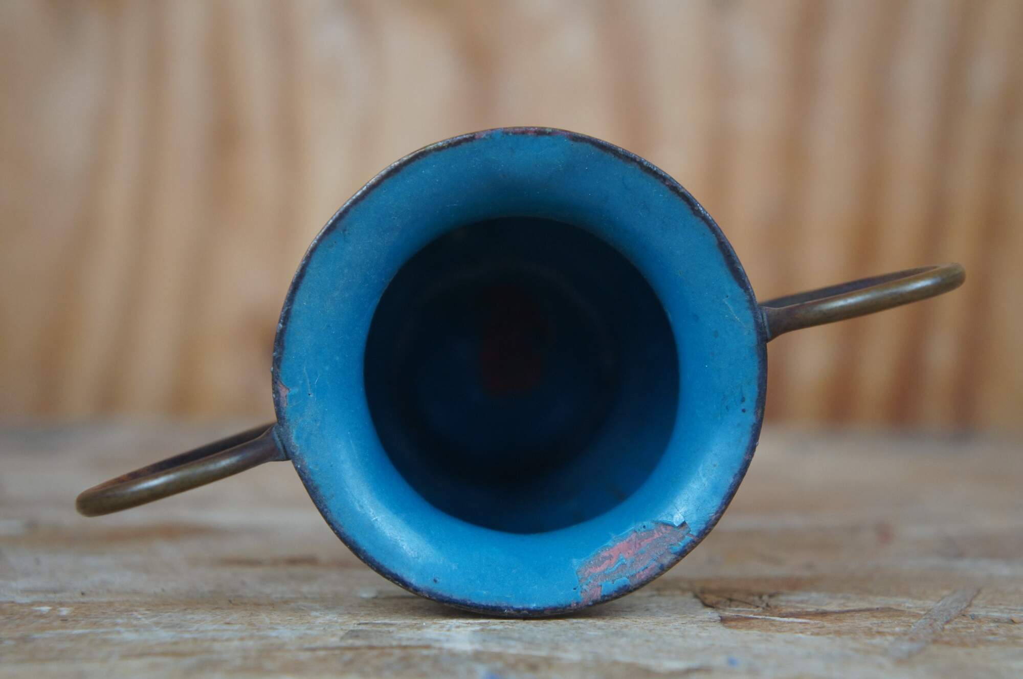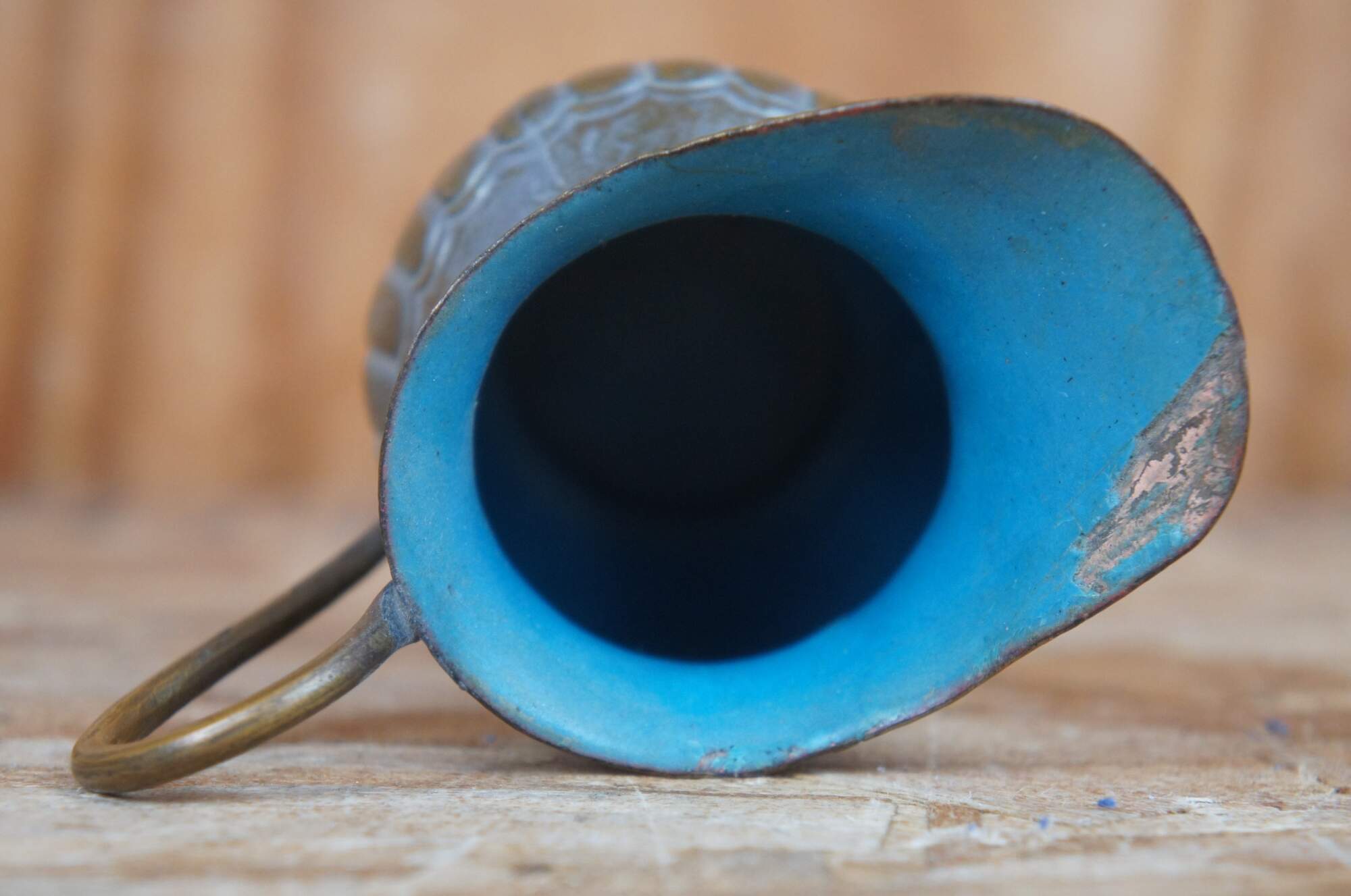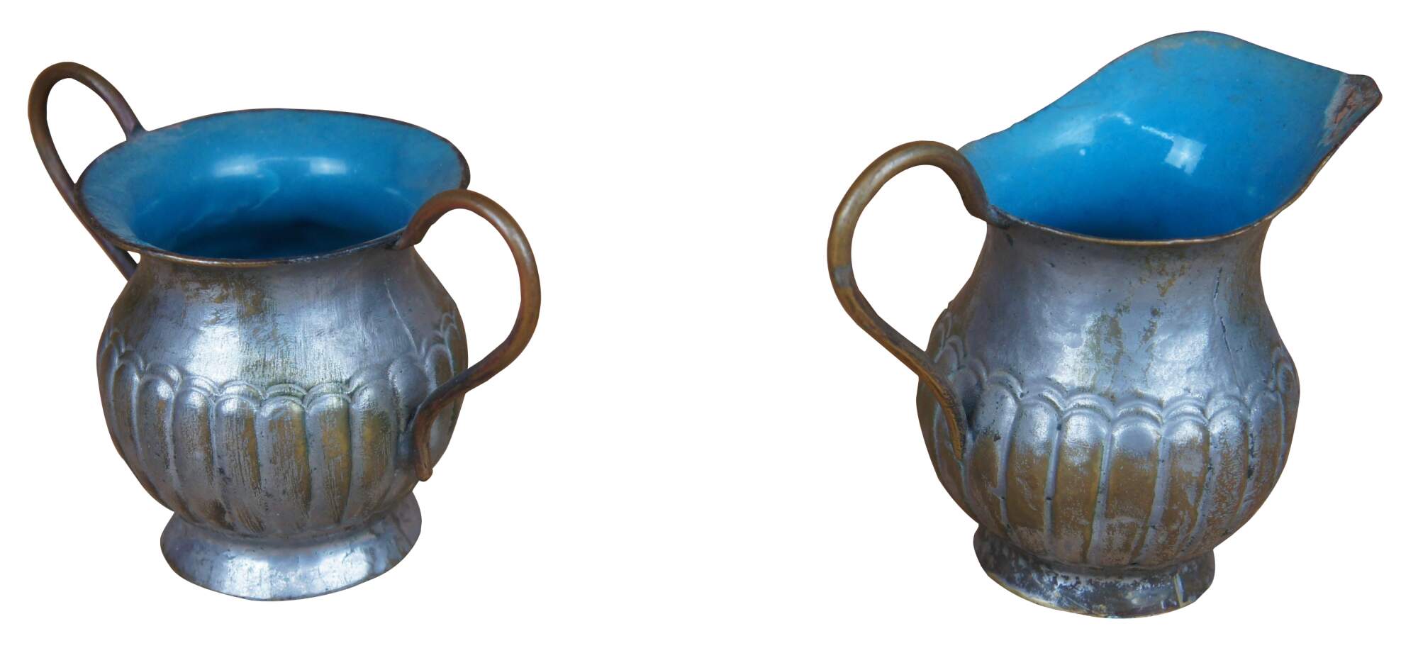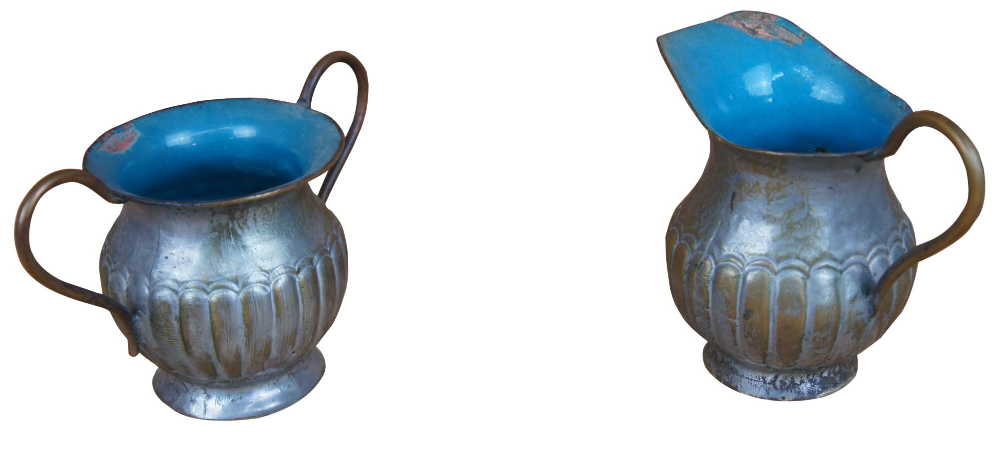 Antique cream pitcher and sugar bowl set made of copper and lined with brilliant blue enamel. Made in China.